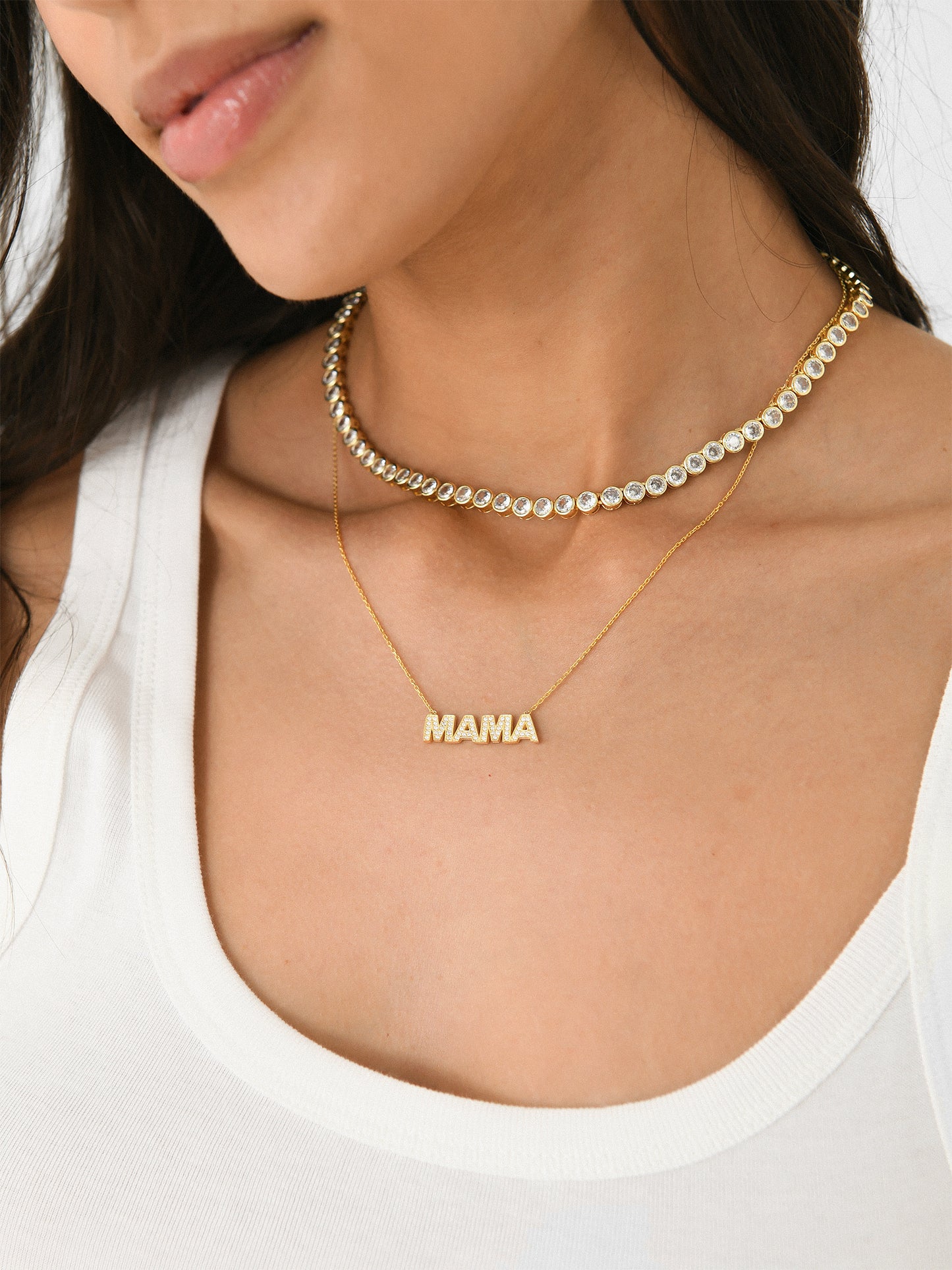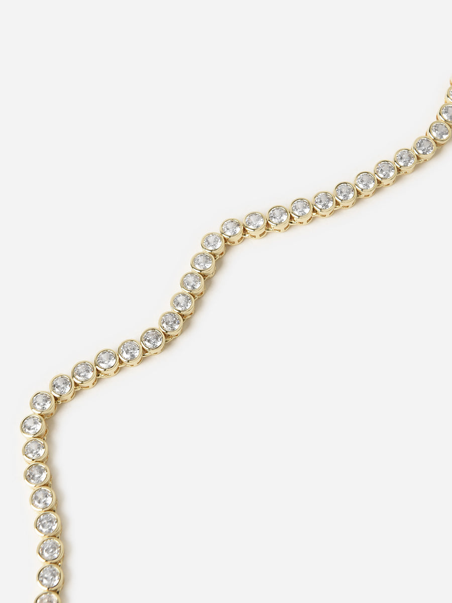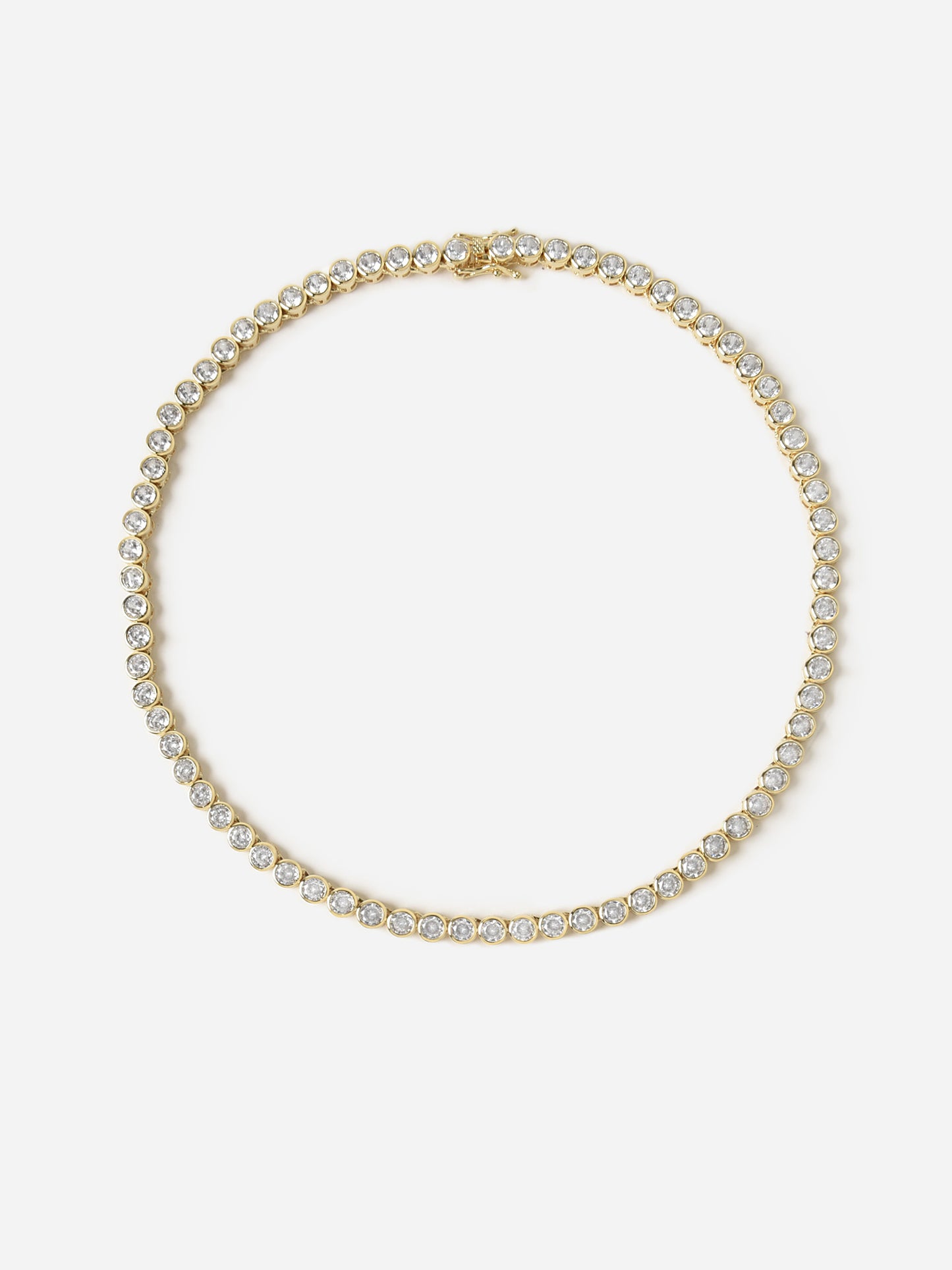 A 14-karat gold-filled tennis necklace with bezel-set crystals.