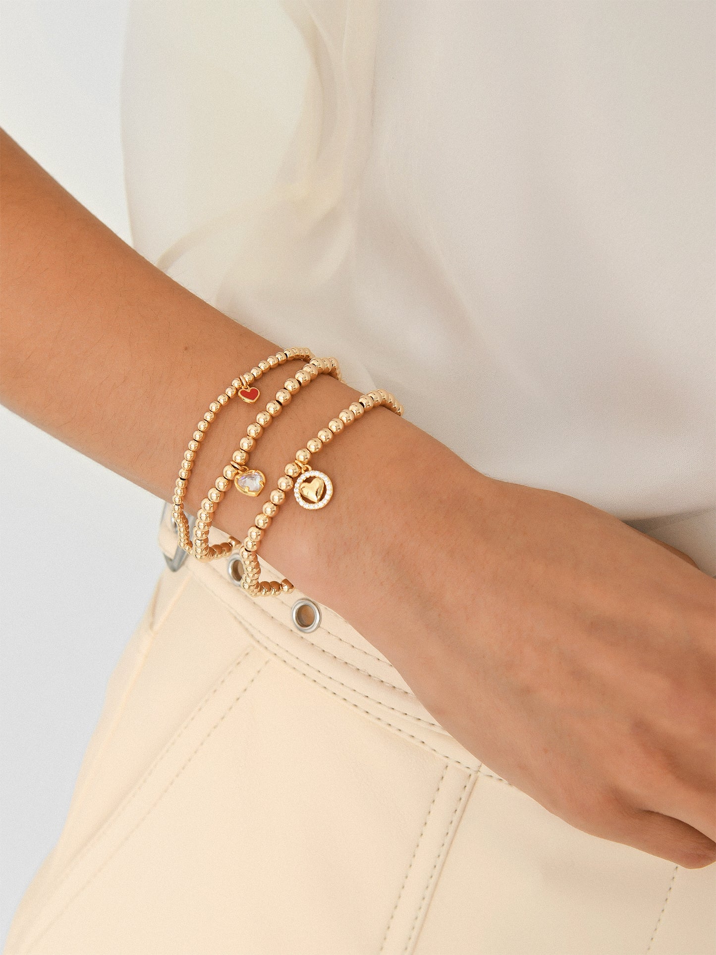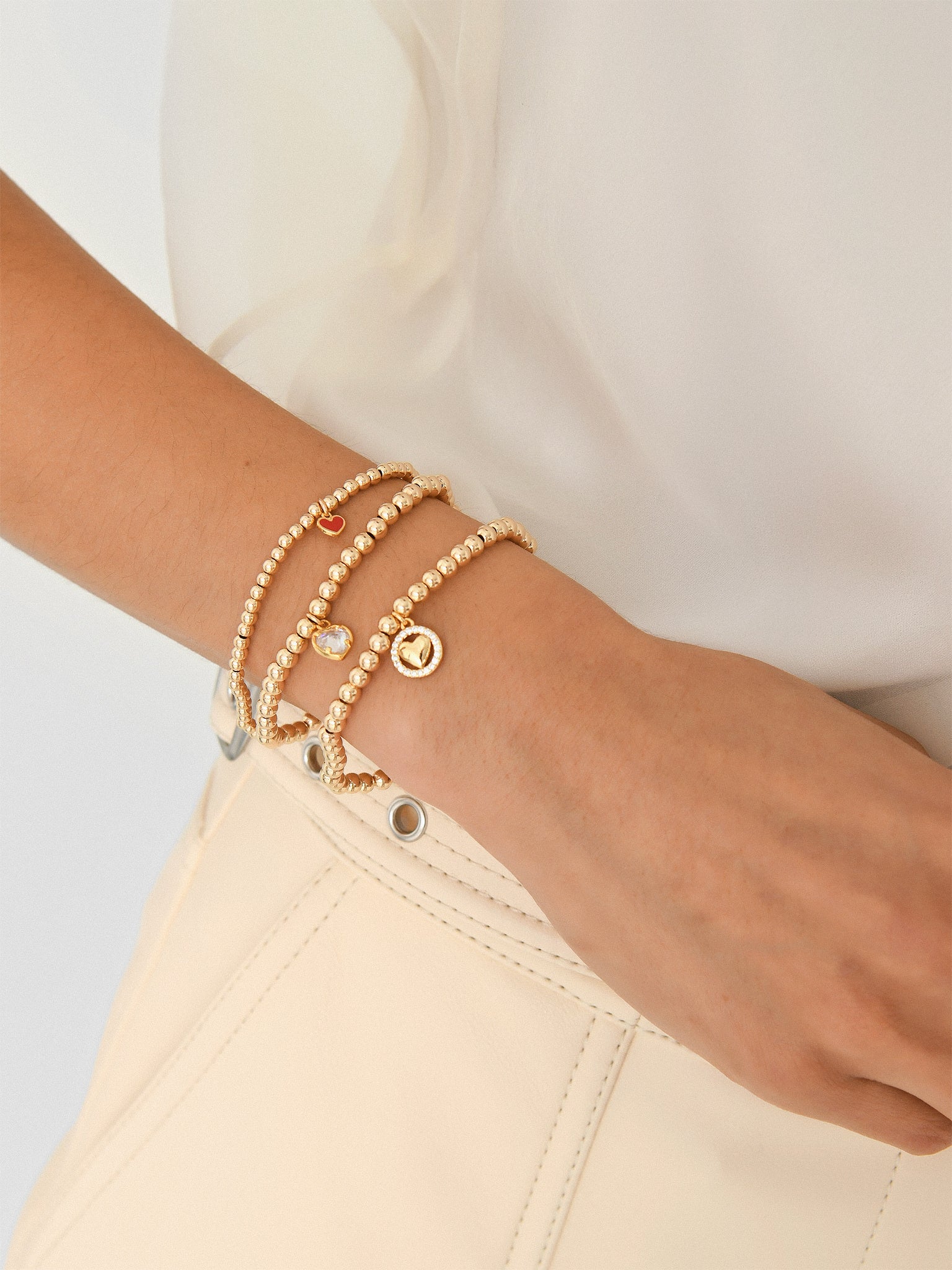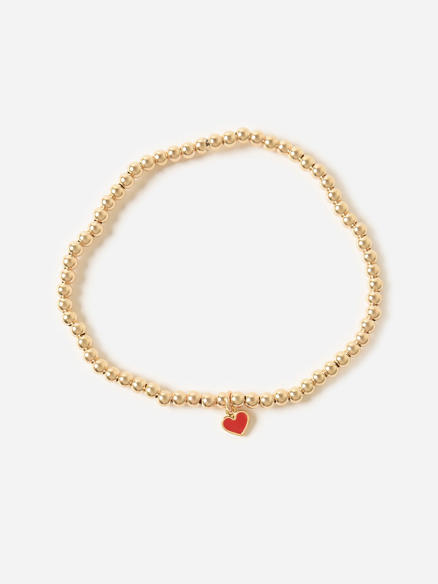 A 14-karat gold-filled beaded bracelet with a red enamel heart charm.