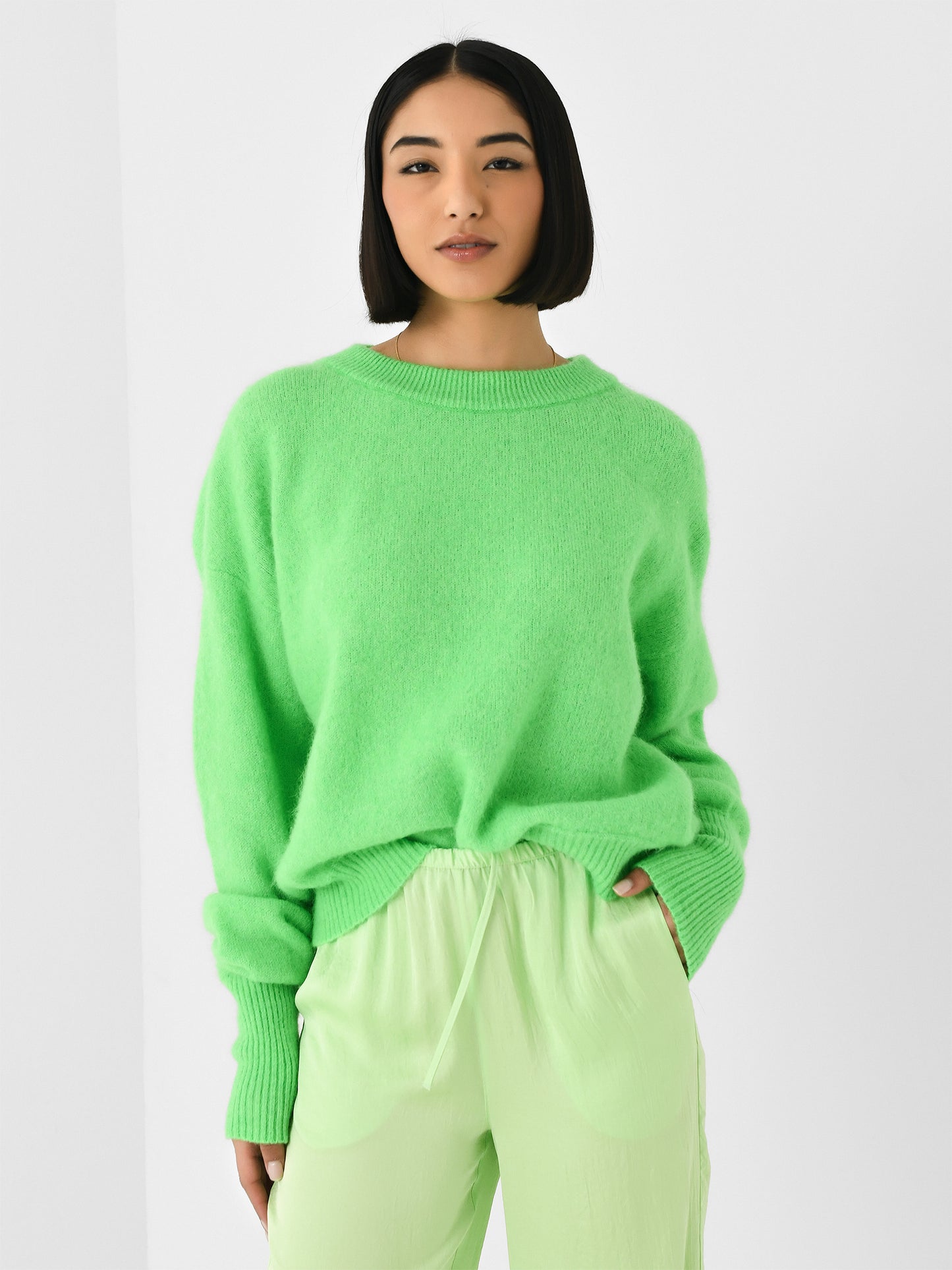 A fuzzy knit crewneck sweater with a cozy oversized silhouette.