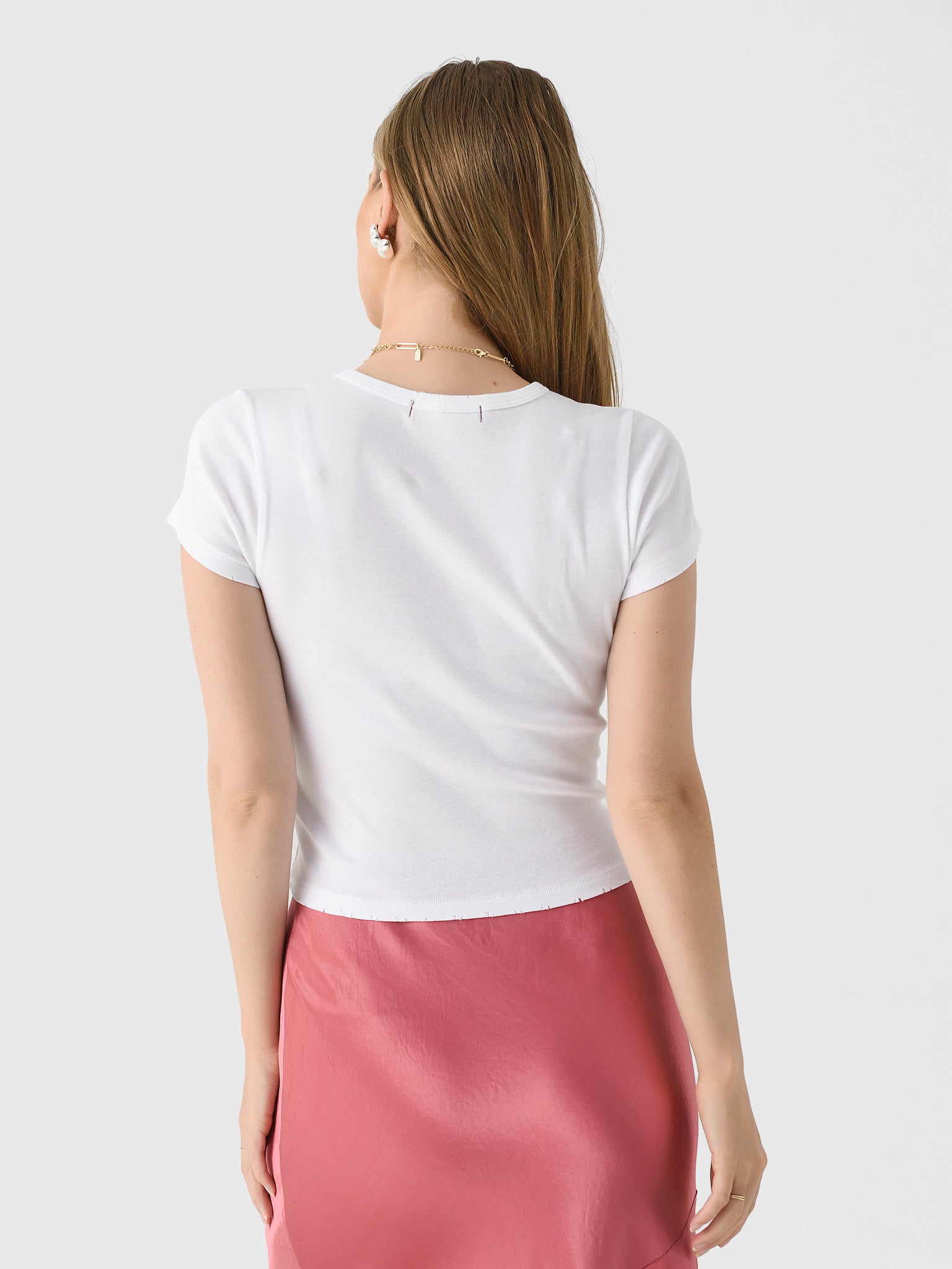 A slightly cropped baby tee made from a soft cotton blend with subtle distressed edges.