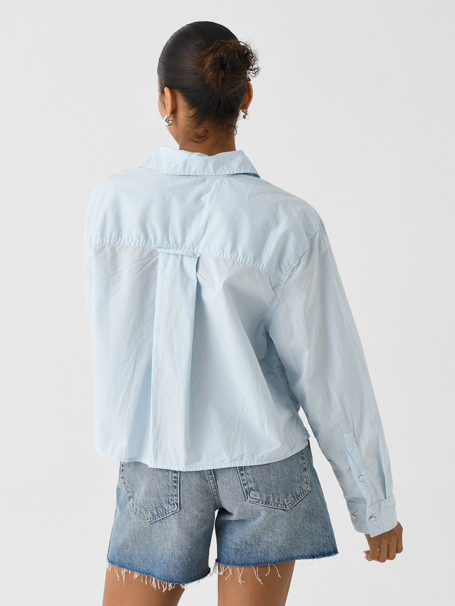 This relaxed style features a single chest pocket, elegant shell buttons, and is crafted from a beautifully soft, stonewashed cotton poplin for ultimate comfort. It's the perfect cropped take on a classic shirt.