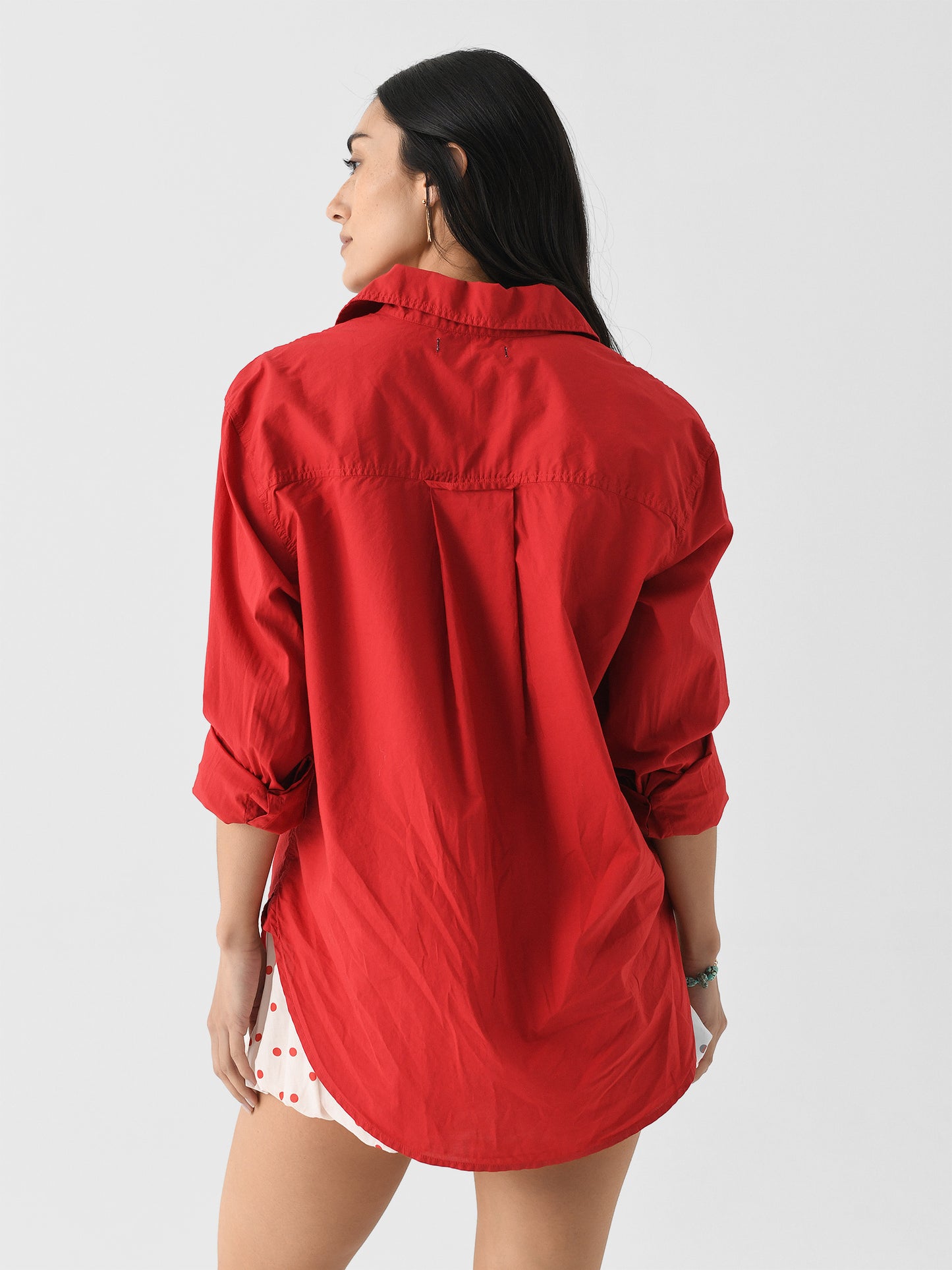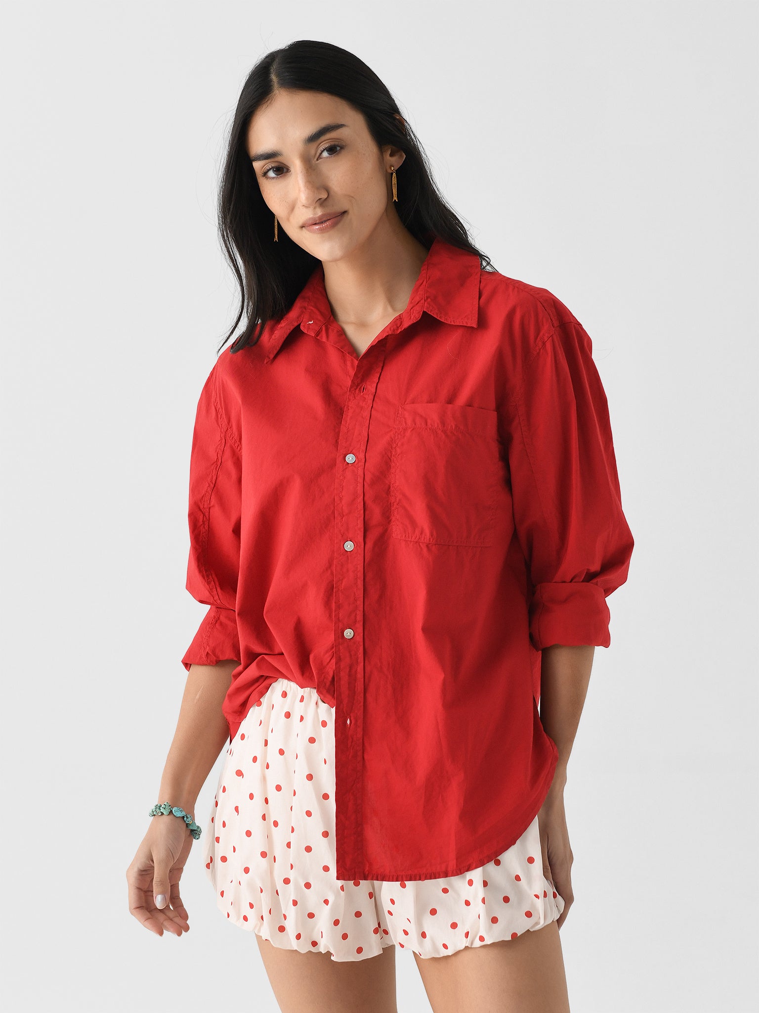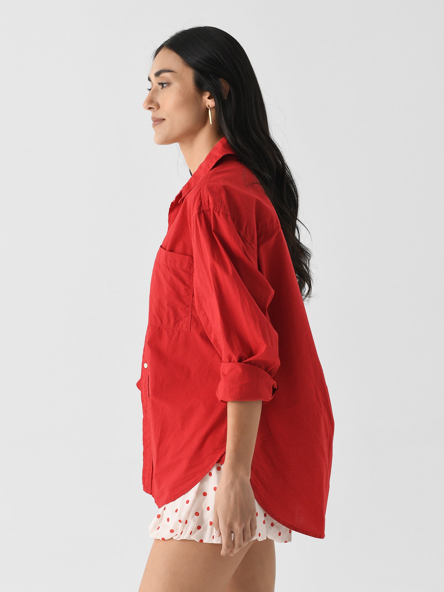 An oversized collared shirt crafted from soft cotton poplin fabric.