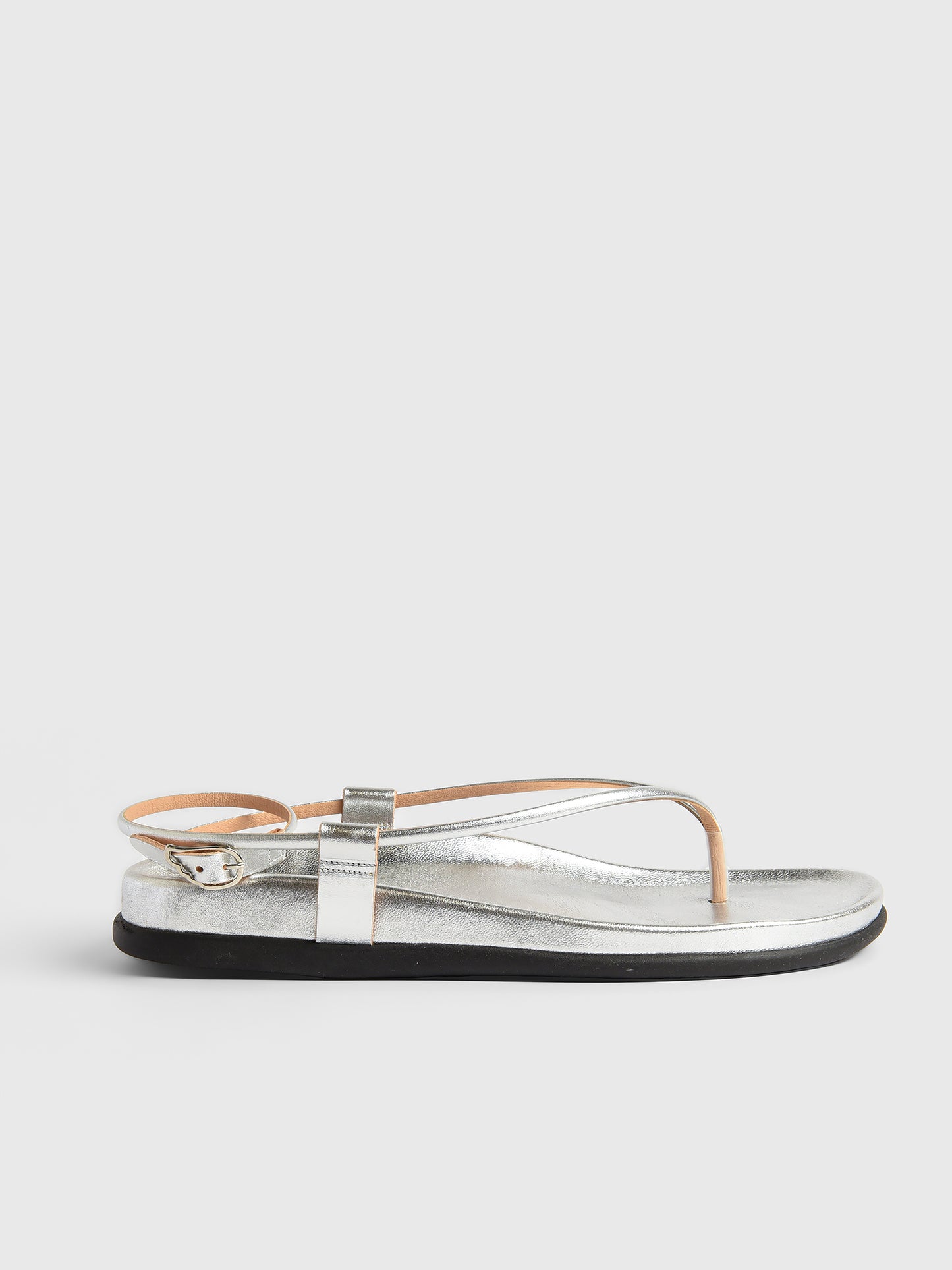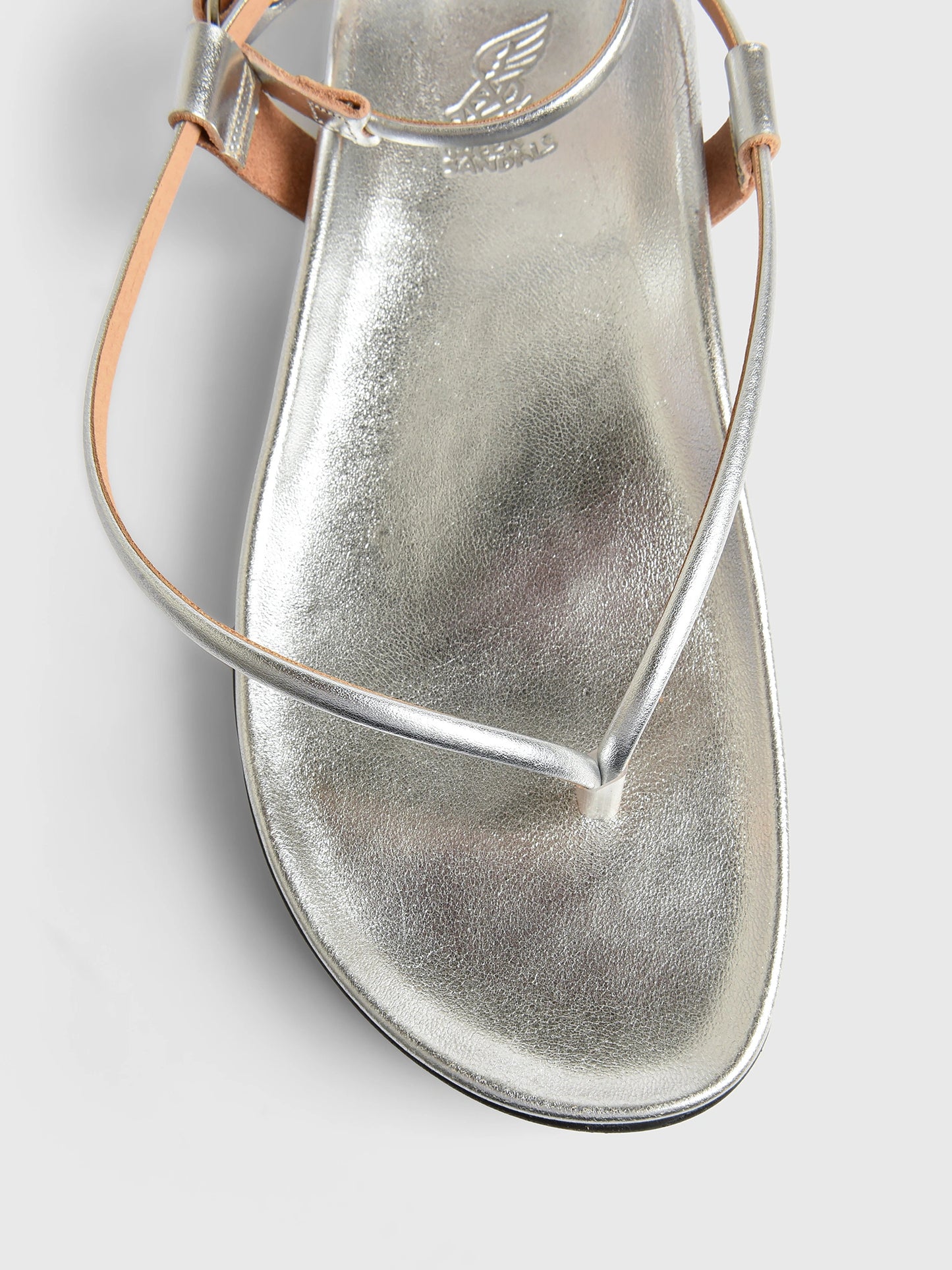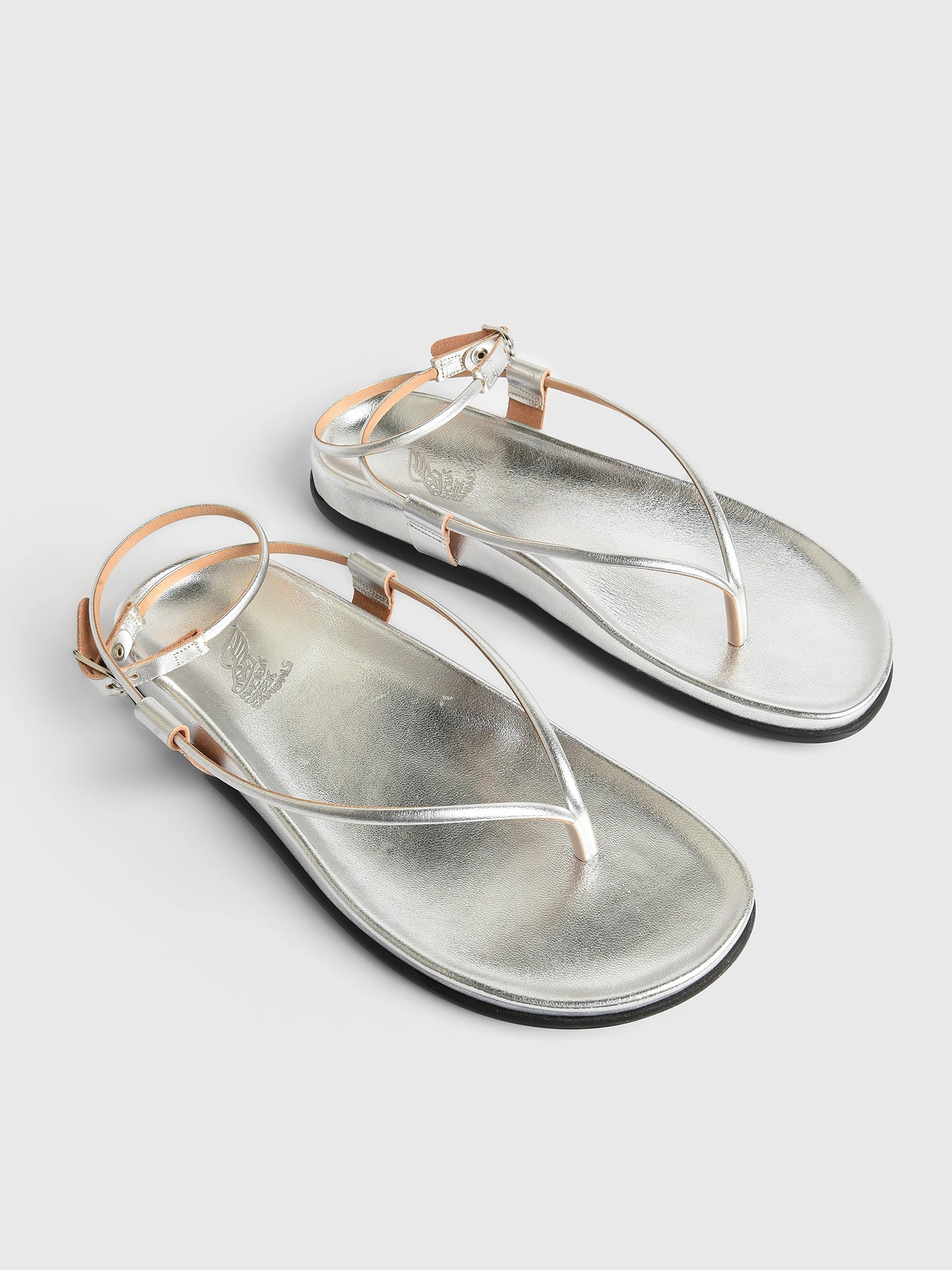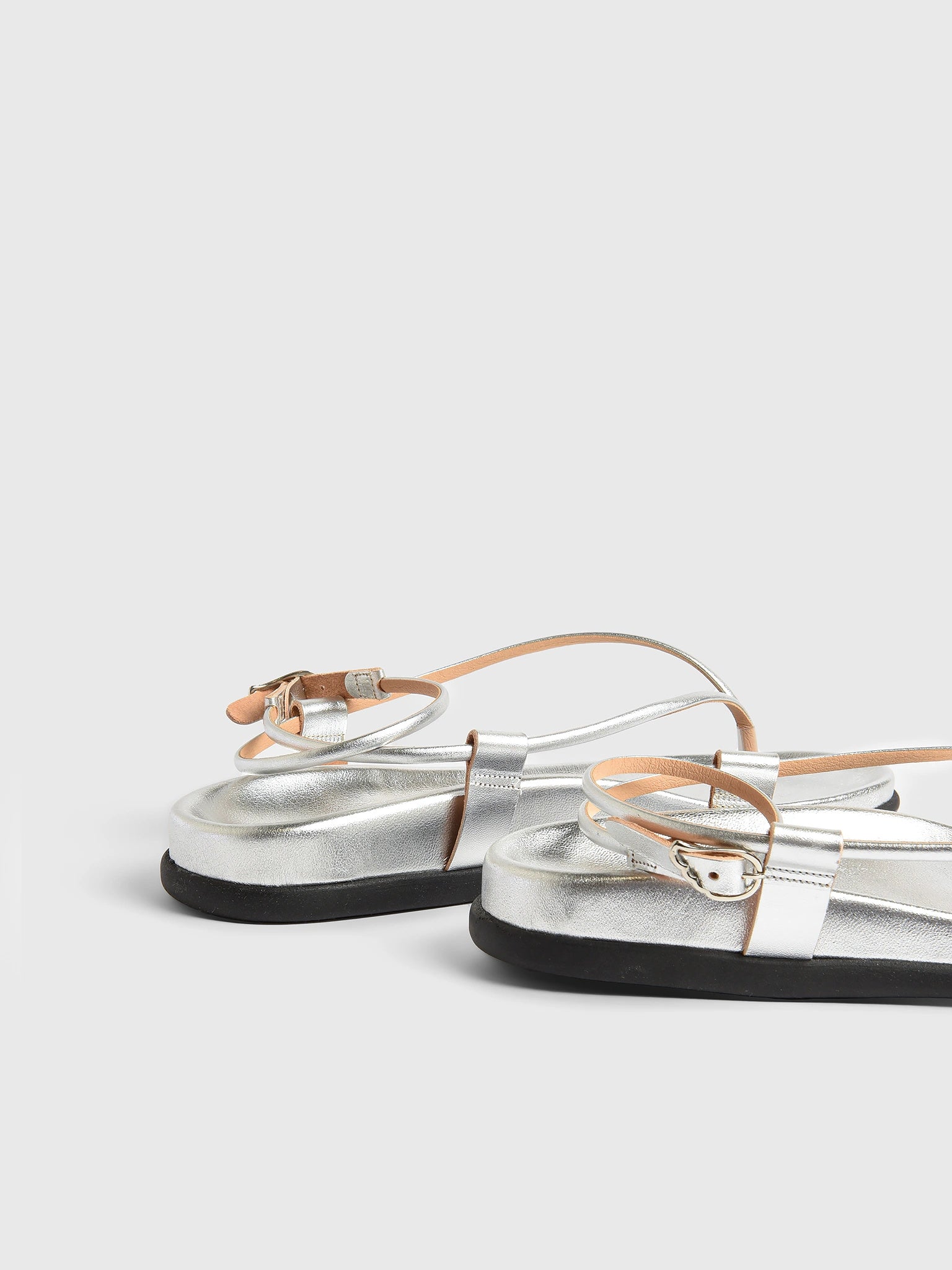 A metallic sandal with a minimalist design, adjustable ankle straps, and a contoured footbed for enhanced comfort.