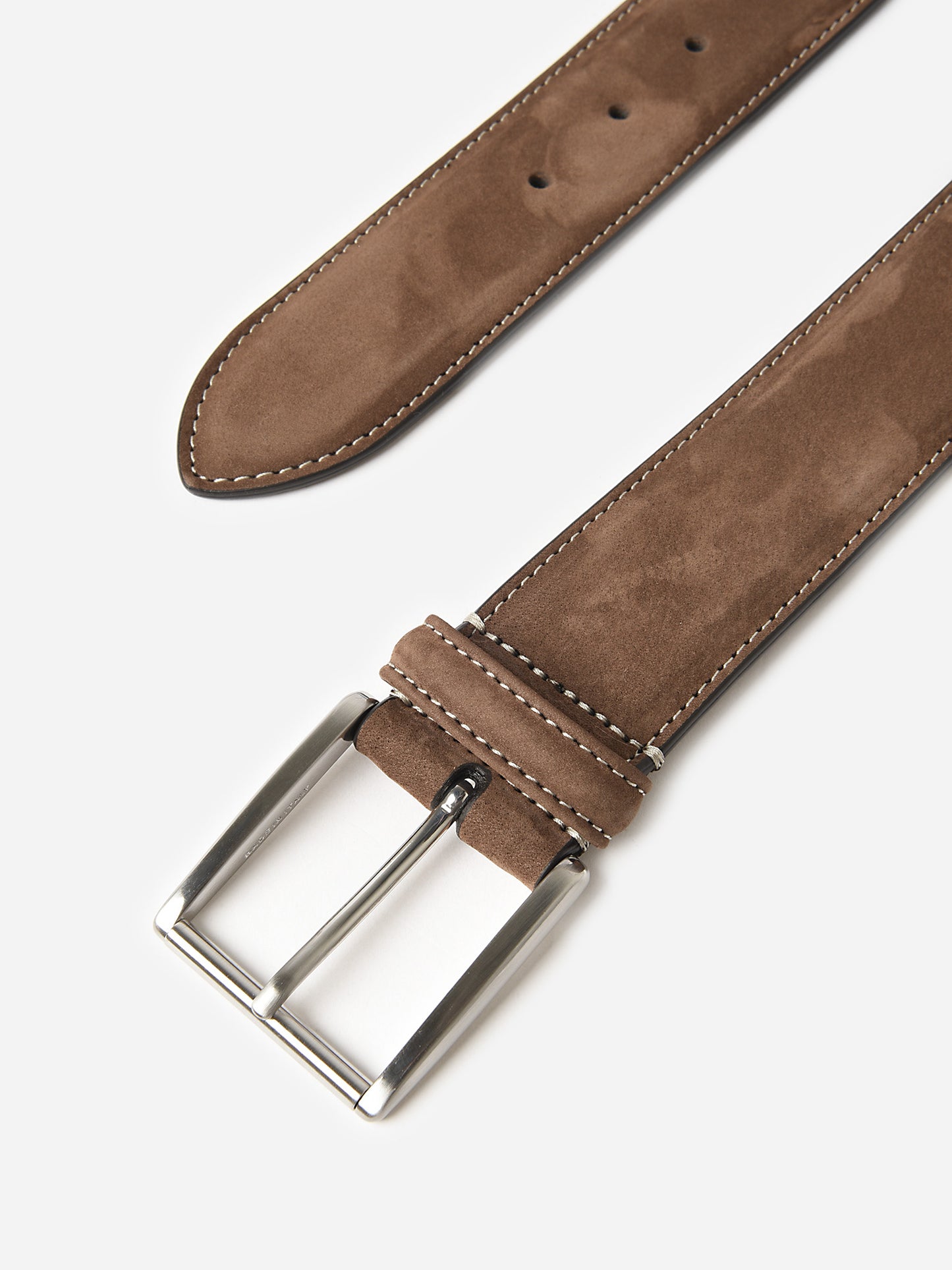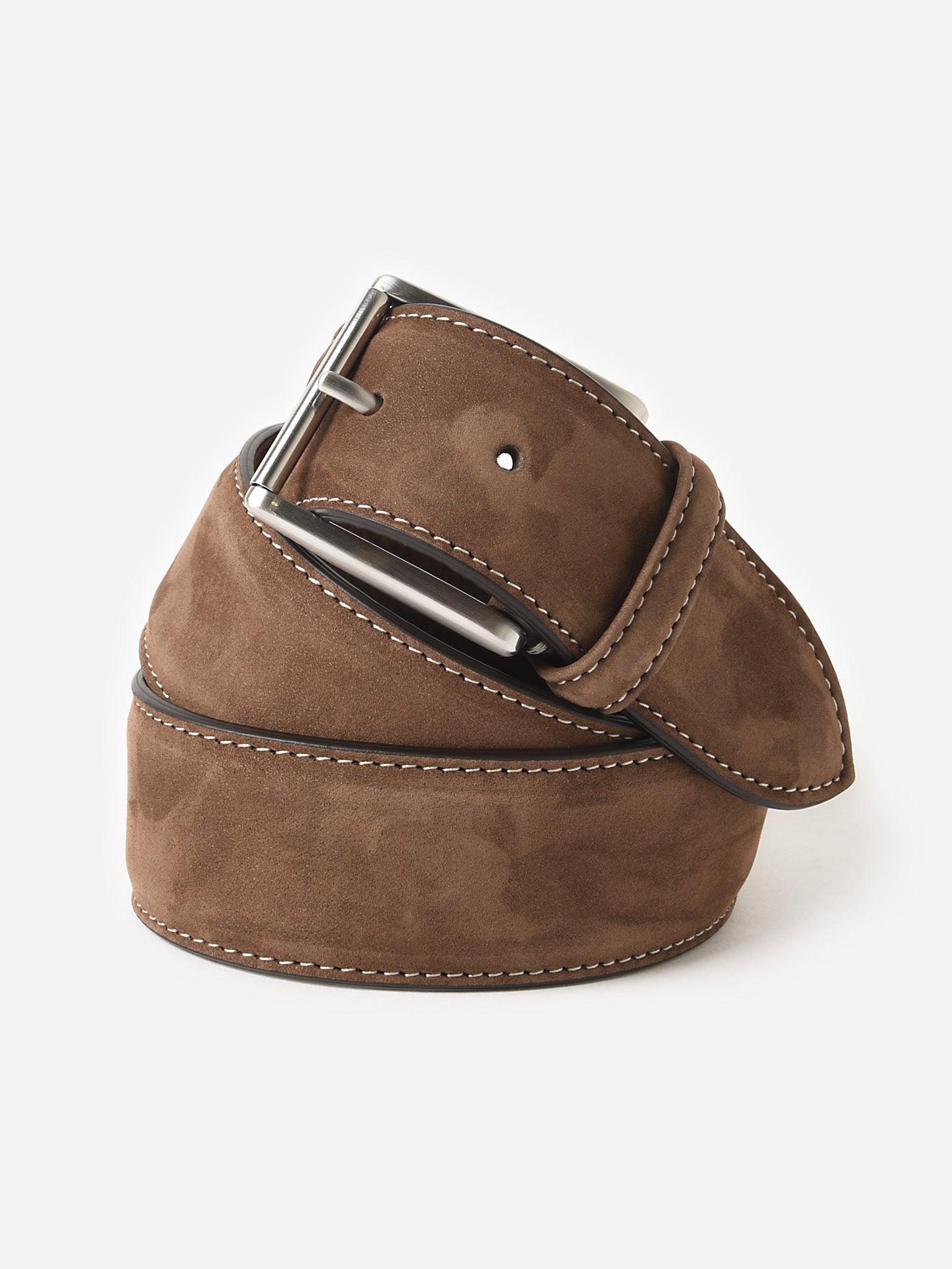 A soft suede belt with a silver buckle and contrast stitching.