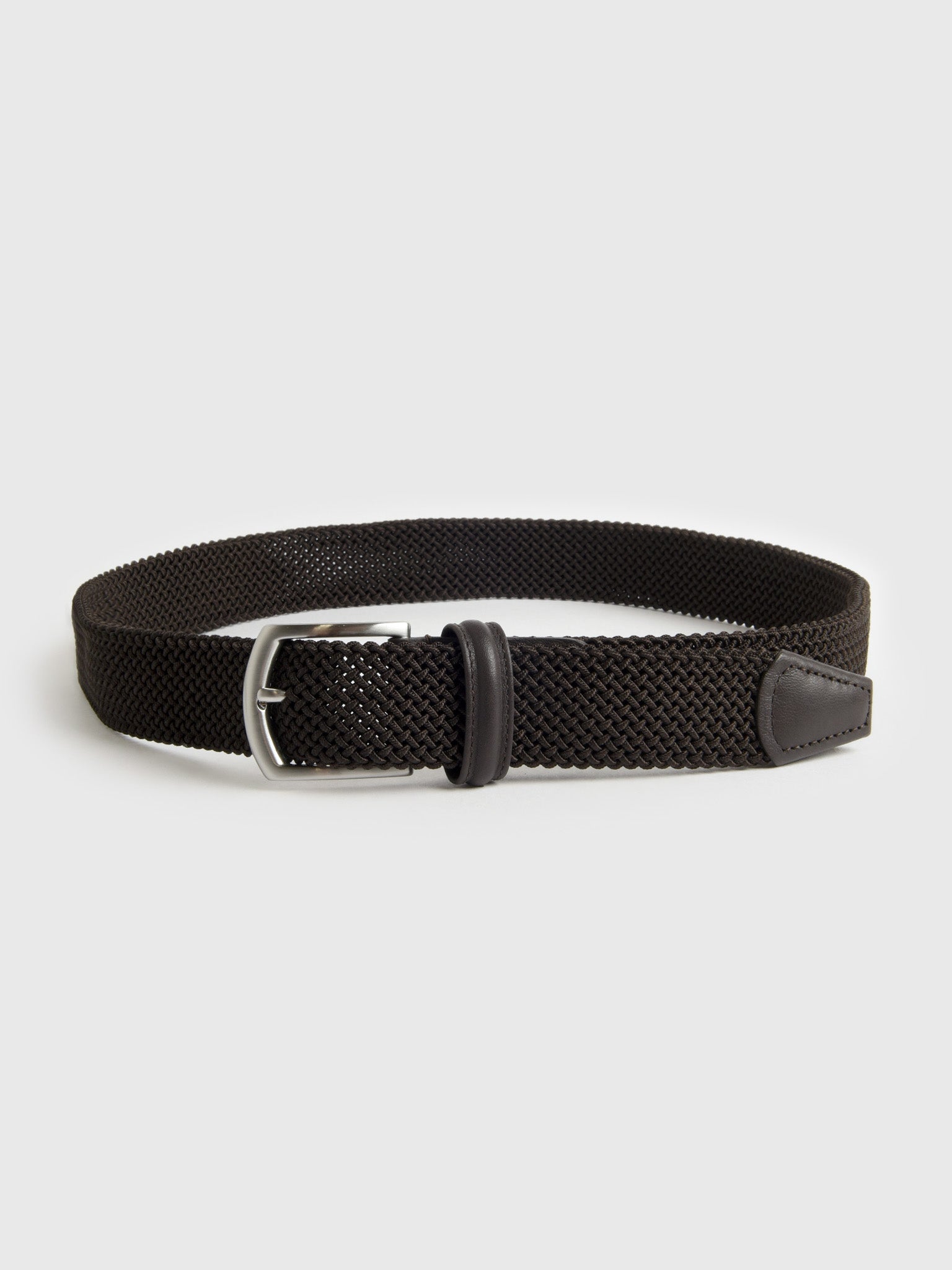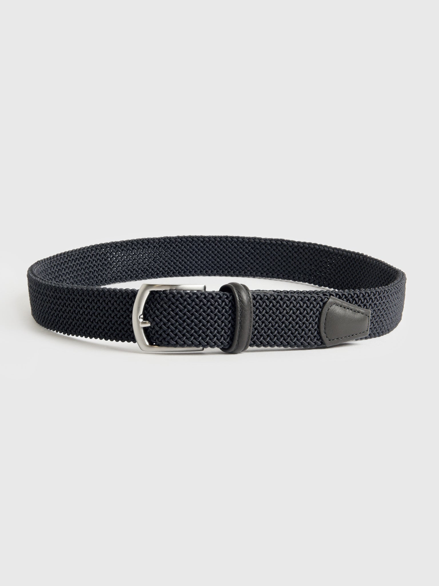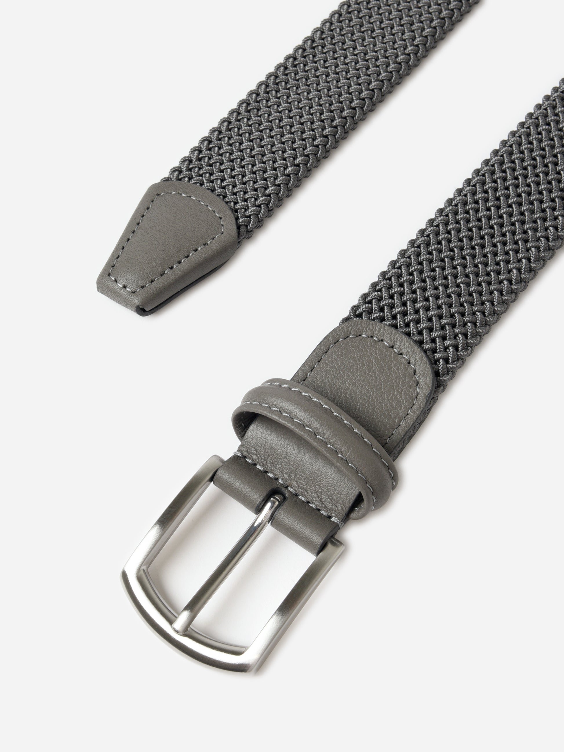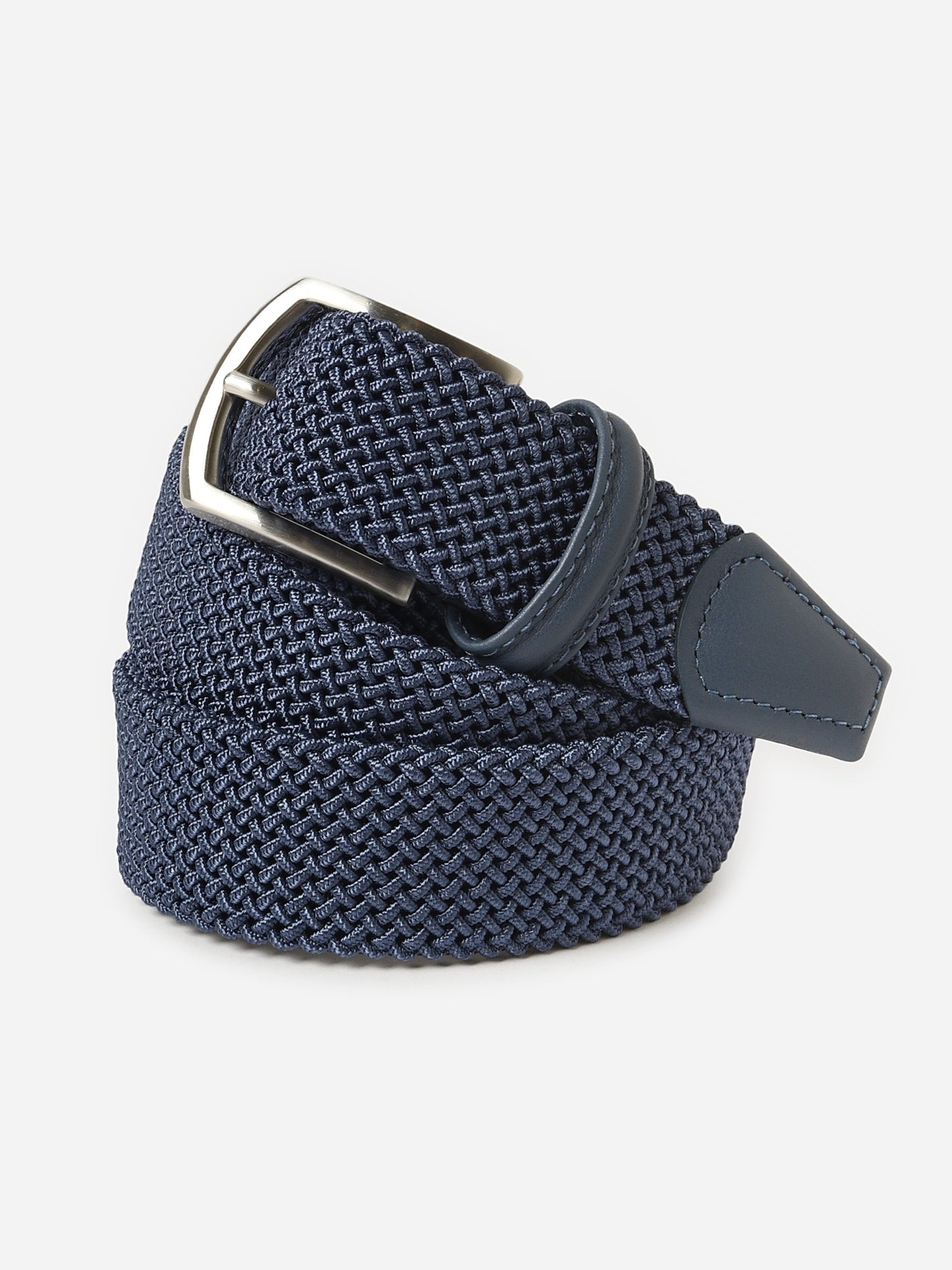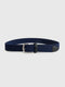 This versatile belt is crafted from a durable and stretchy woven material for a comfortable and flexible fit. It features a sleek silver buckle and refined leather trim, offering a modern take on a classic style.