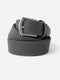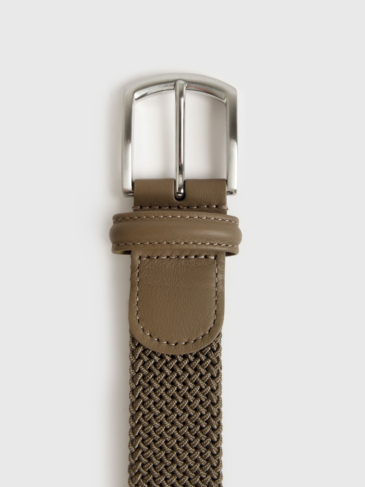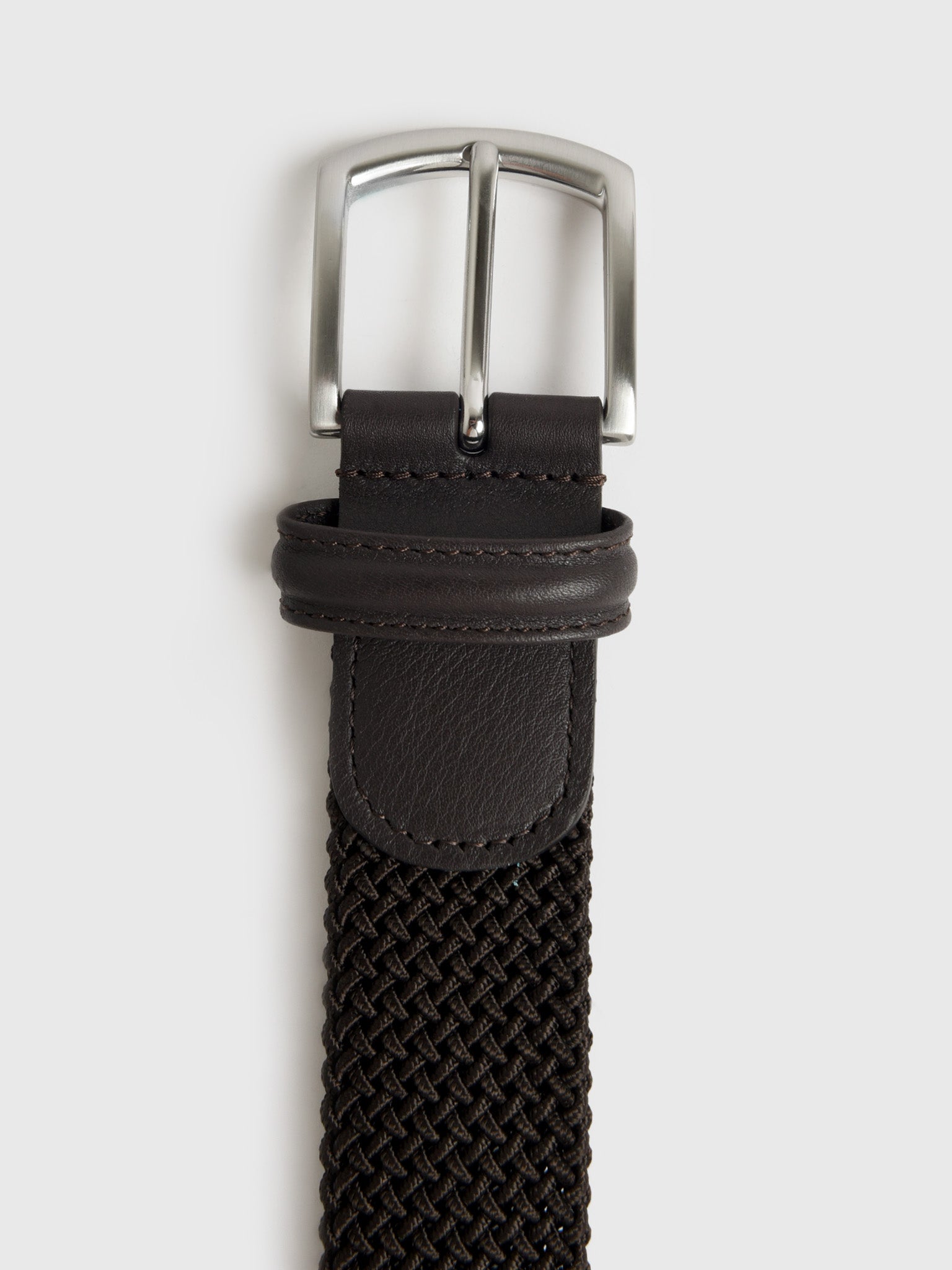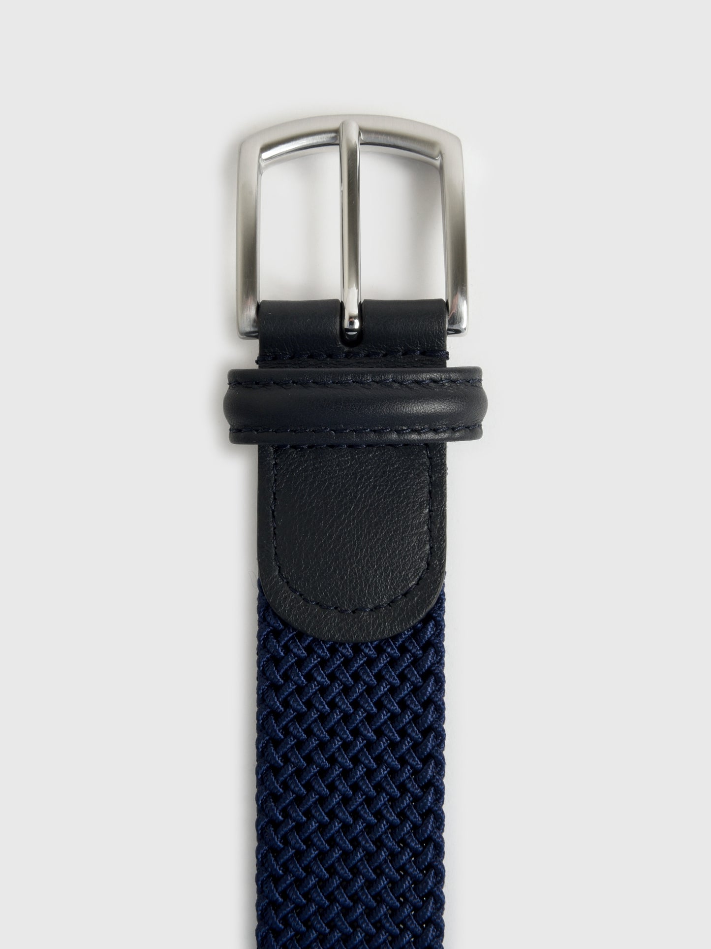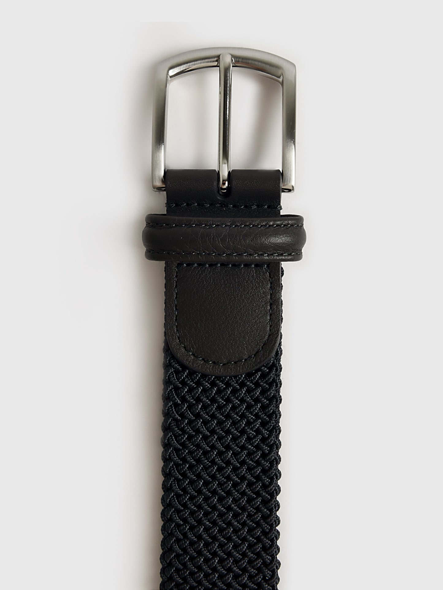 This versatile belt is crafted from a durable and stretchy woven material for a comfortable and flexible fit. It features a sleek silver buckle and refined leather trim, offering a modern take on a classic style.