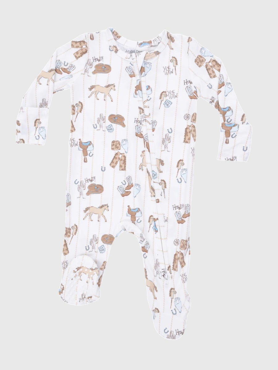 This charming zipper footie is made from buttery-soft bamboo viscose stretch fabric for cozy, breathable comfort. Featuring a convenient two-way zipper for easy changes and a playful cowboy-themed print, it’s perfect for everyday wear with a touch of western fun.