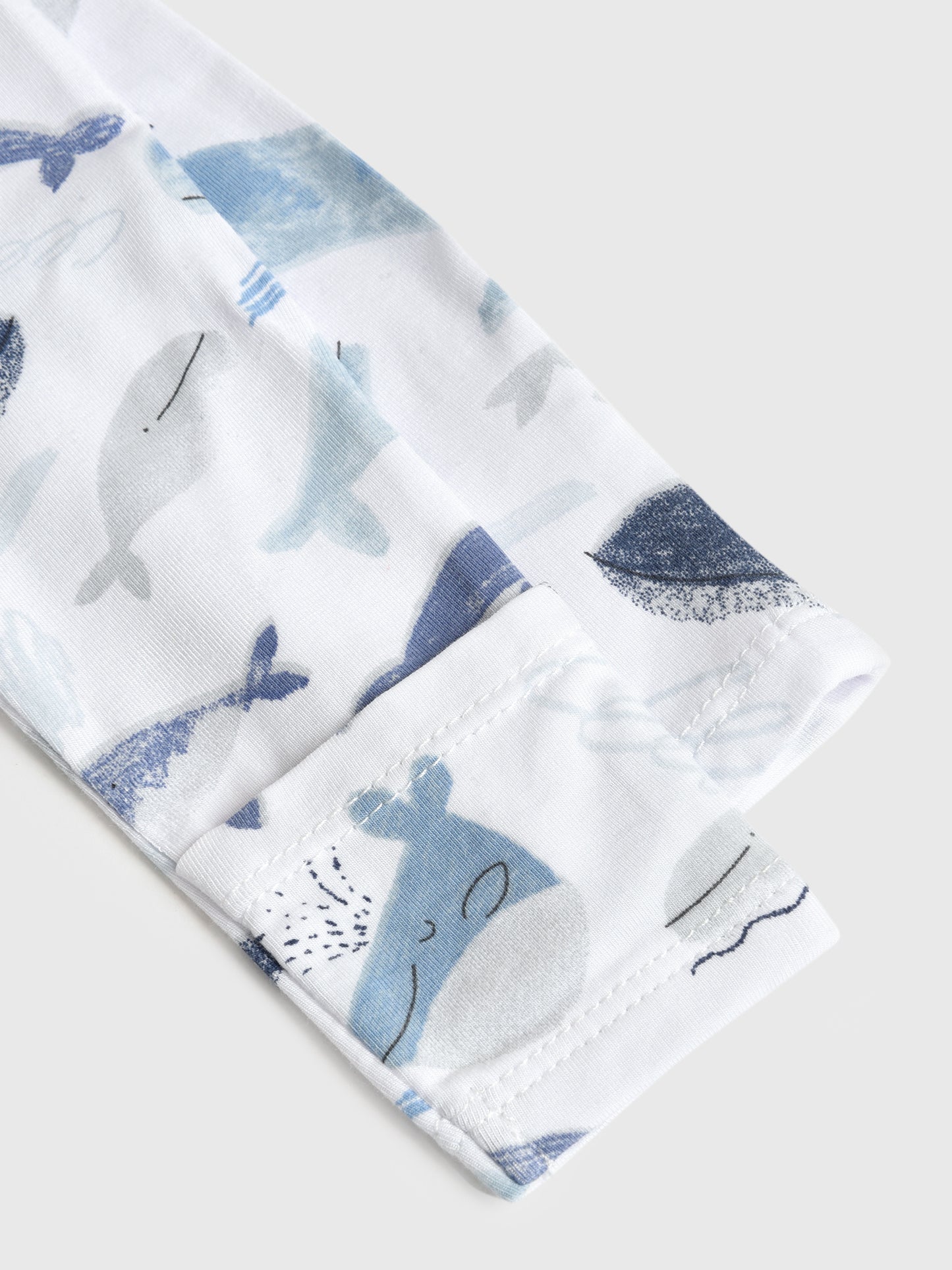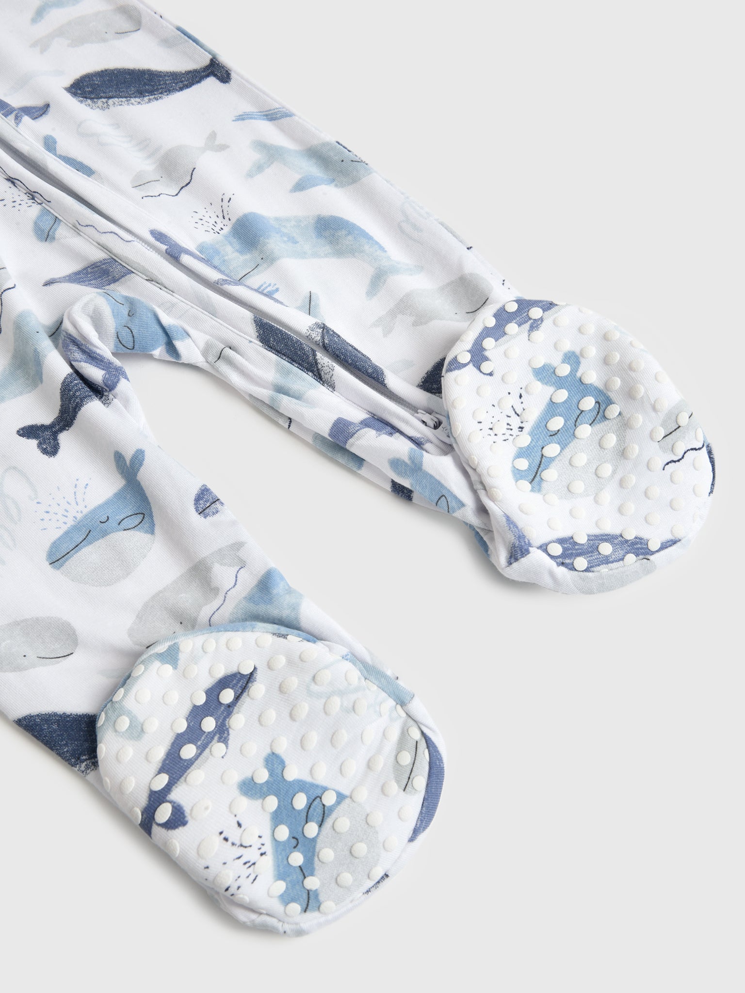 An incredibly soft footie made from breathable bamboo viscose fabric featuring a watercolor whales print.