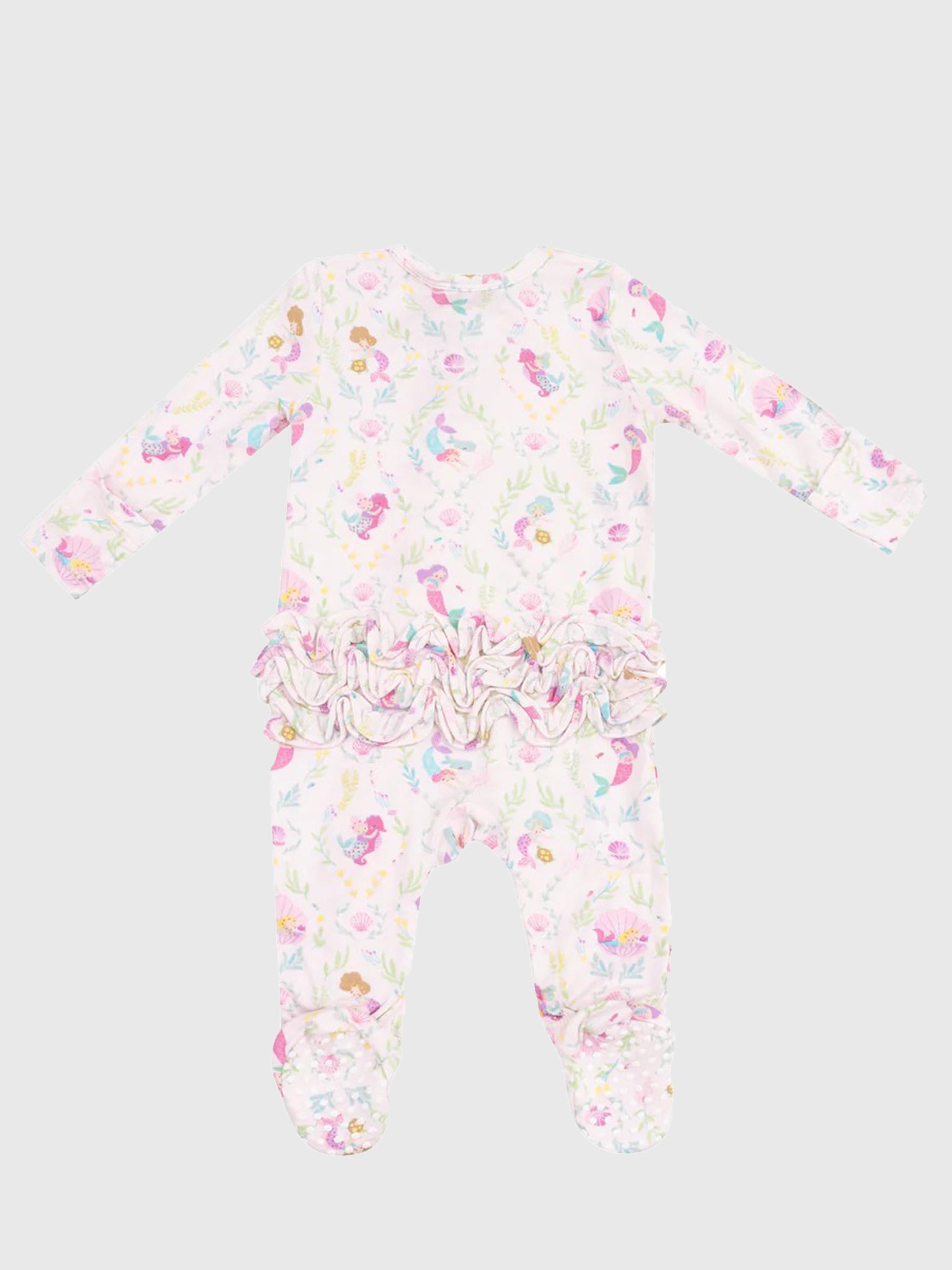 This cozy zipper footie is crafted from soft bamboo viscose fabric and features a charming mermaid print and adorable ruffle detailing.