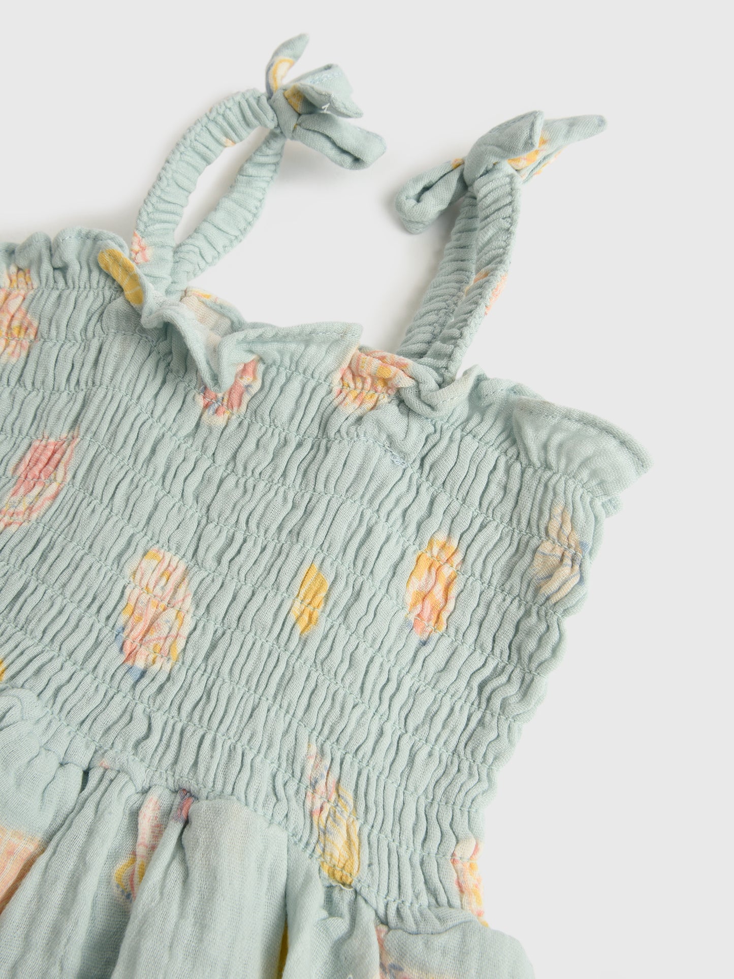 This lightweight bubble features a seashell print, a comfortable smocked design, and a cute ruffle skirt.