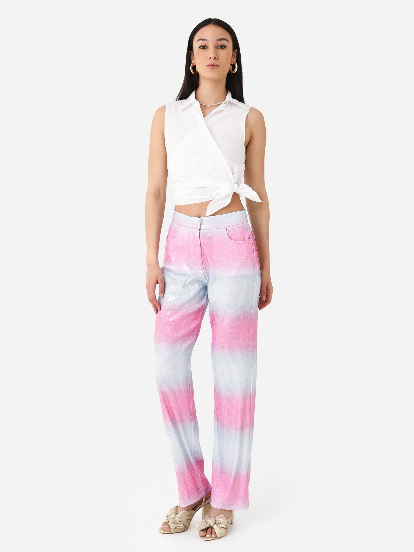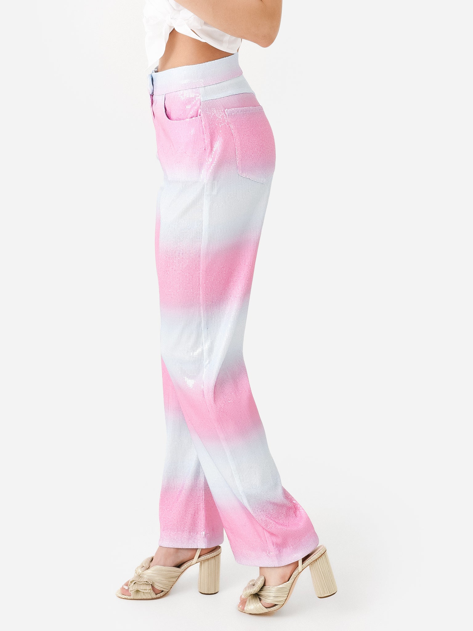 Wide-leg ombre printed sequin pant.