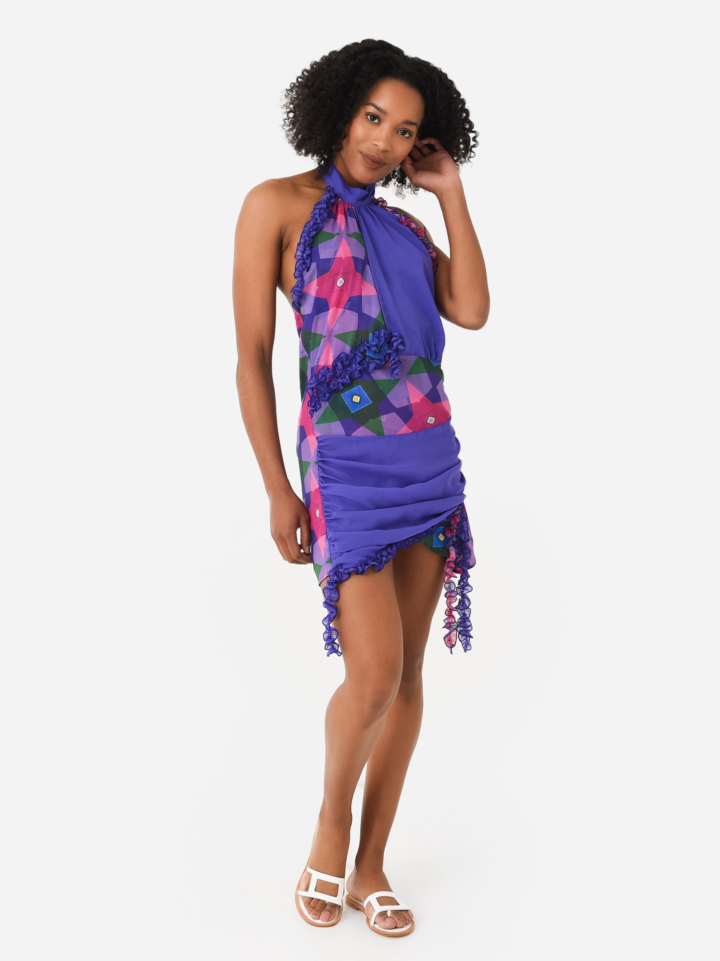Open-back mini dress with ruching and ruffle details.