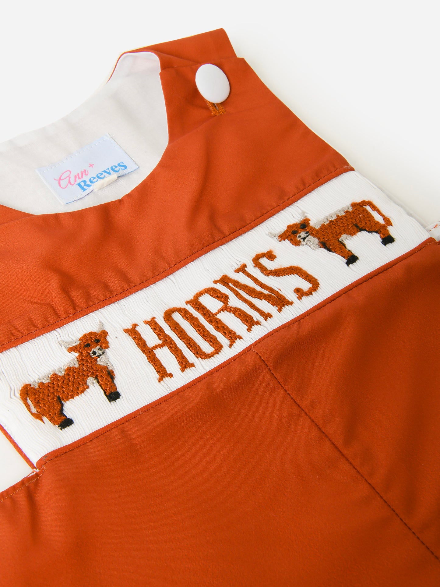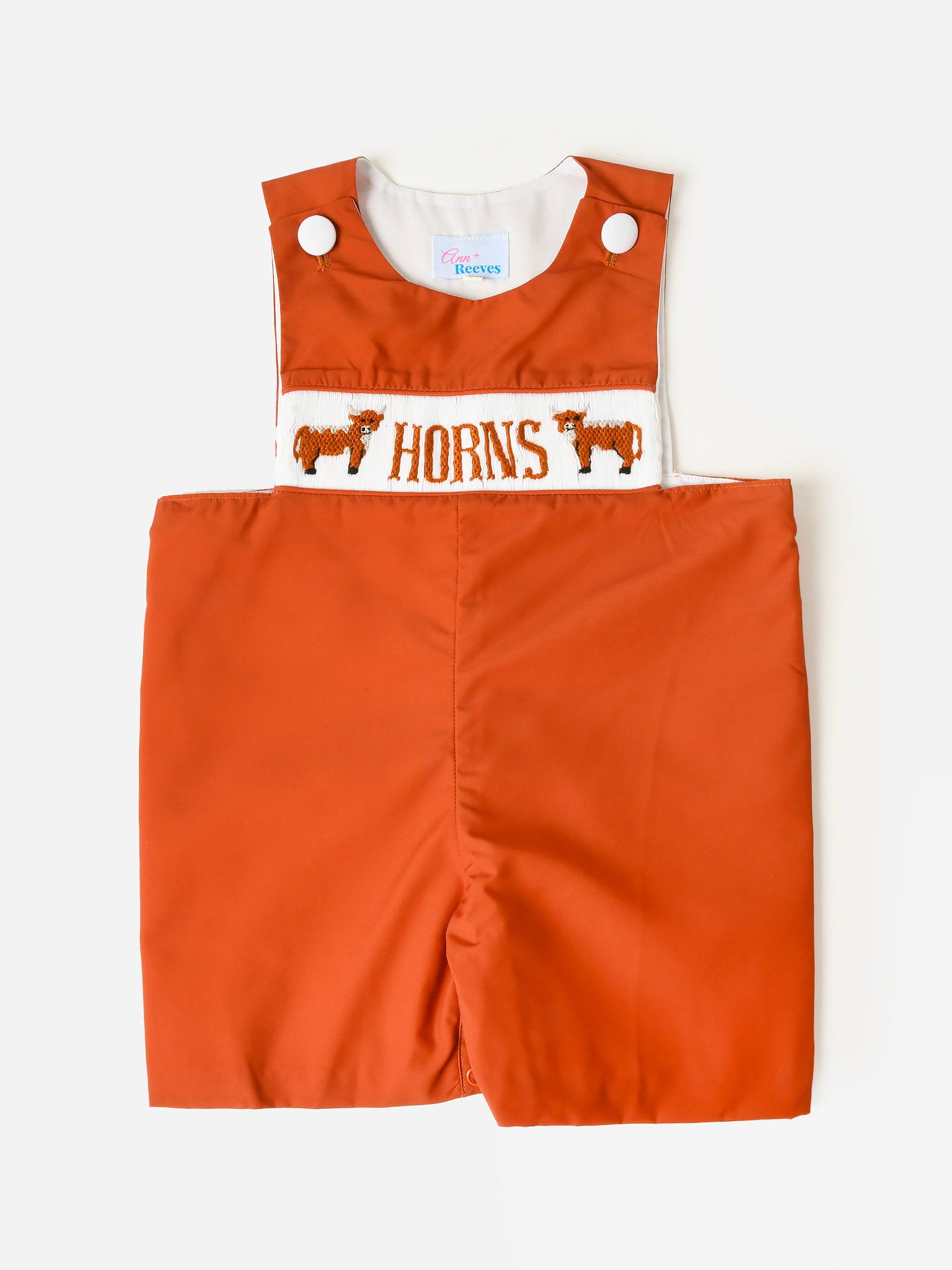 Burnt orange shortall with an embroidered University of Texas design.