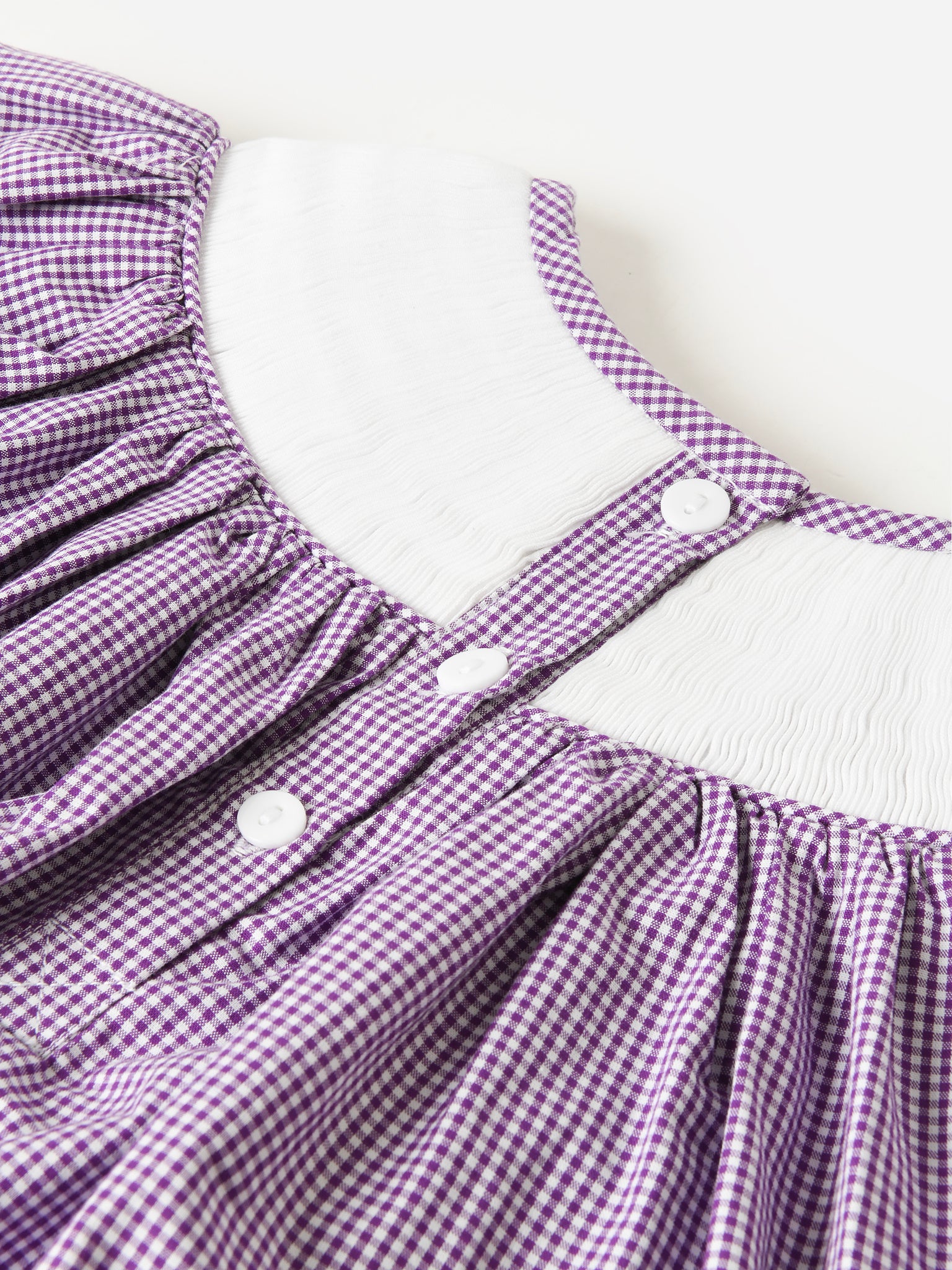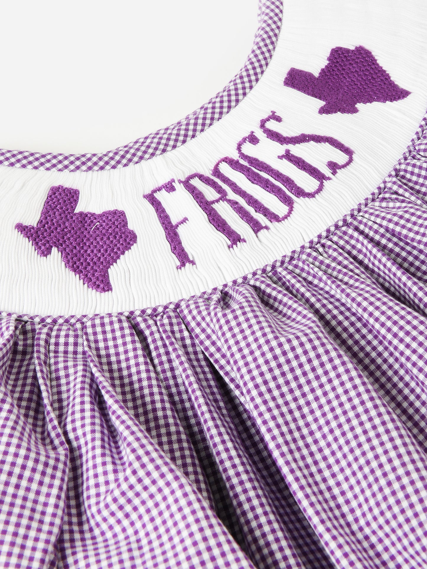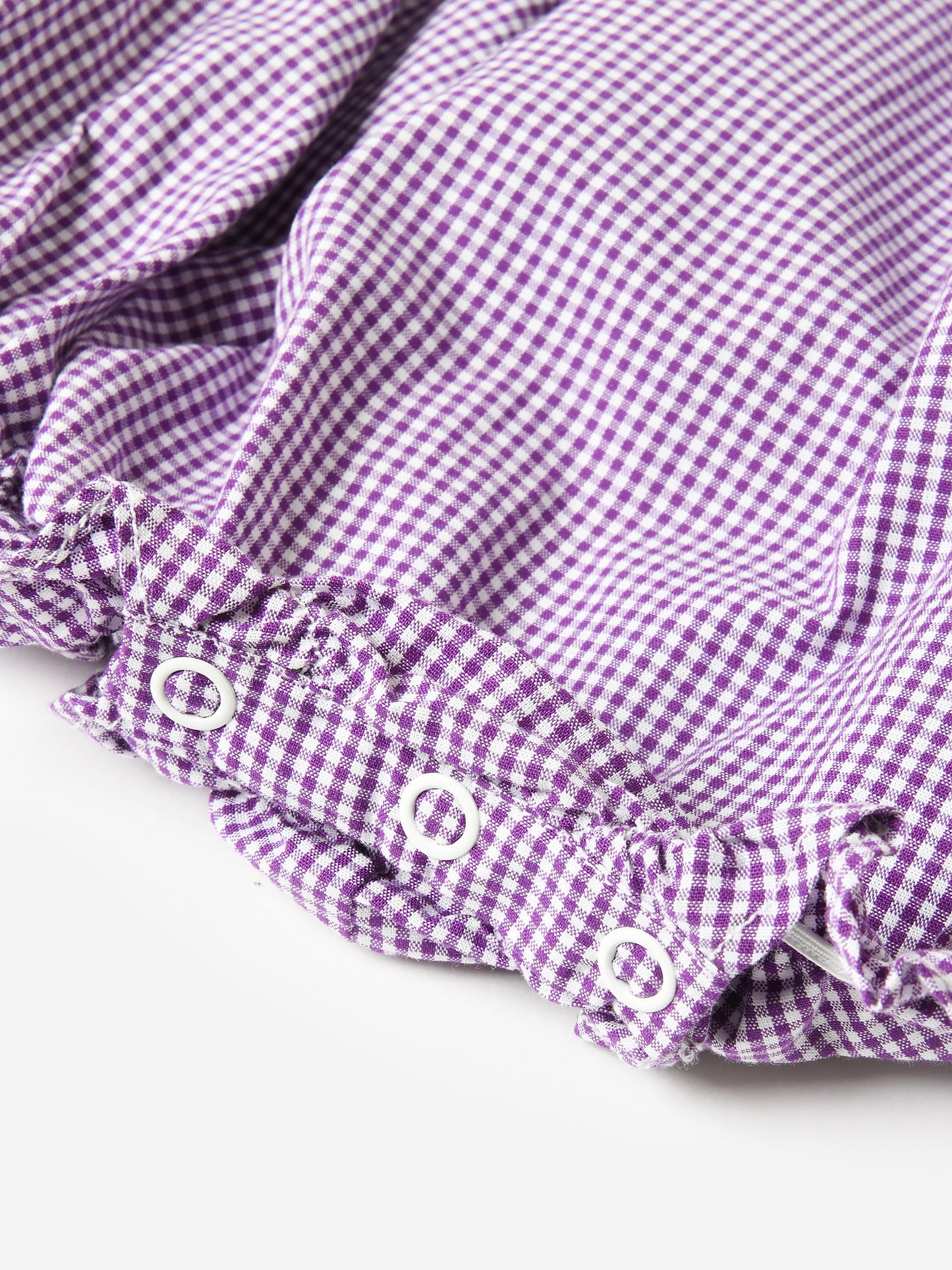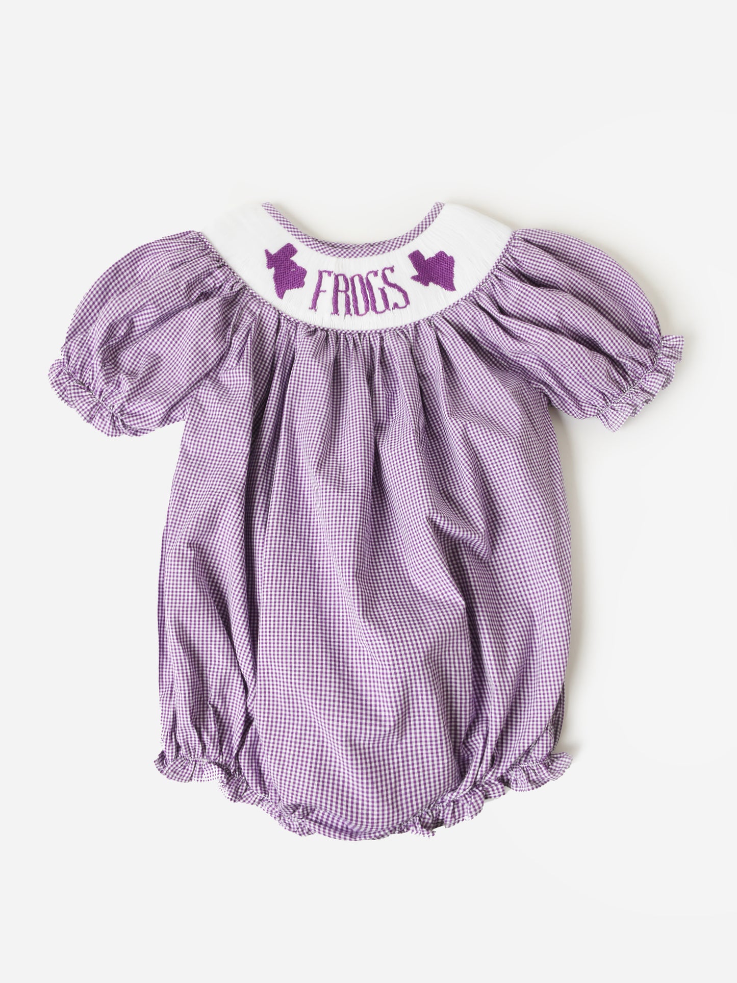 Micro-gingham printed bubble onesie with an embroidered TCU design.