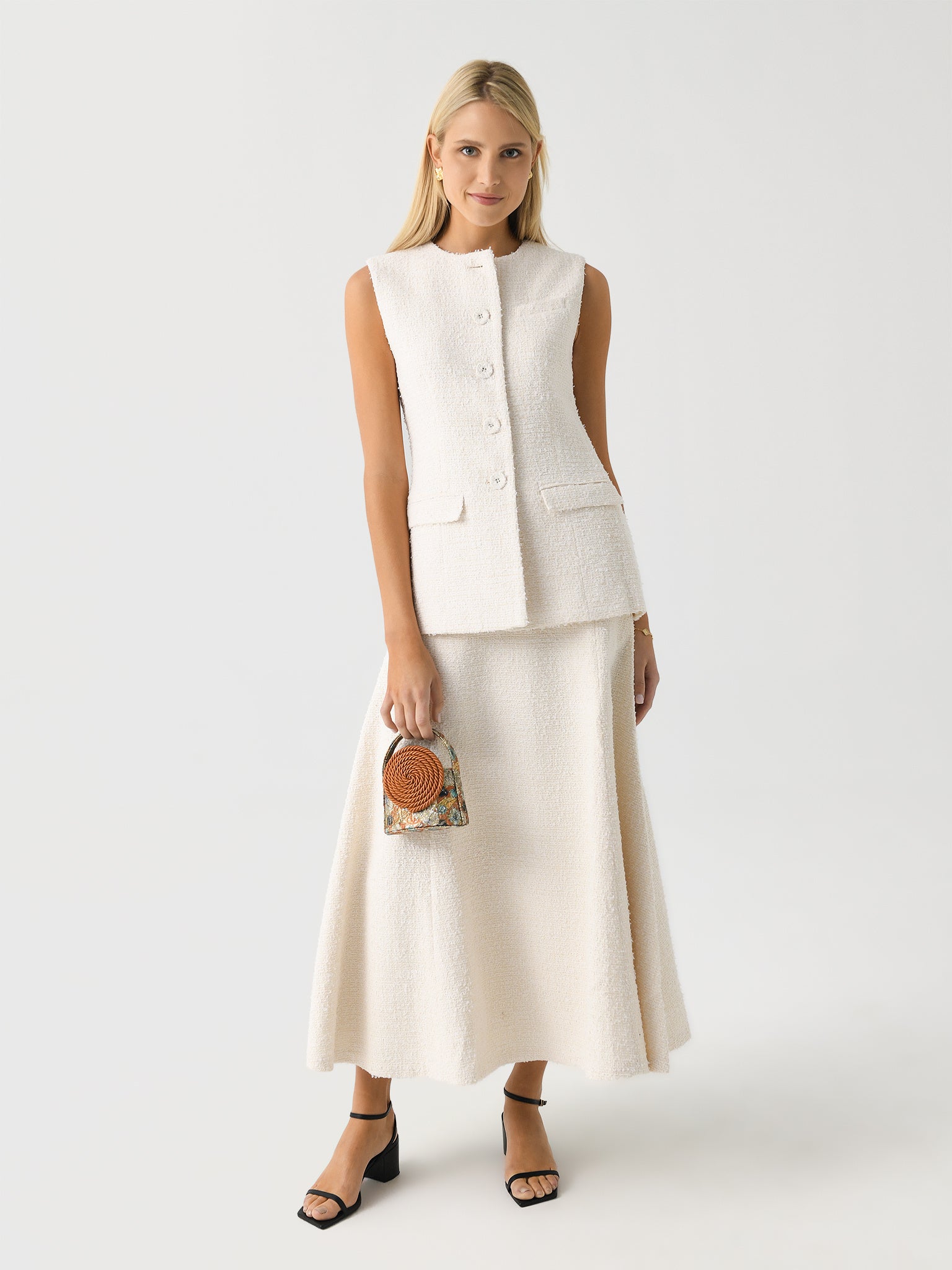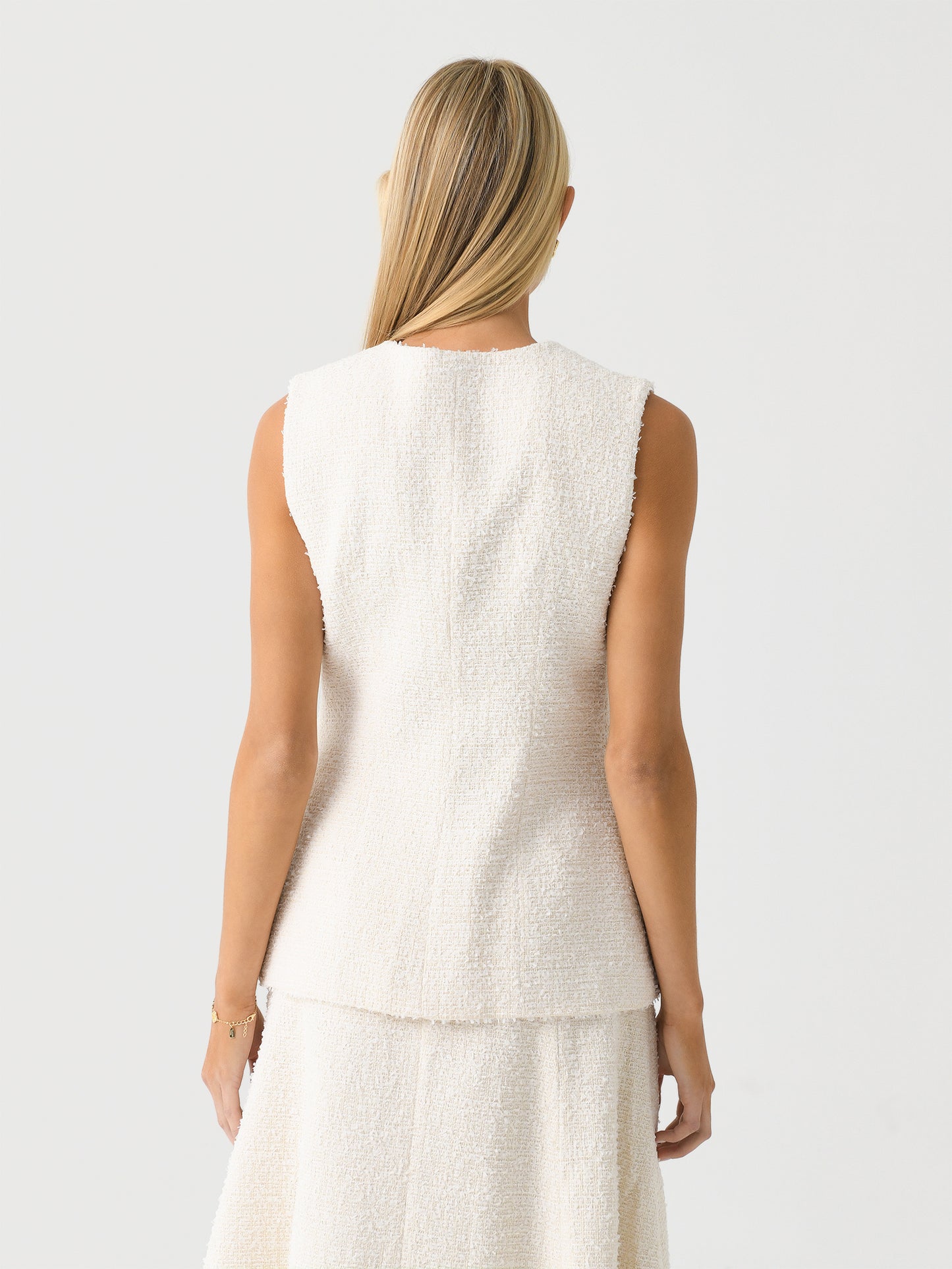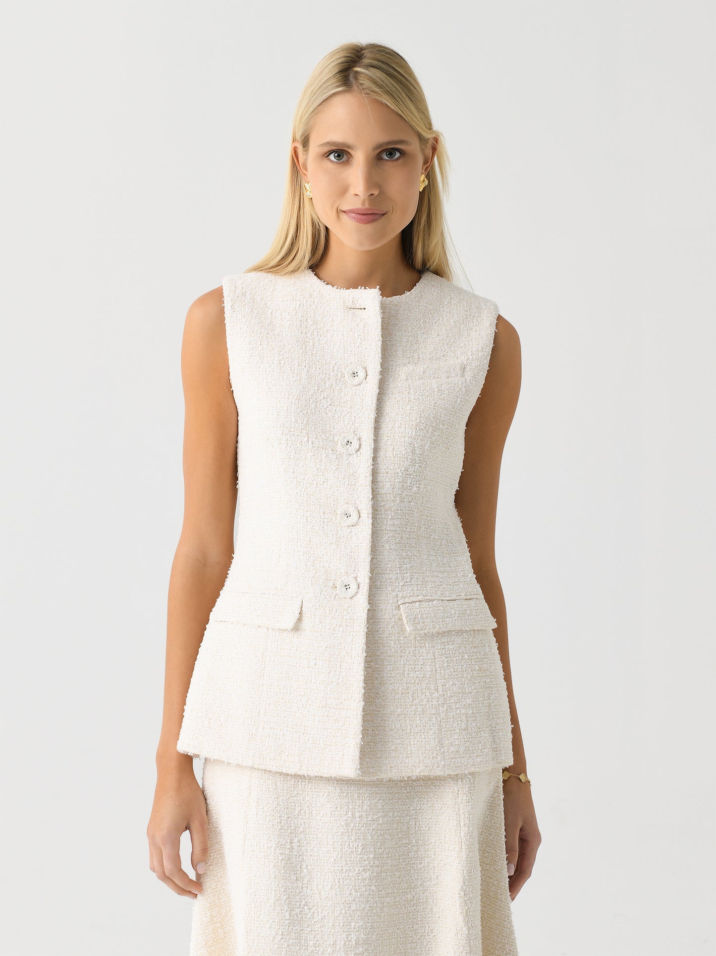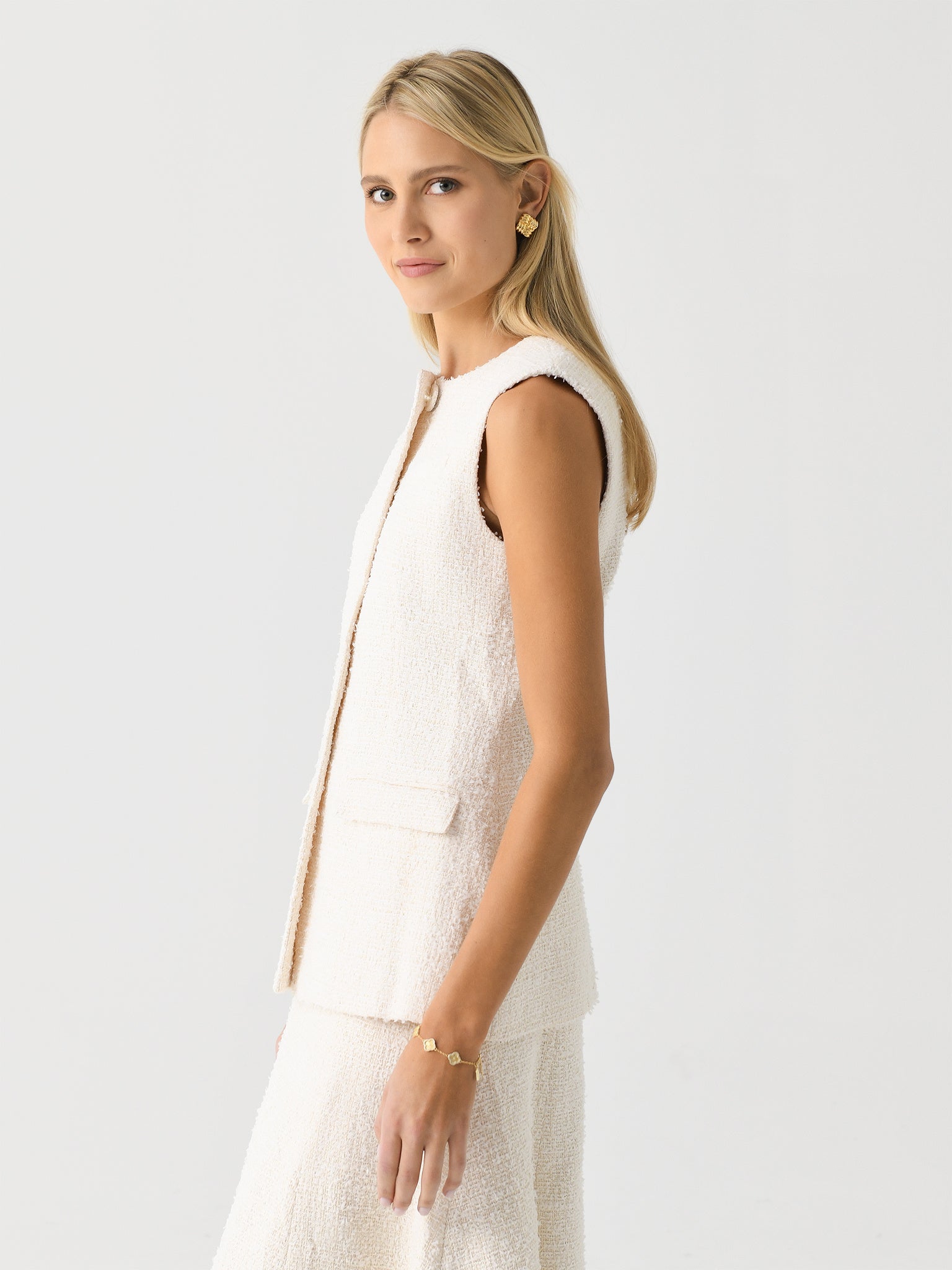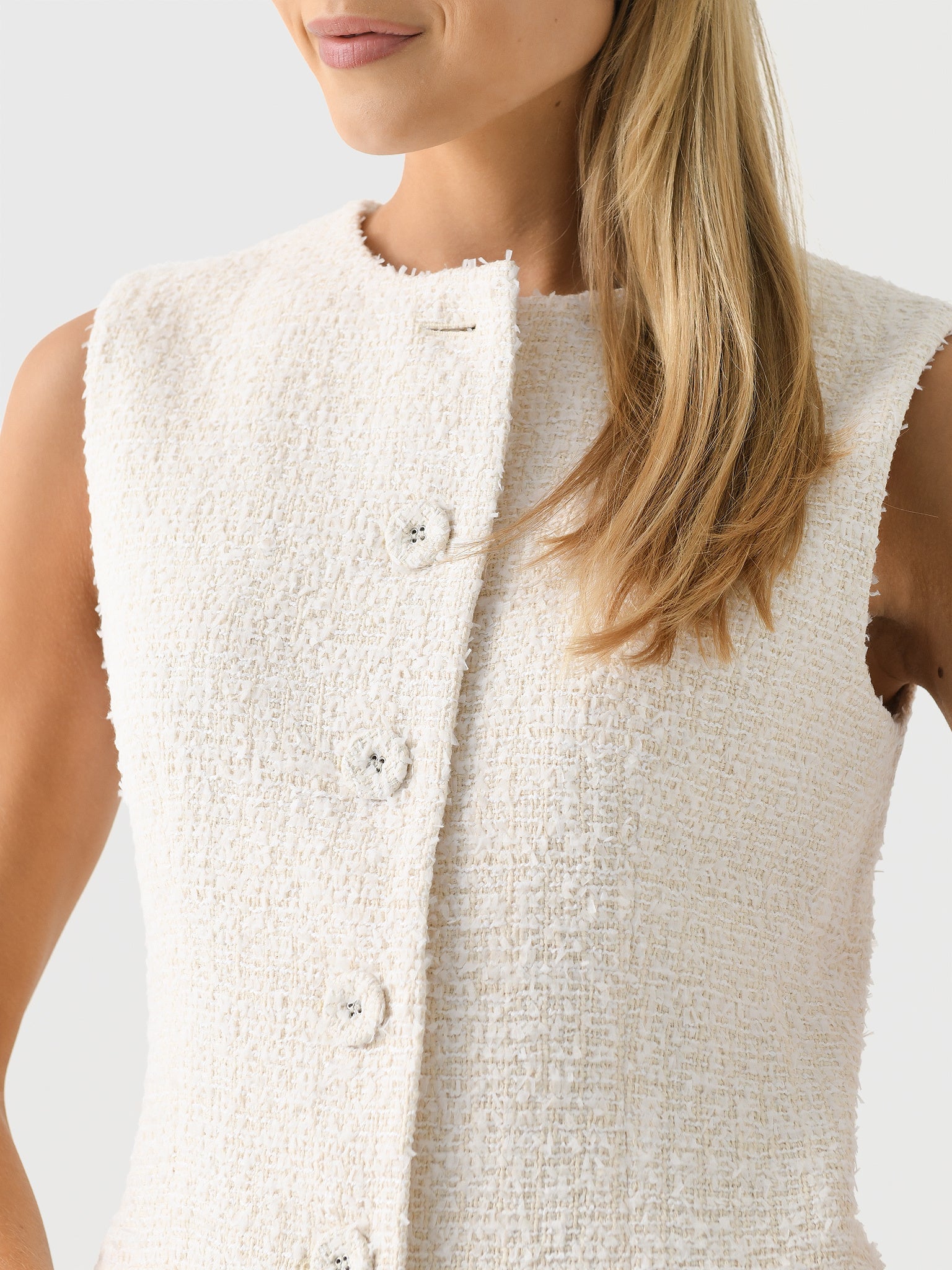 A sleeveless, tailored blouse cut from pale cream tweed and finished with flap pockets and a self-covered button-down front.