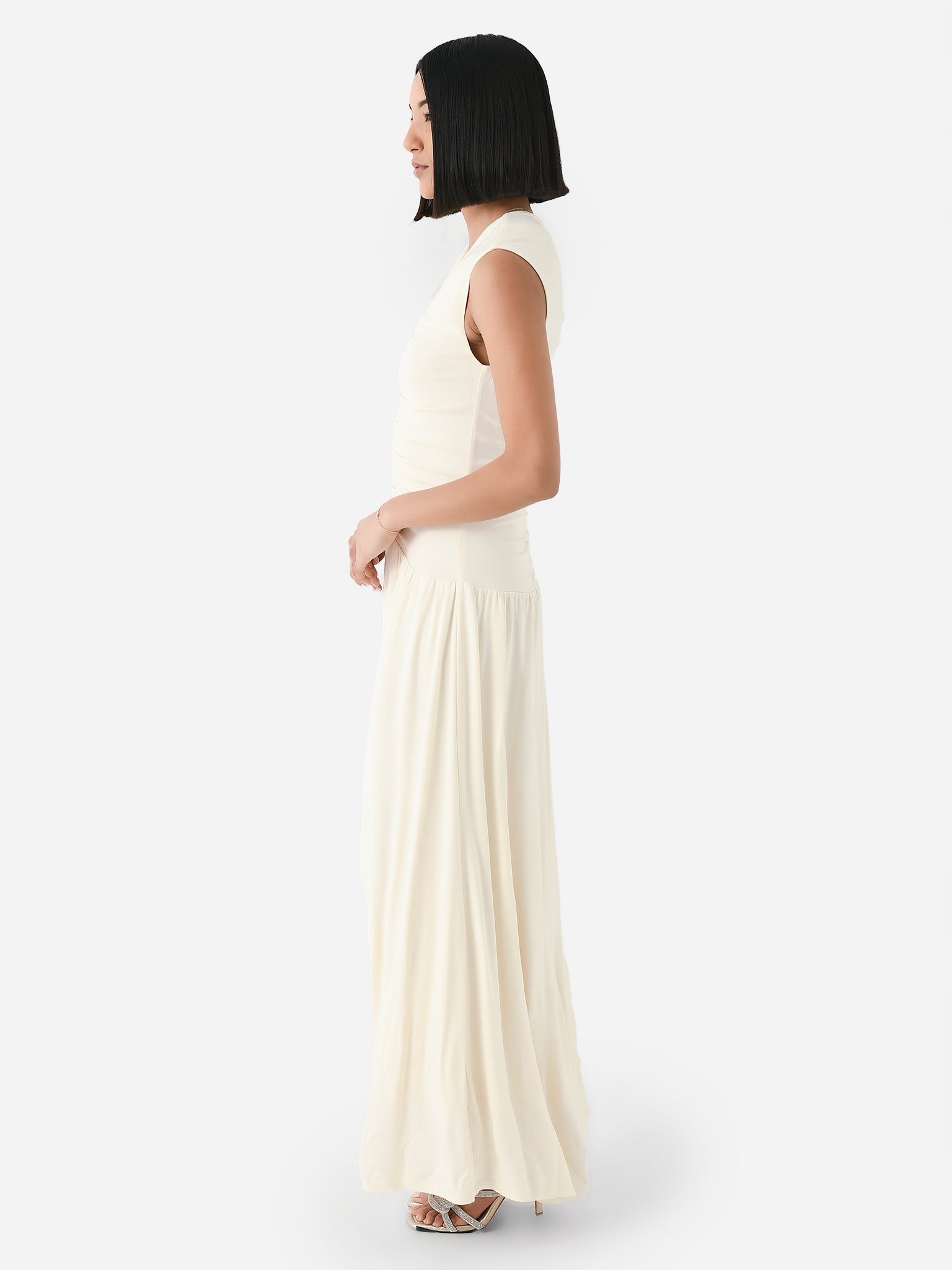 A sleeveless maxi dress with a ruched, drop-waist bodice.