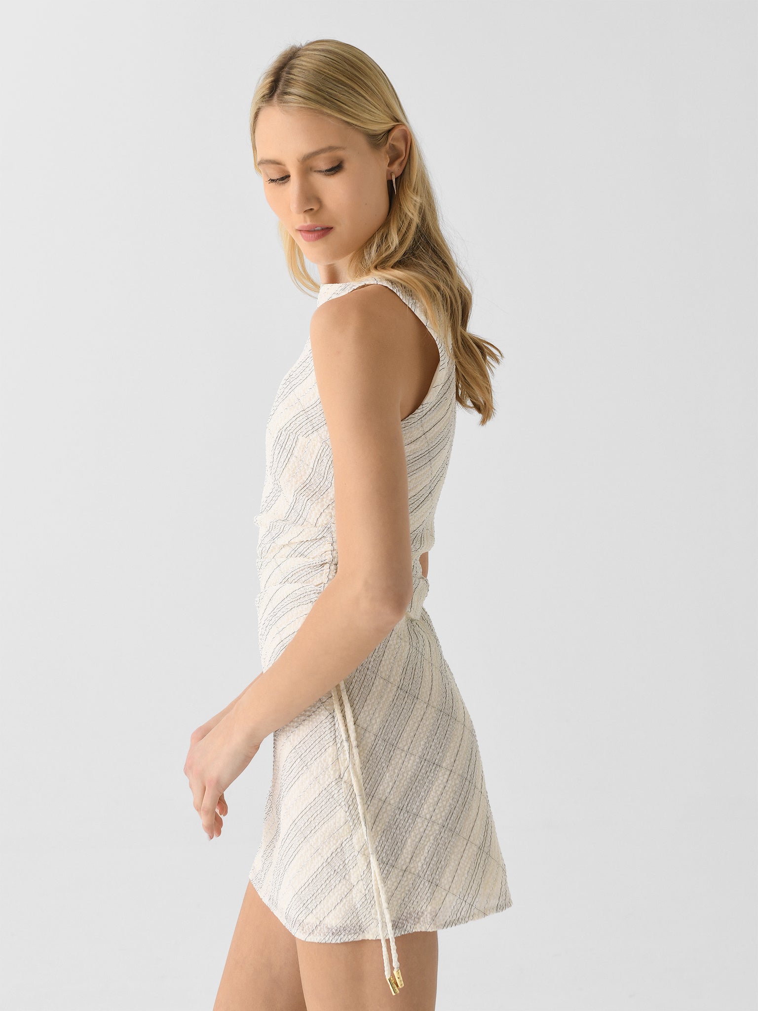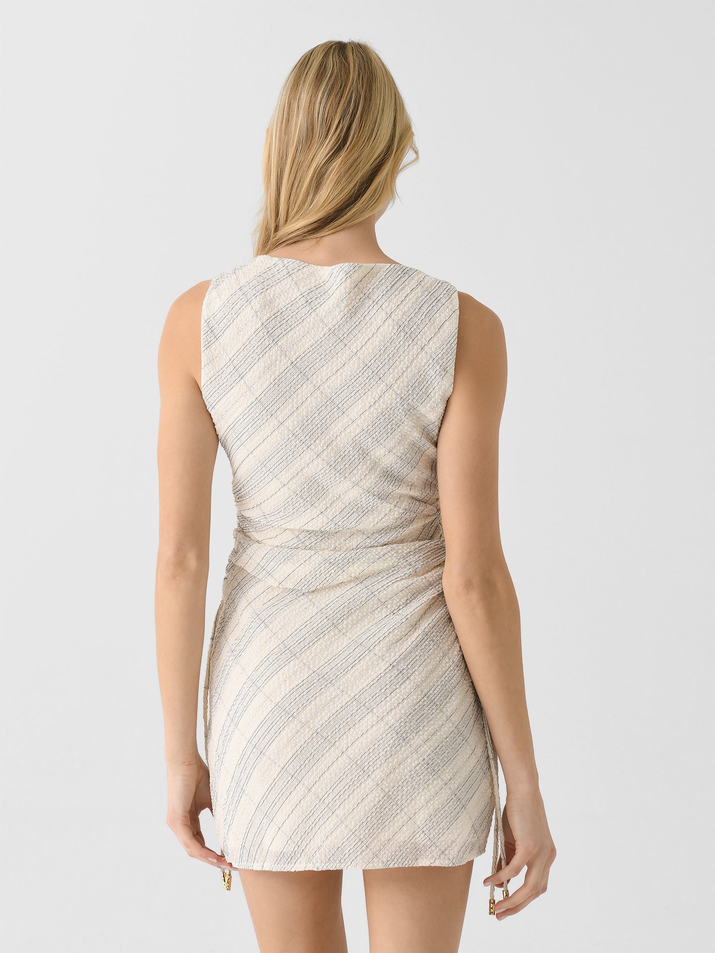 This stunning dress features intricate, textured fabric that creates a captivating interplay of light and shadow, while the adjustable side ties offer a customizable fit.