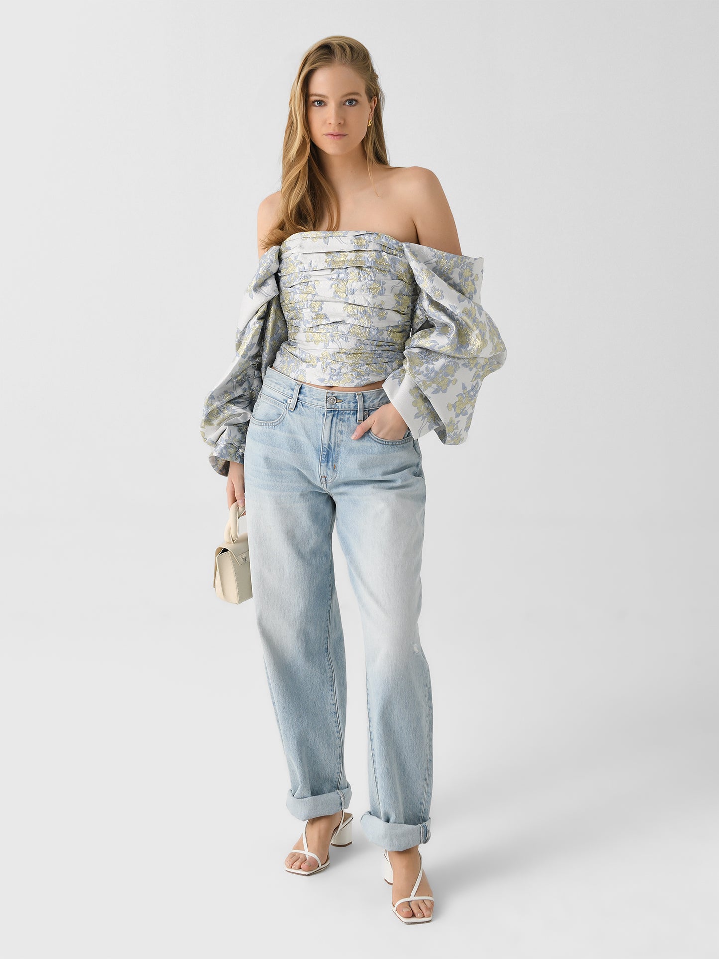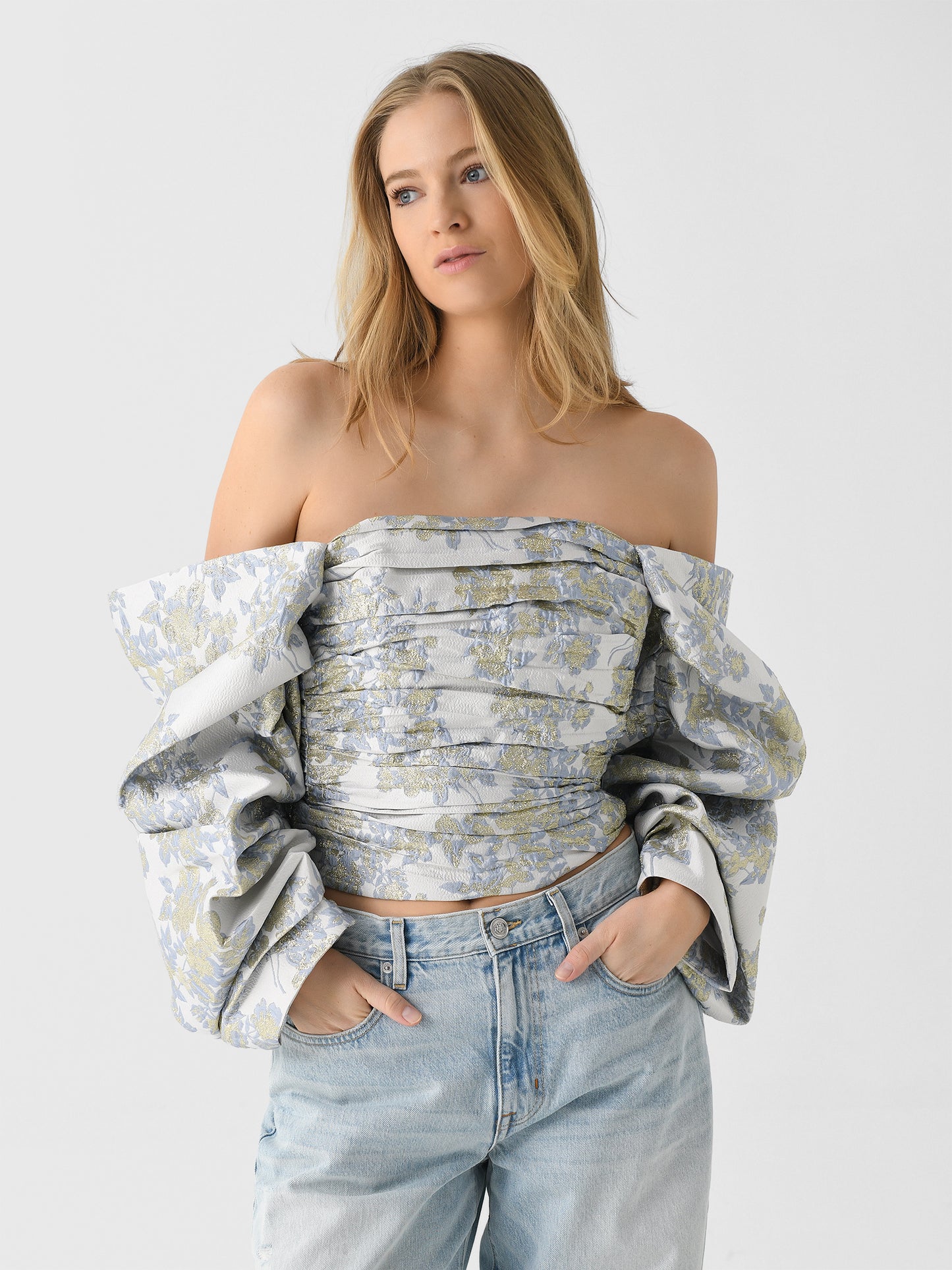 This ruched blouse, made from floral-printed jacquard fabric, features a ruched design with voluminous sleeves. It's perfect for your next night out.