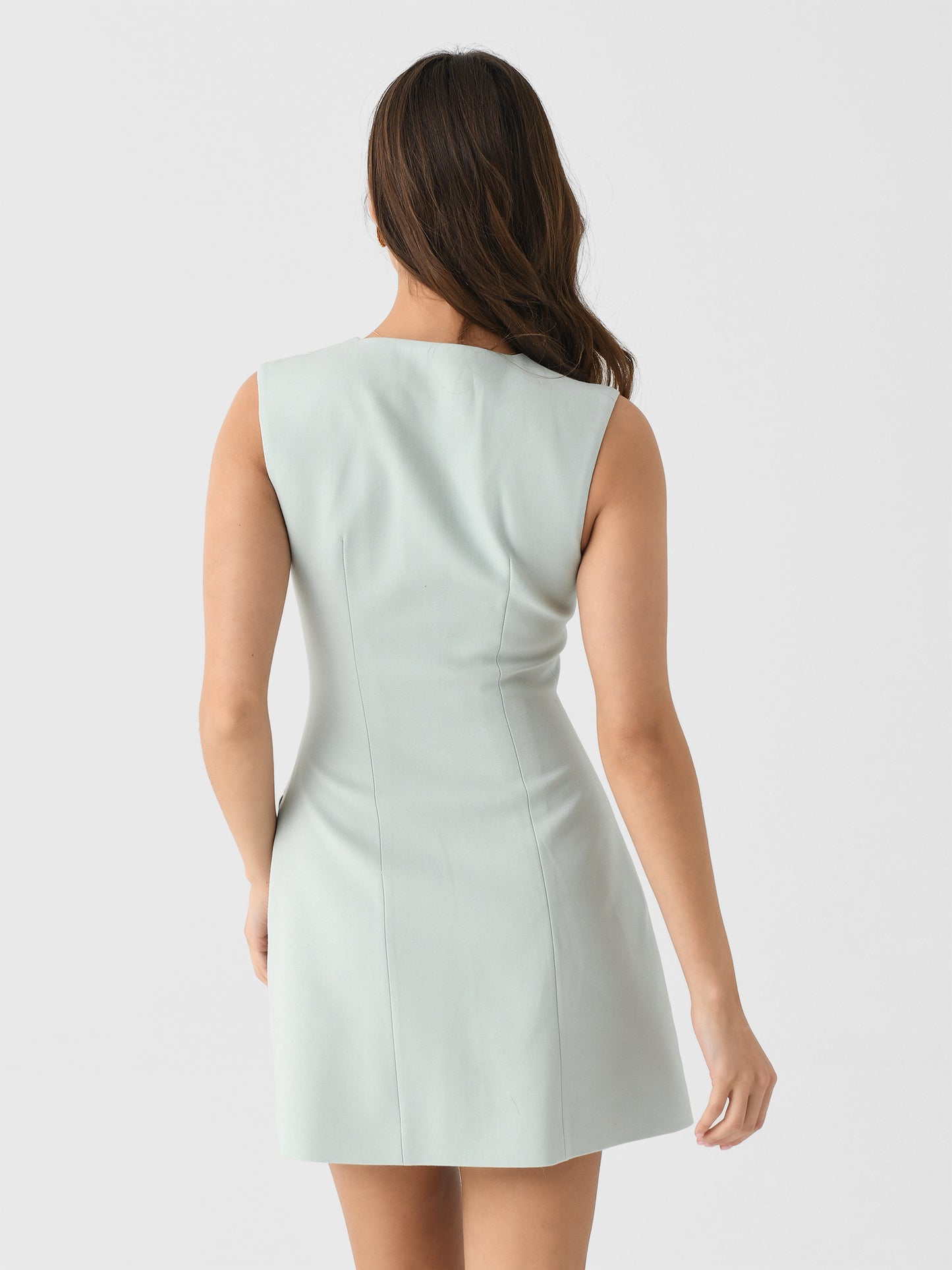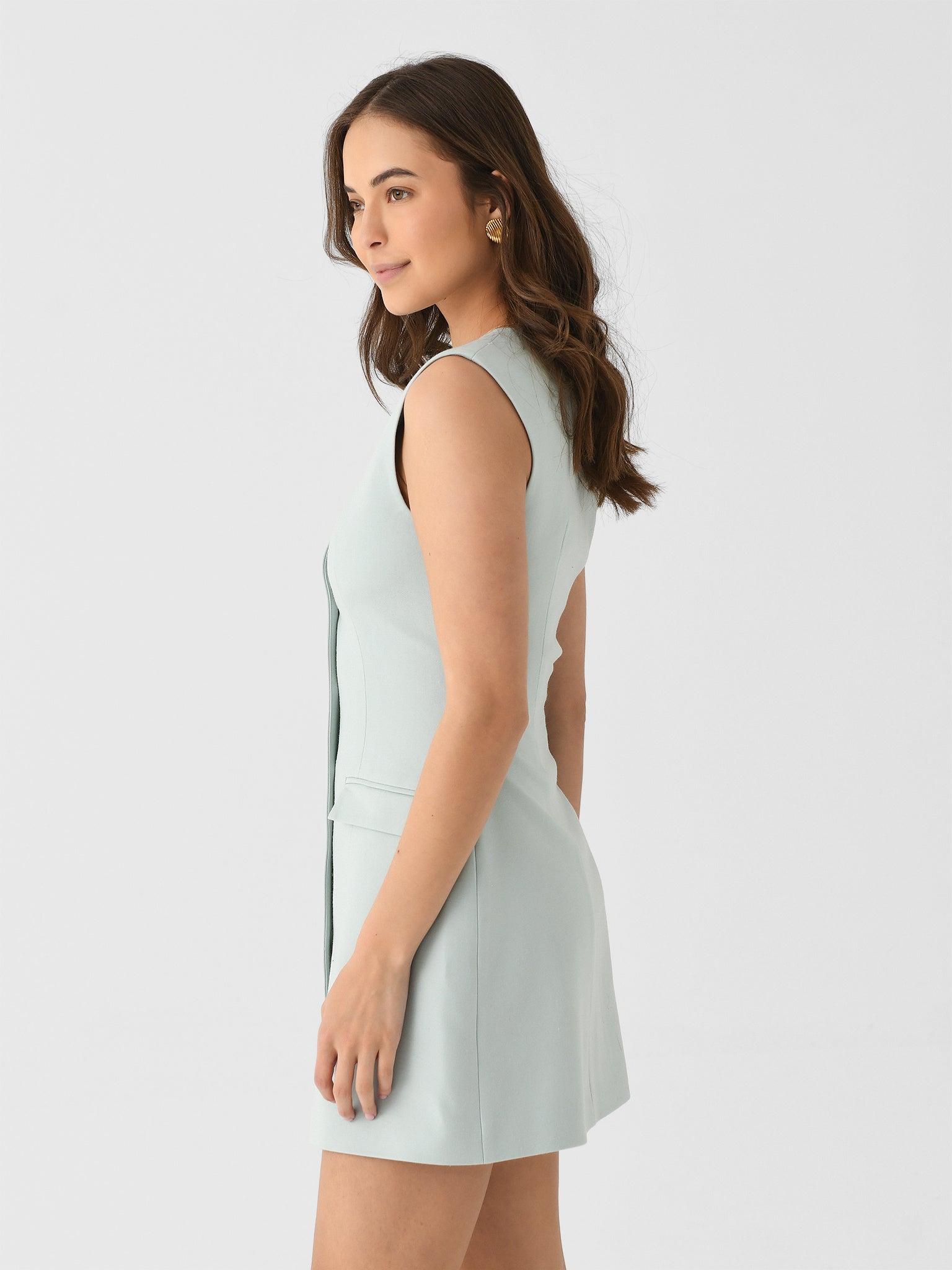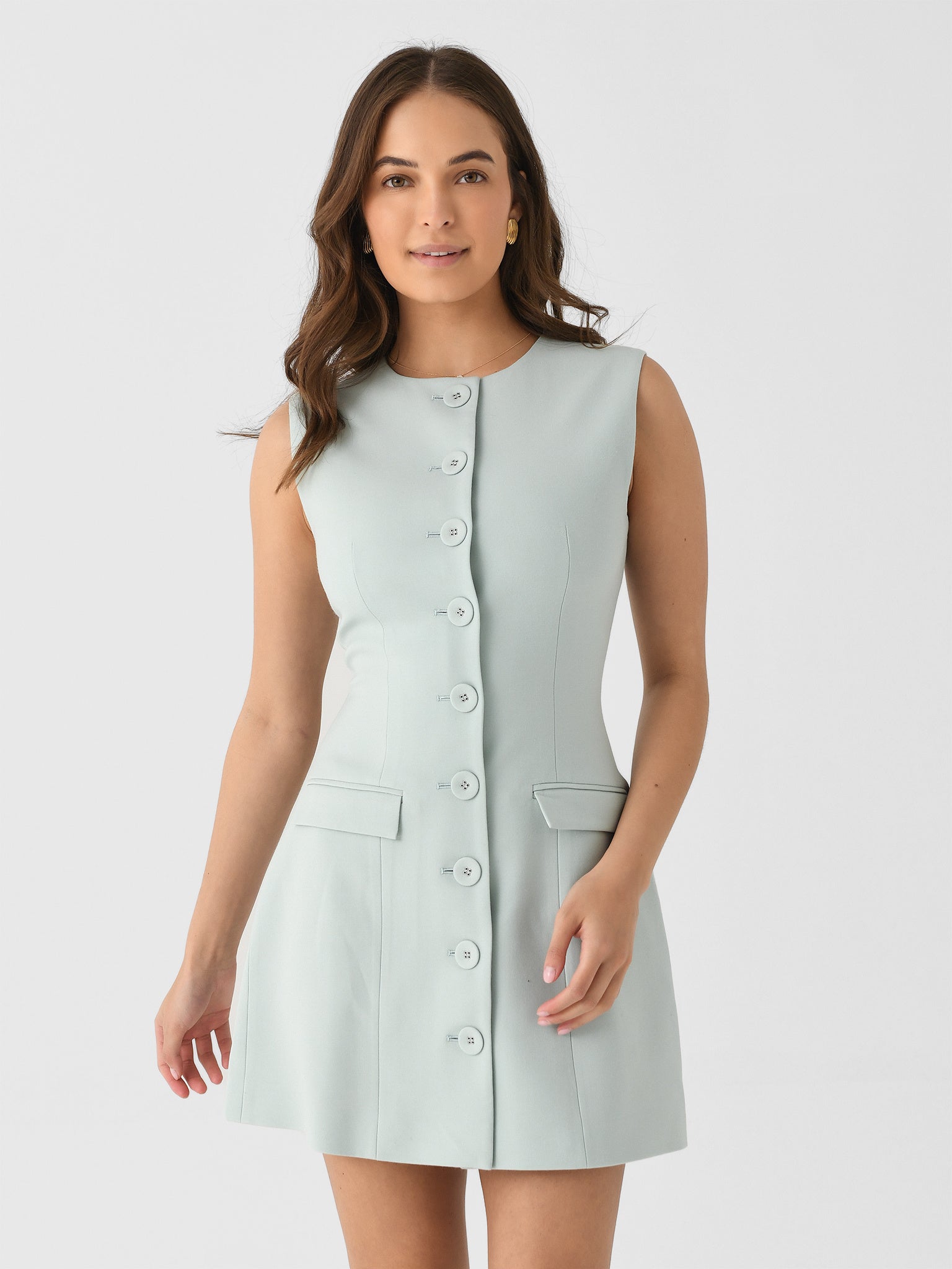 This sleeveless mini features a flattering silhouette crafted from a lightweight wool blend, self-covered buttons, functional flap pockets, and a full lining.