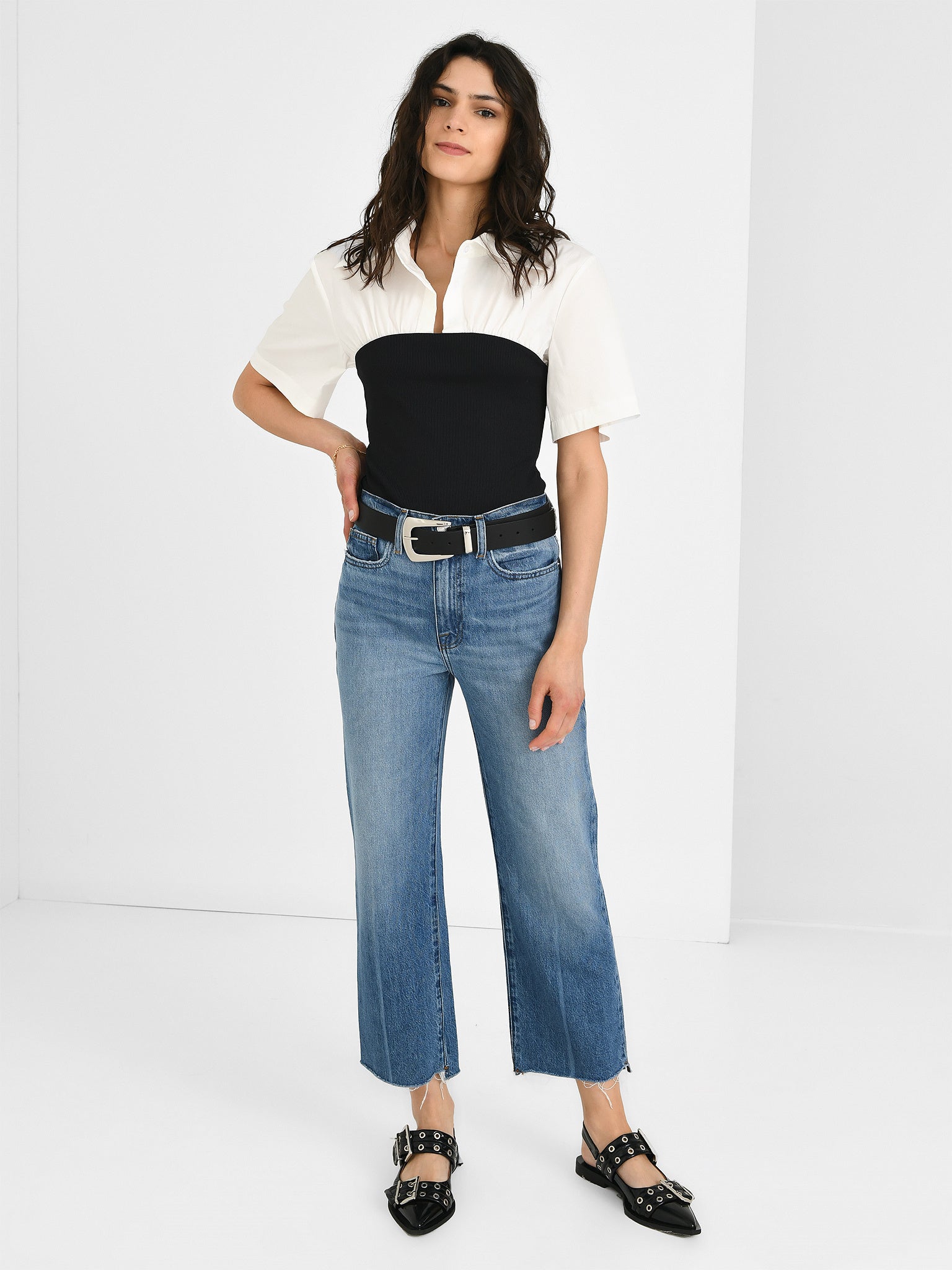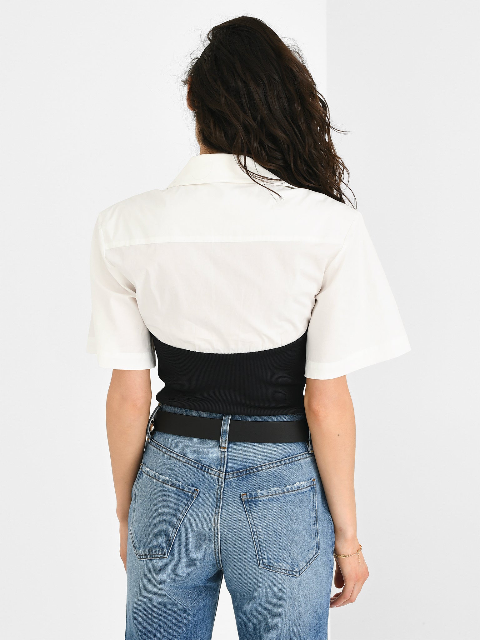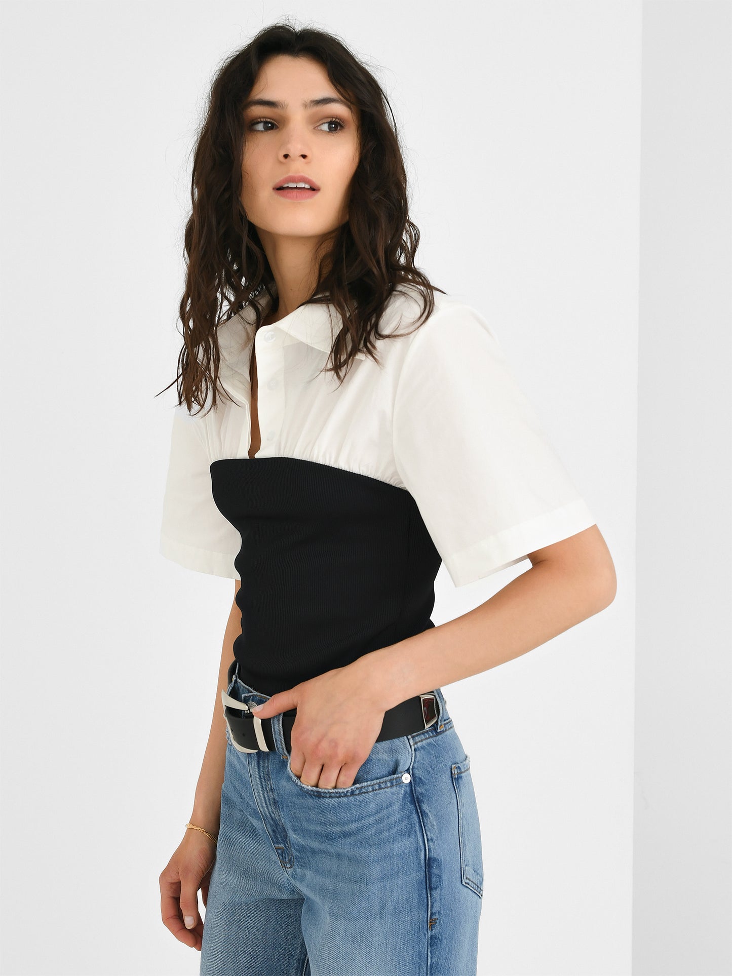 A tailored, short-sleeve blouse featuring a contrast jersey bodice.