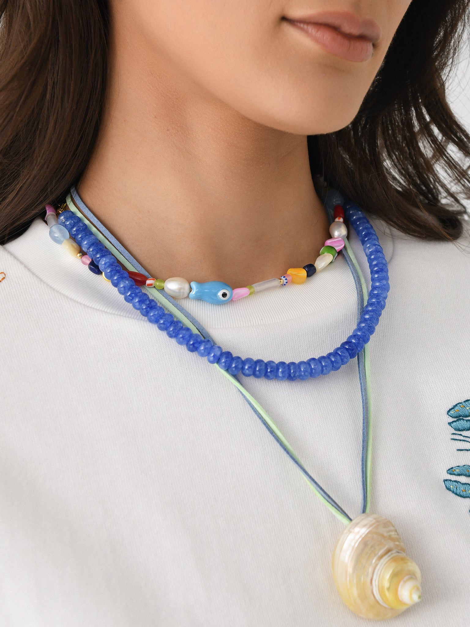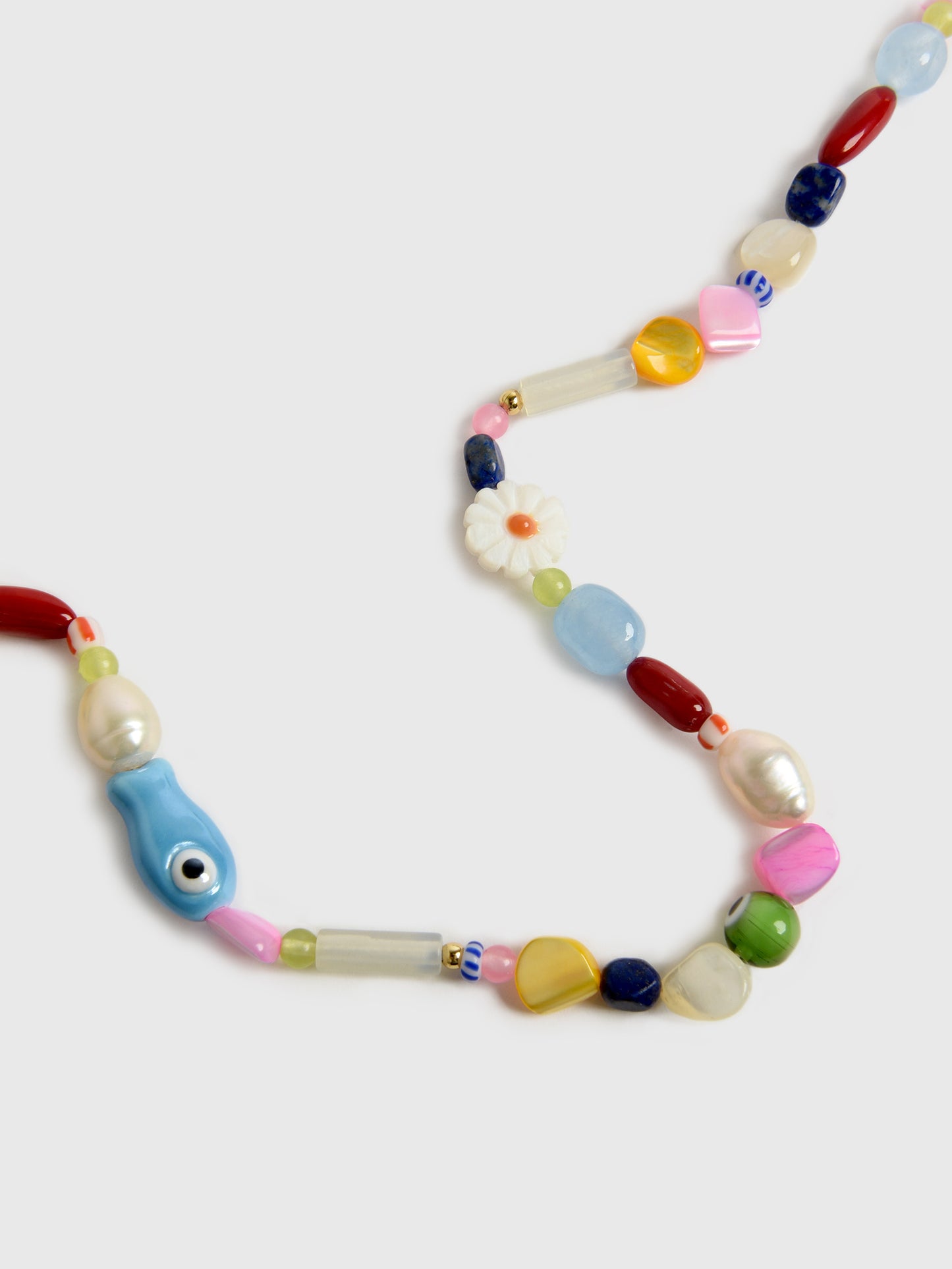 The Happy Necklace features a playful mix of materials and soft colors that perfectly capture the carefree spirit of summer.