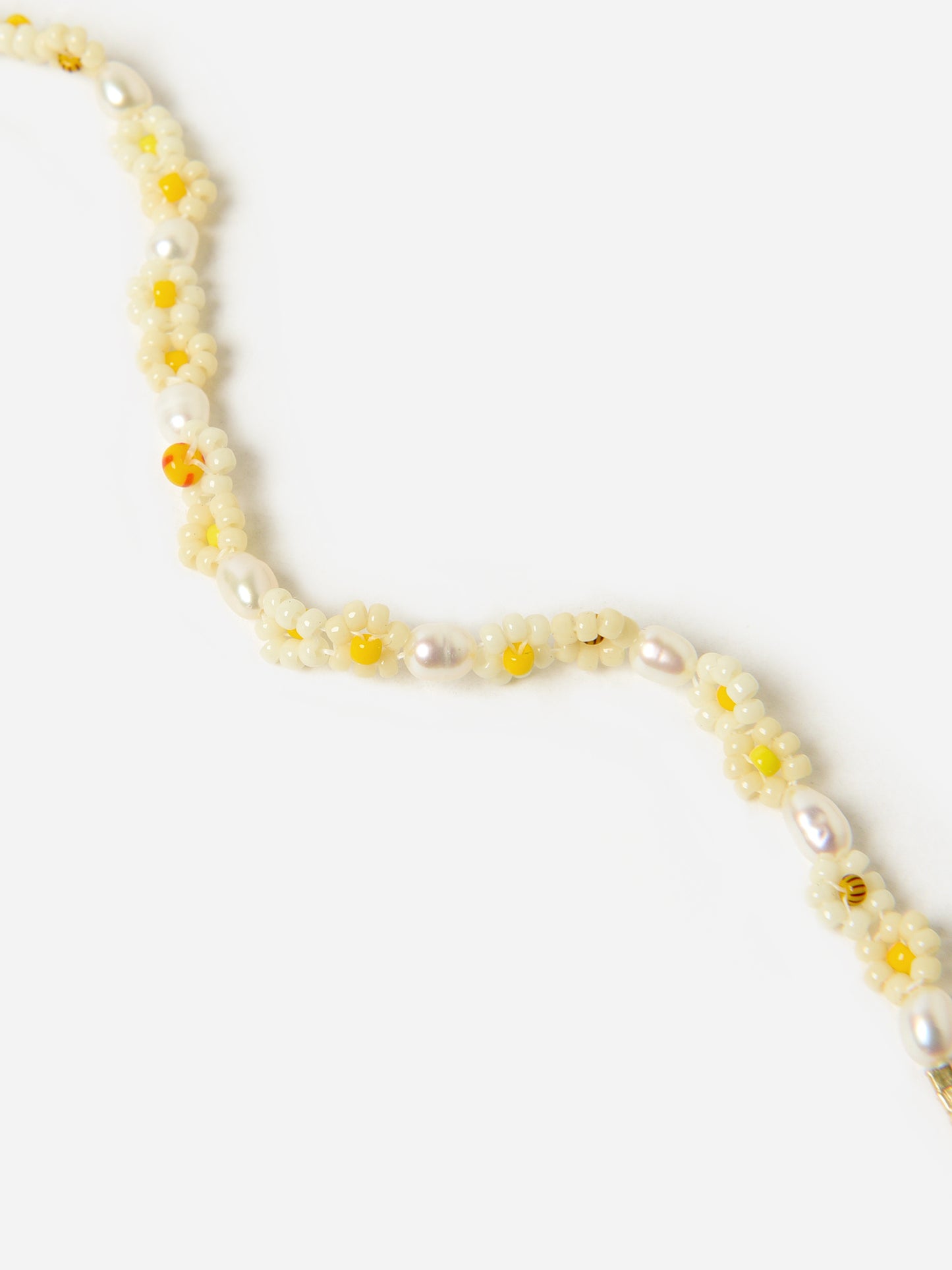 An 18-karat gold-plated brass bracelet featuring handcrafted beaded daisies using old and traditional Mexican Huichol technique.