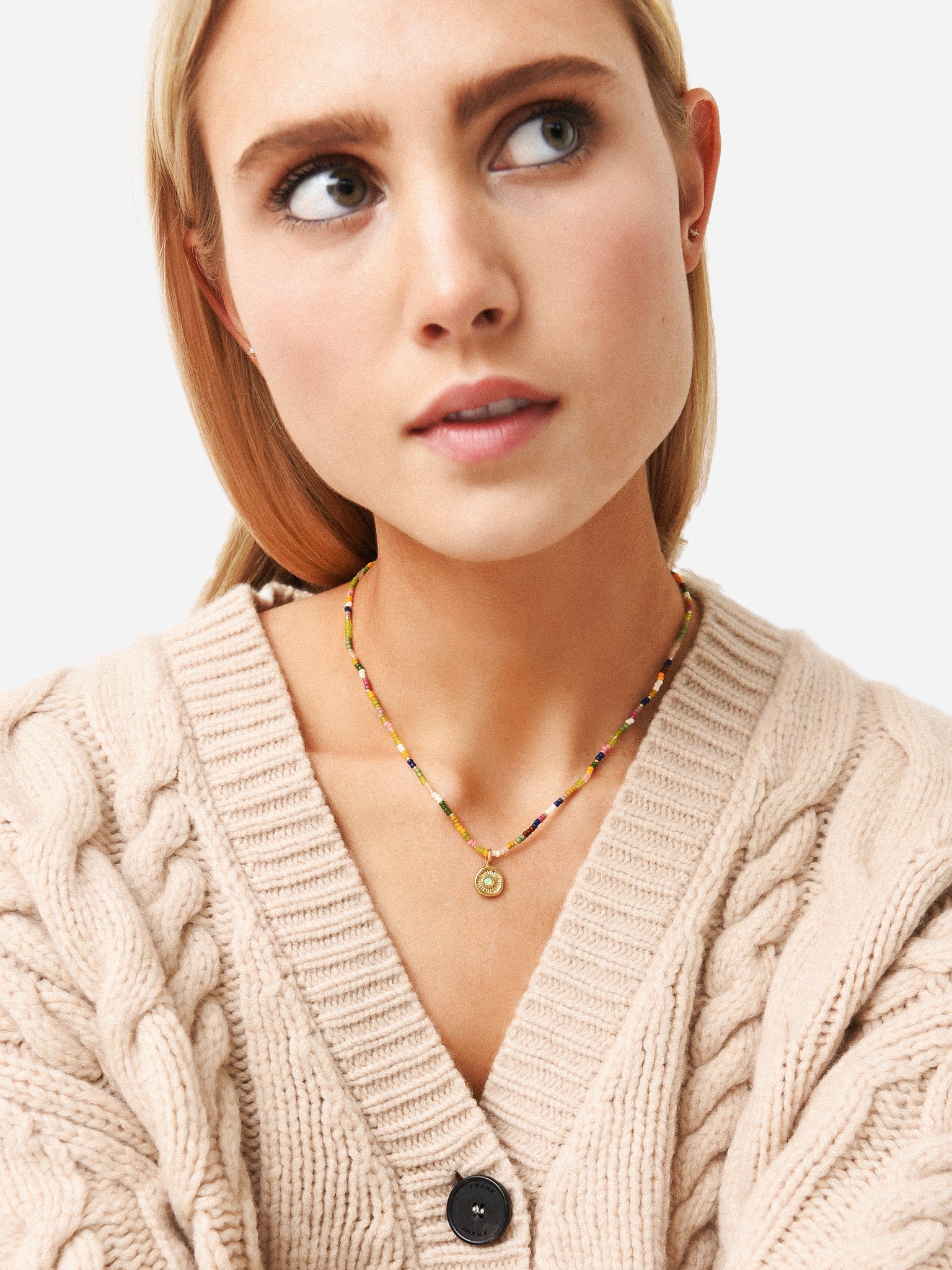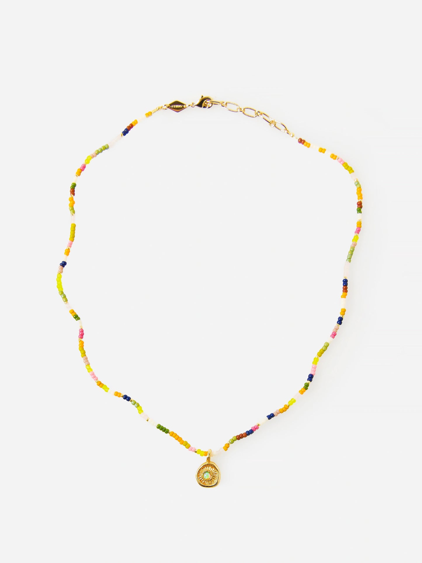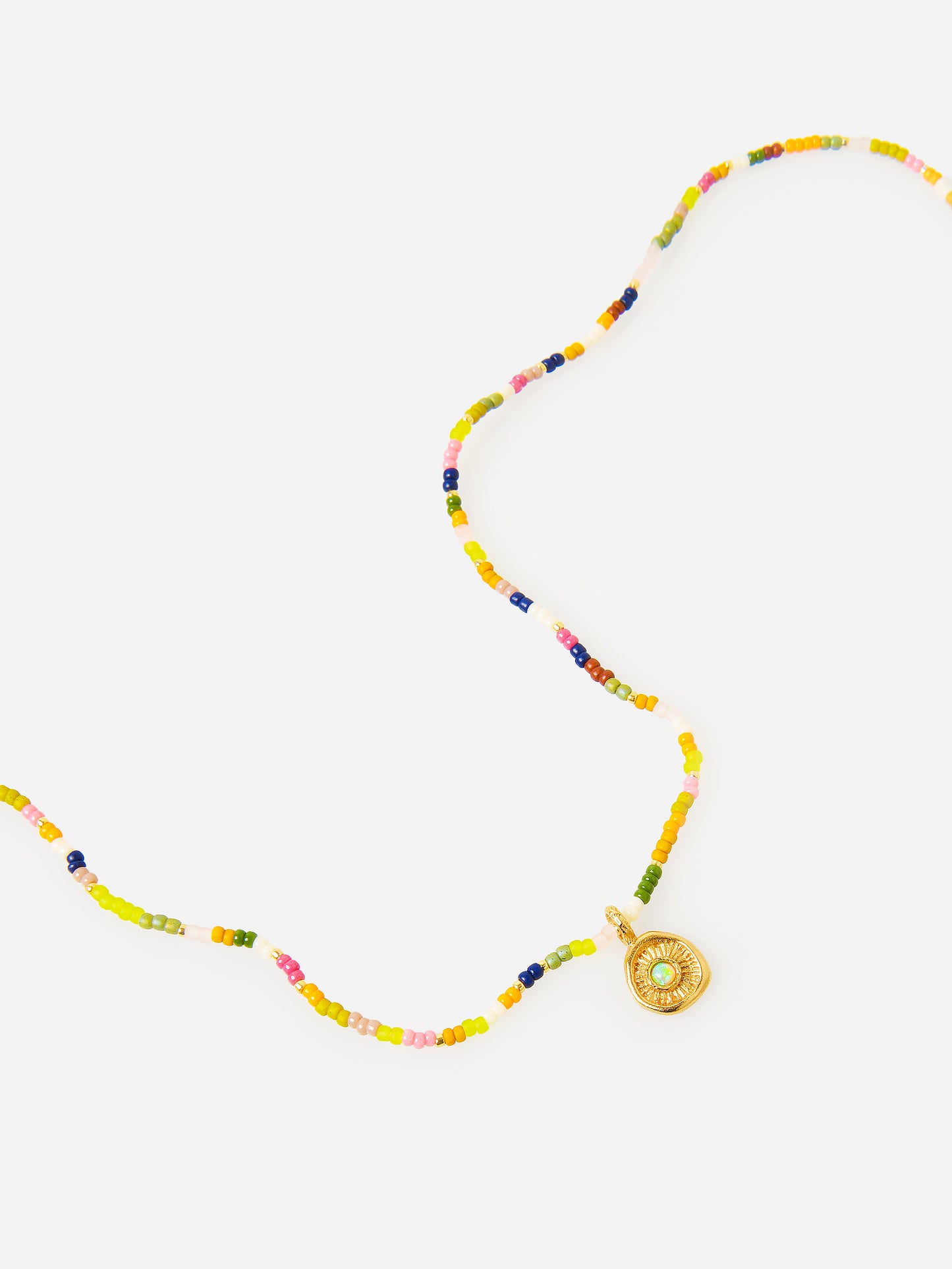 18-karat gold plated necklace with glass beads and a pendant detail.