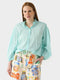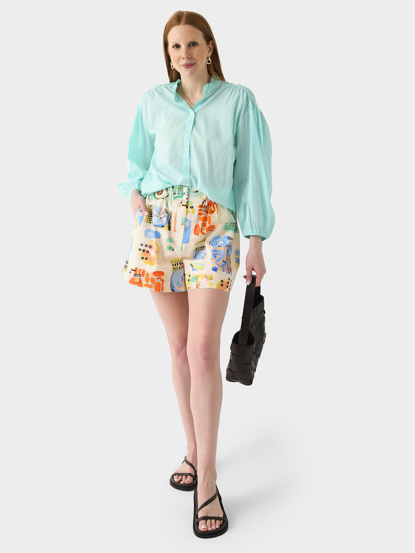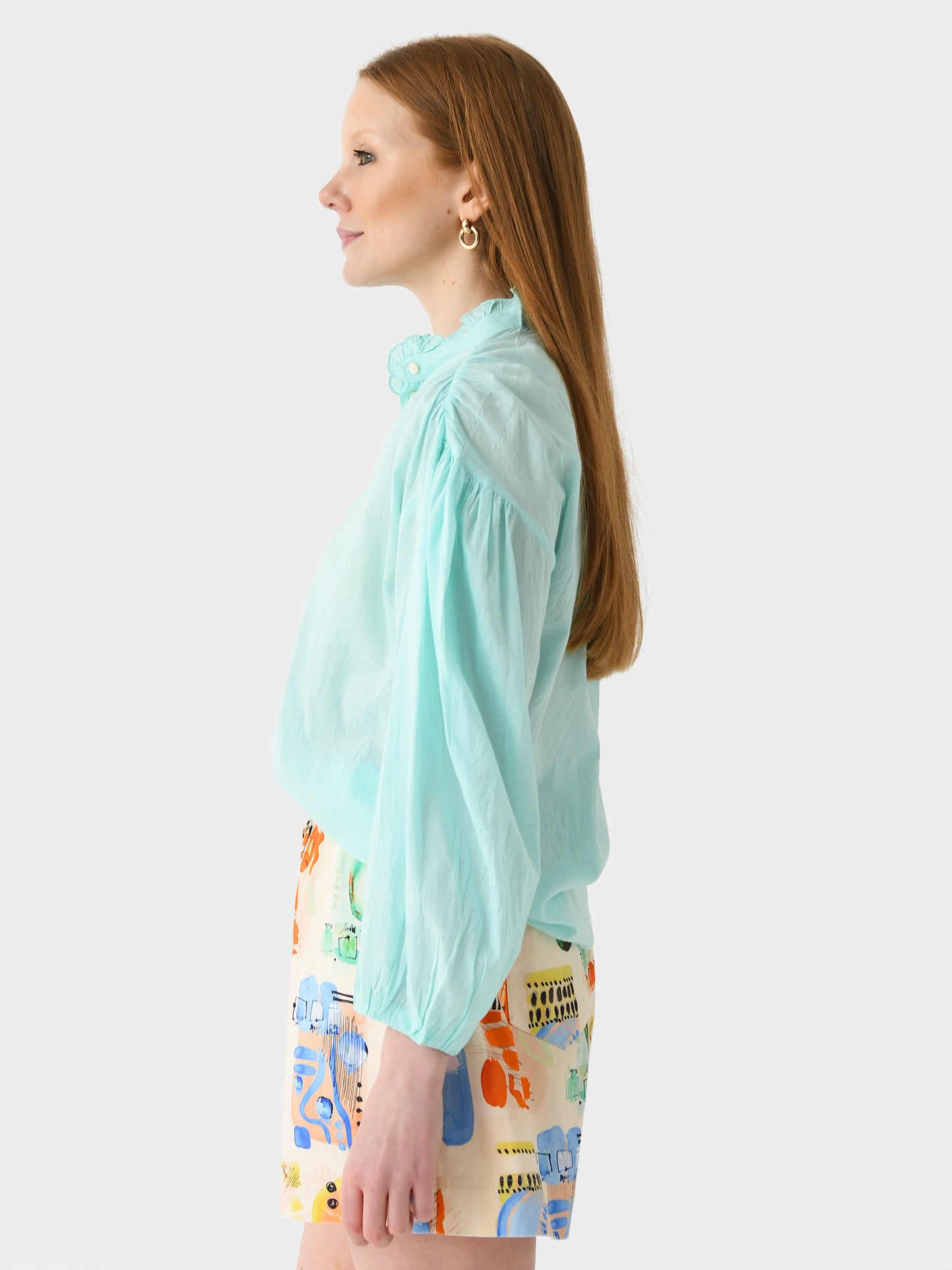 A feminine blouse with a ruffle collar, a gathered shoulder design, and balloon sleeves.
