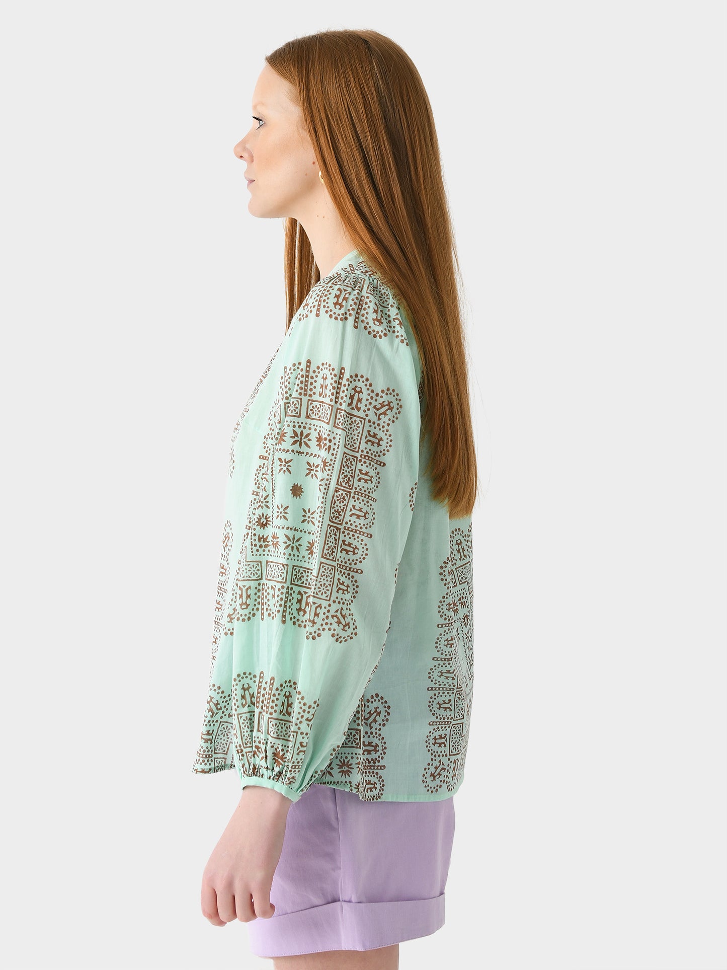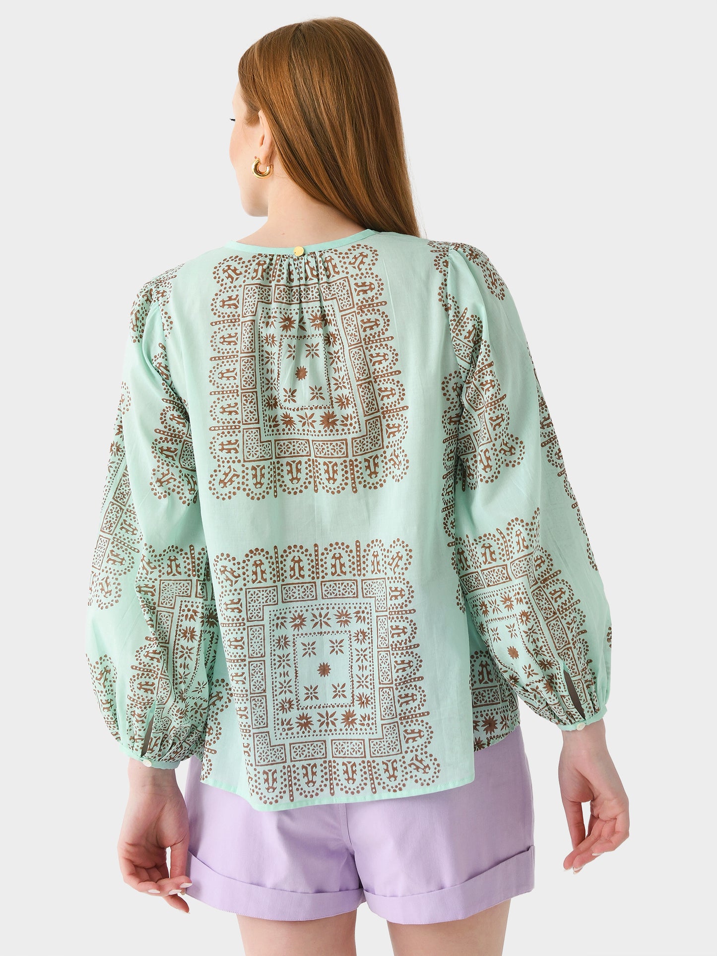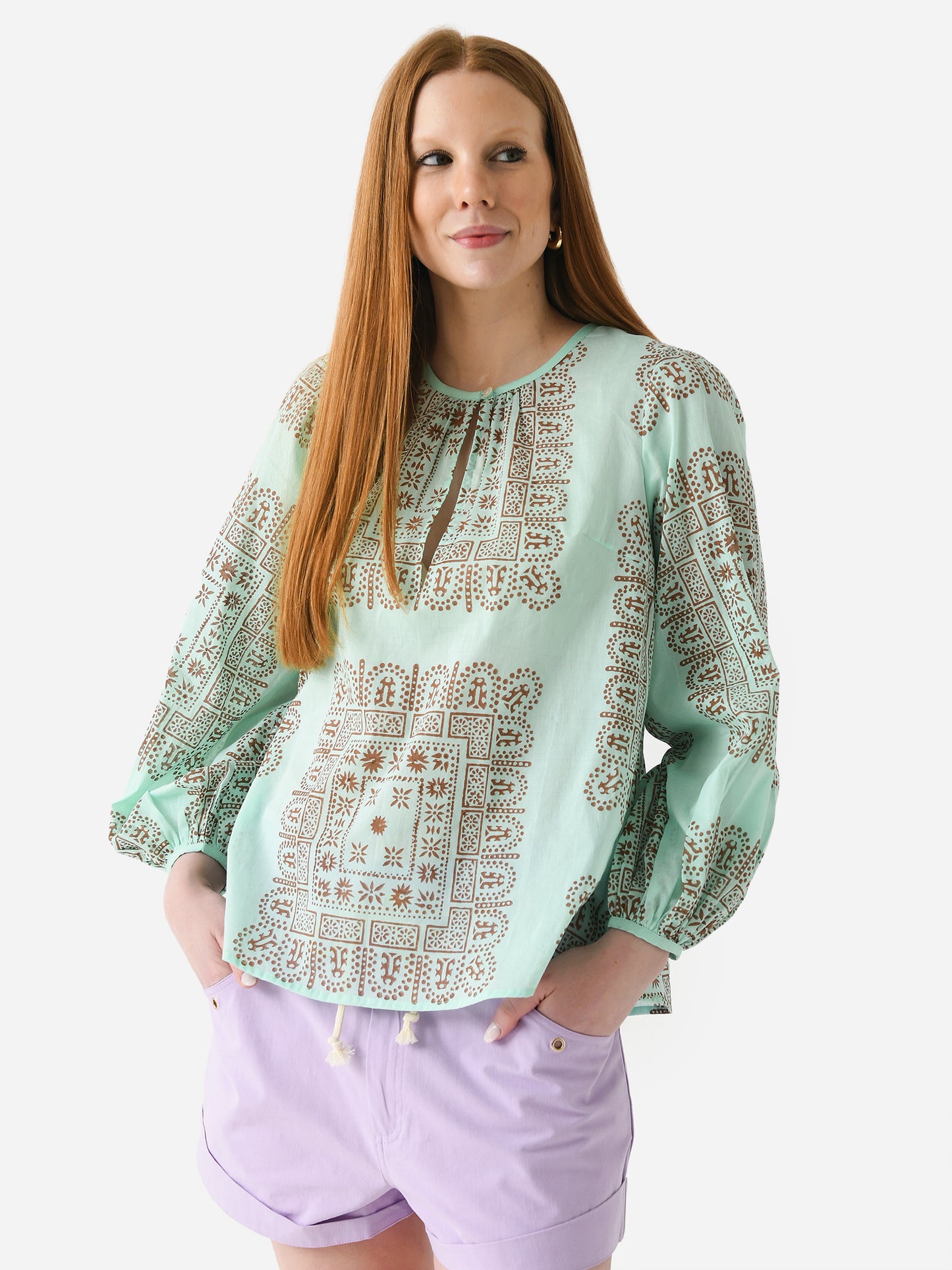 A cotton voile blouse featuring a keyhole neckline and a custom block print.