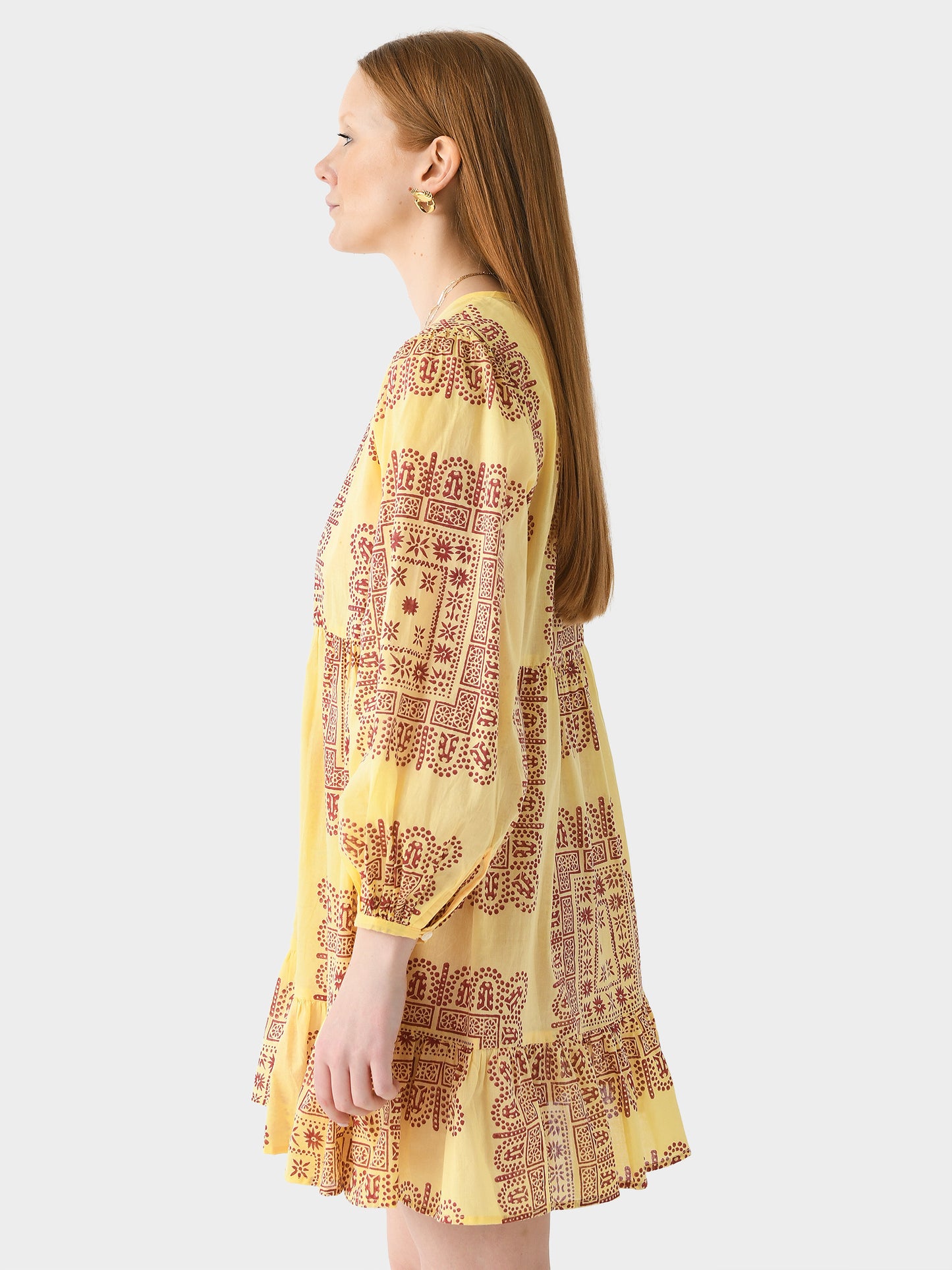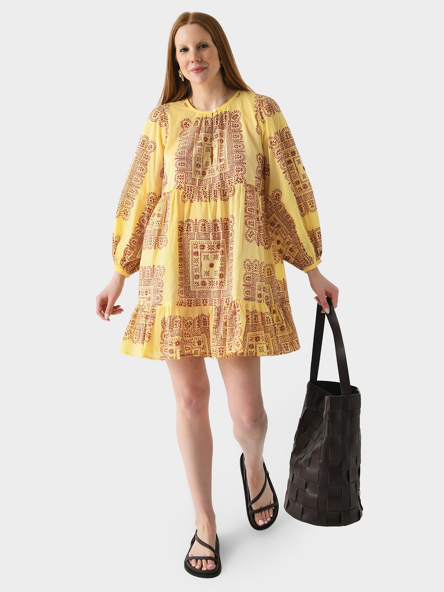A vibrant mini dress constructed from cotton voile with a custom block print.