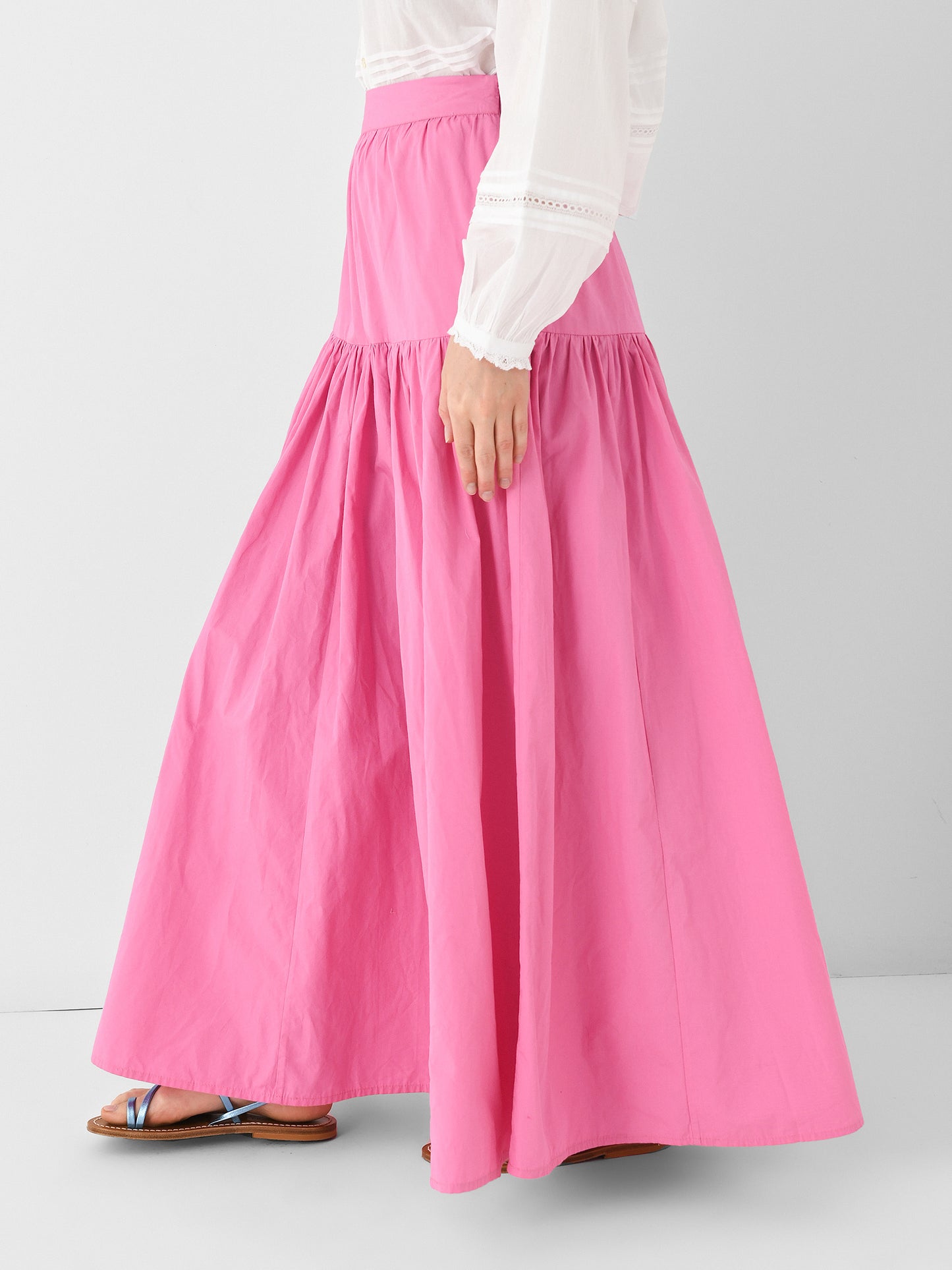 A vibrant maxi-length skirt made from crisp poplin with a tiered design.