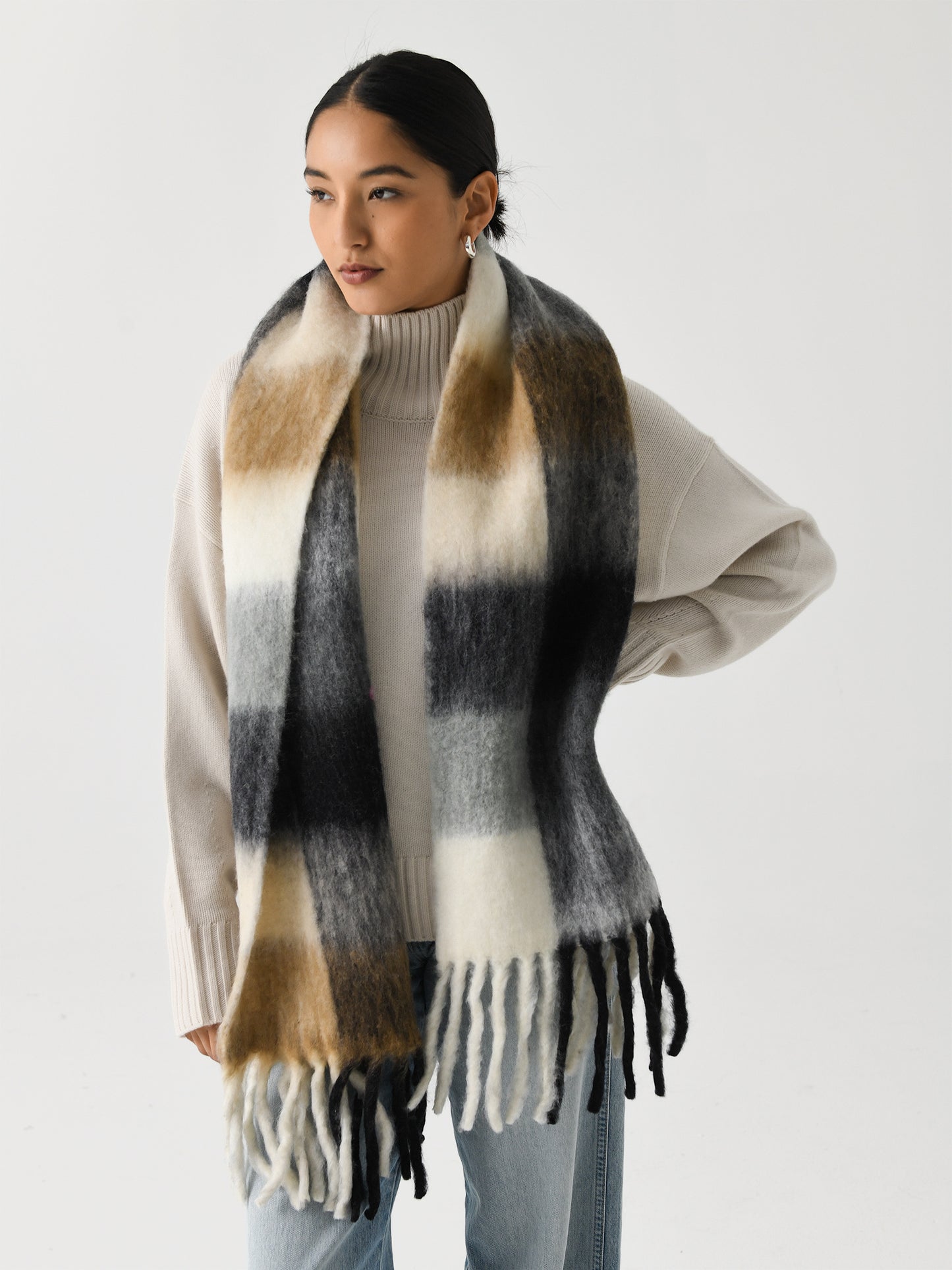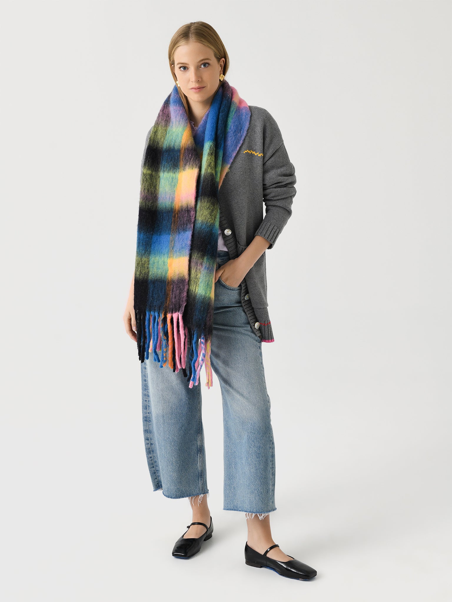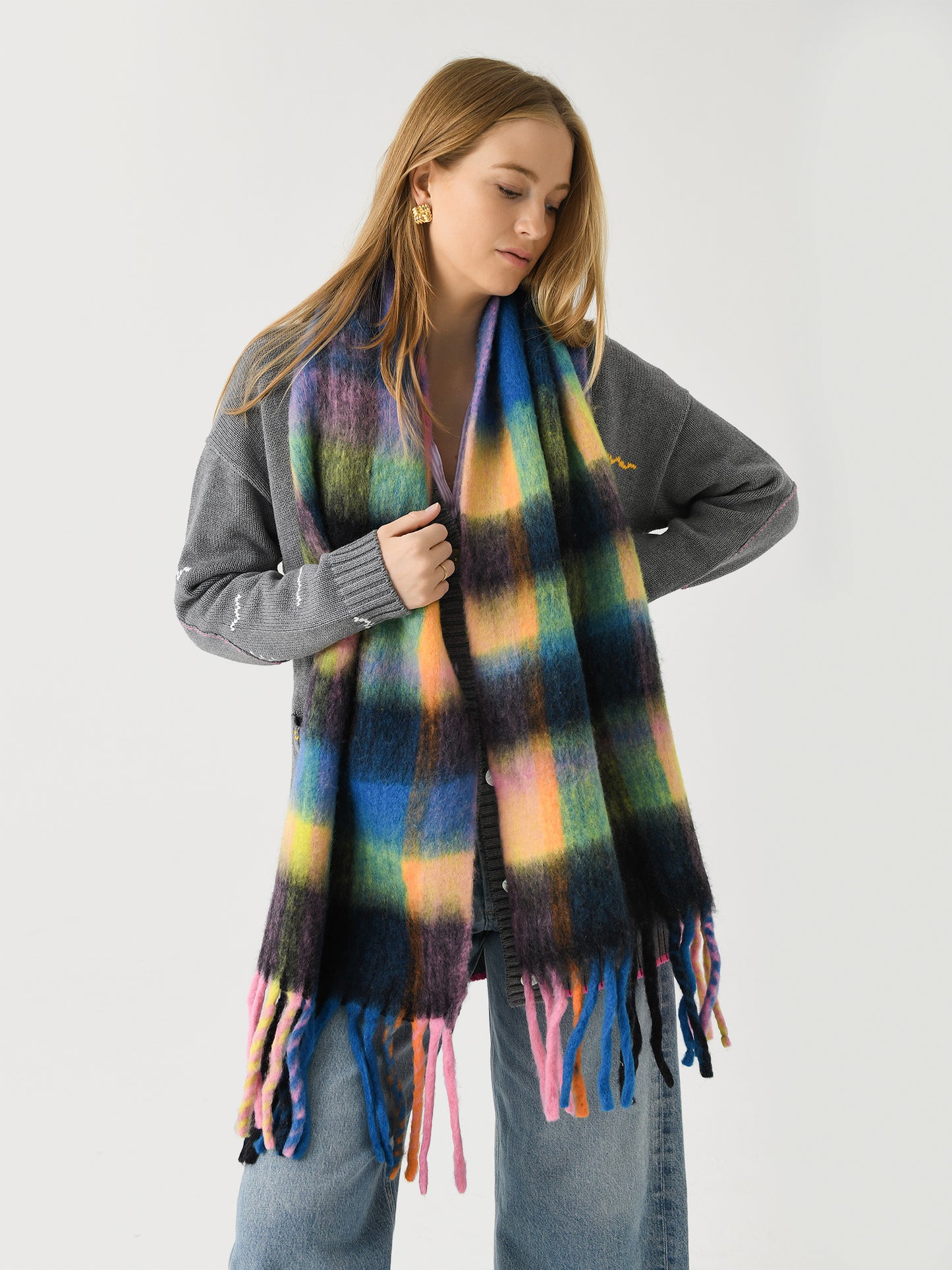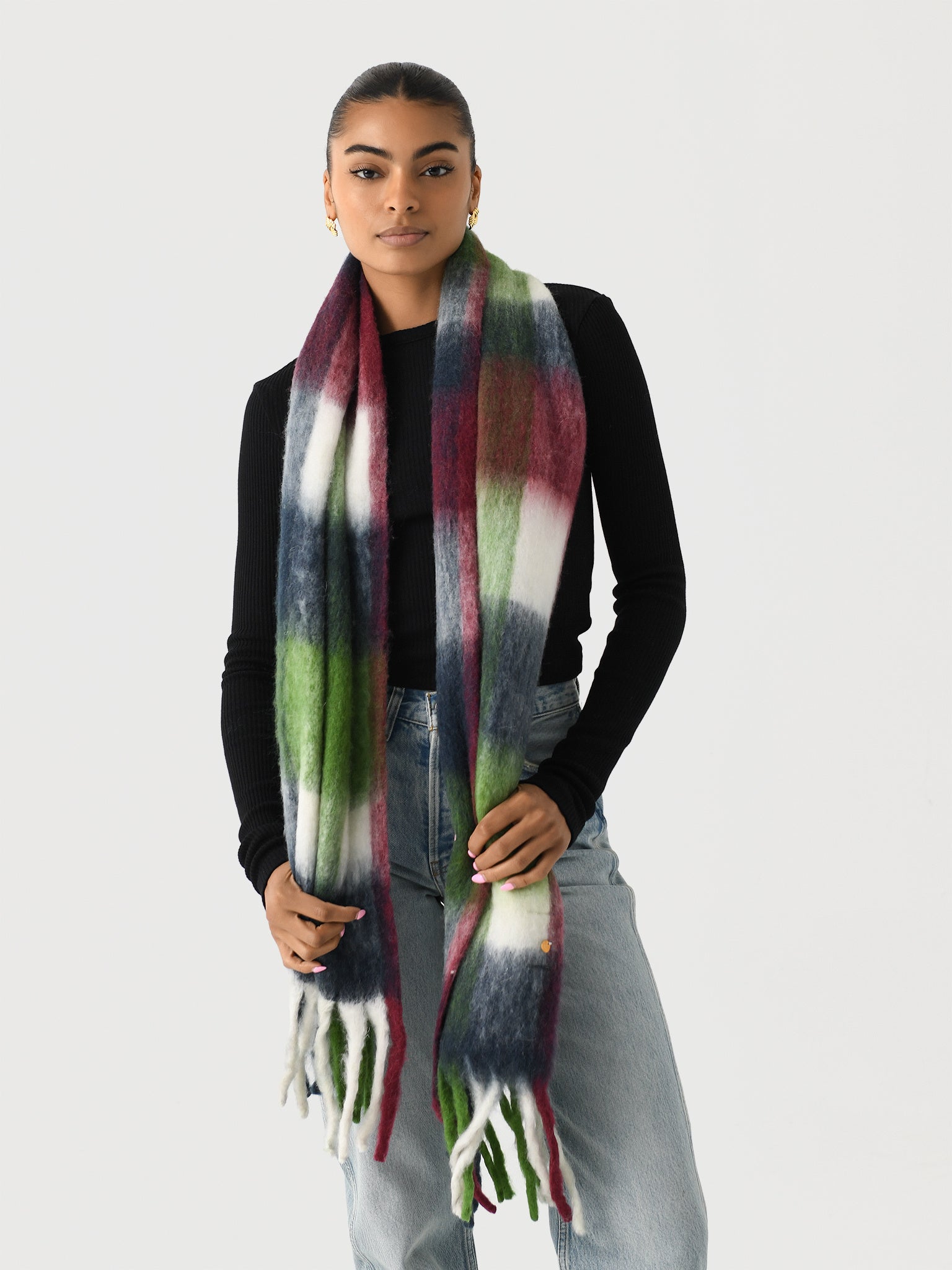 A multi-colored plaid scarf made from a wool blend brushed knit and finished with fringe trims.