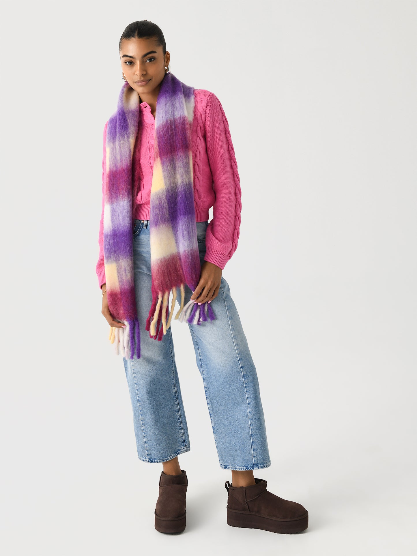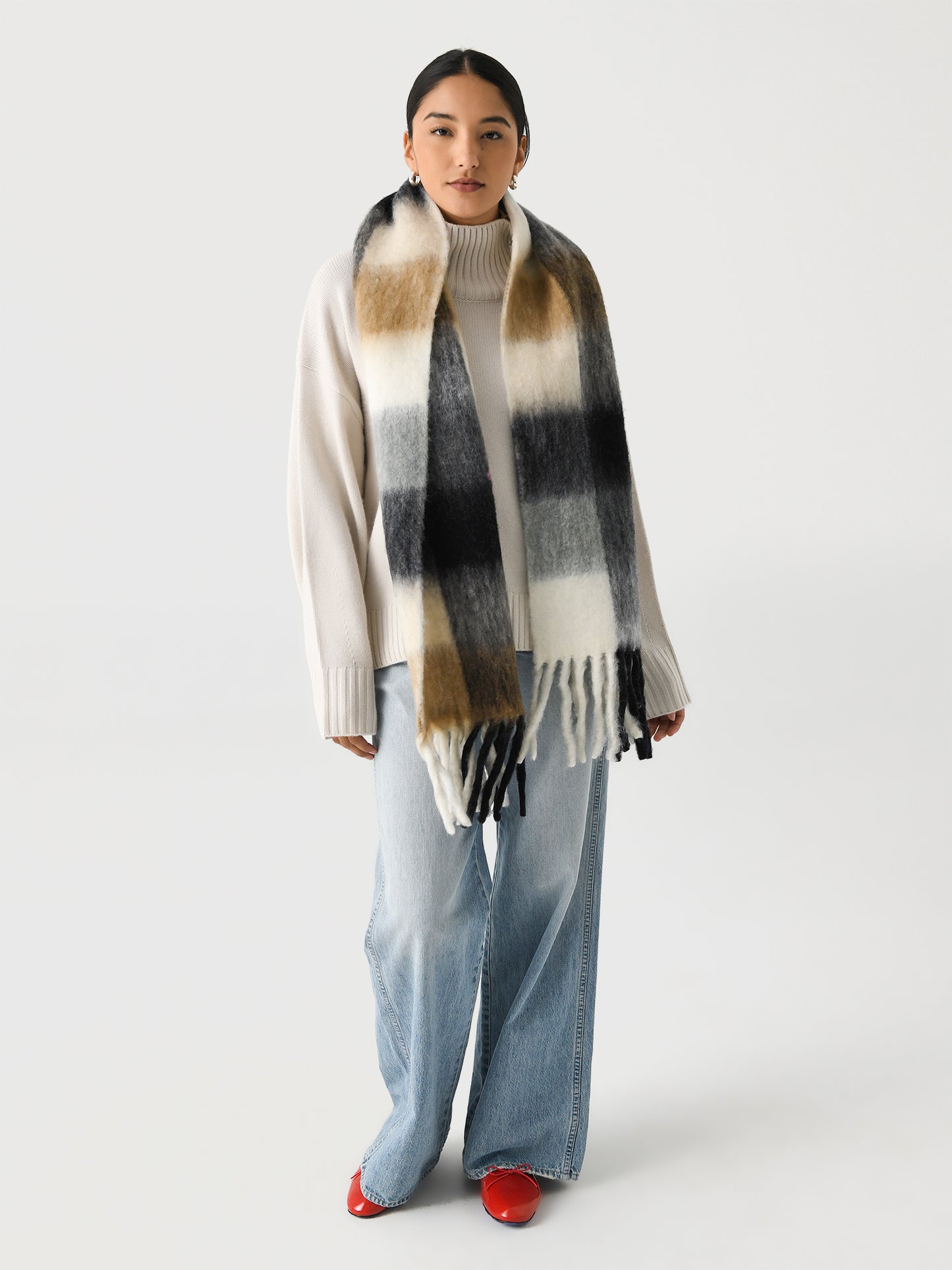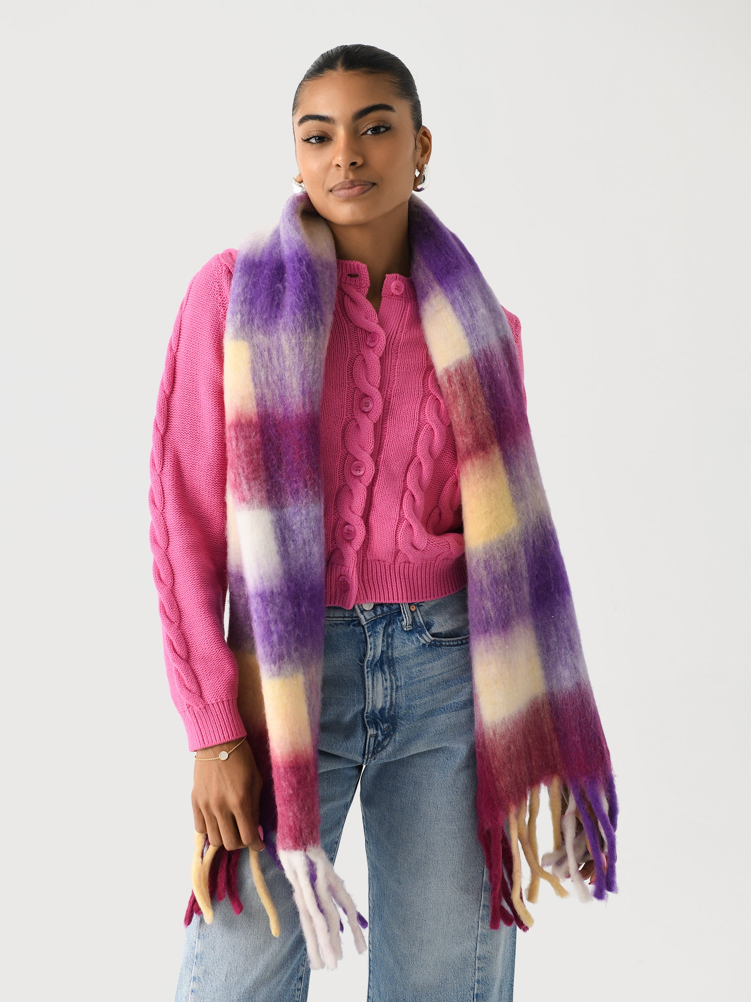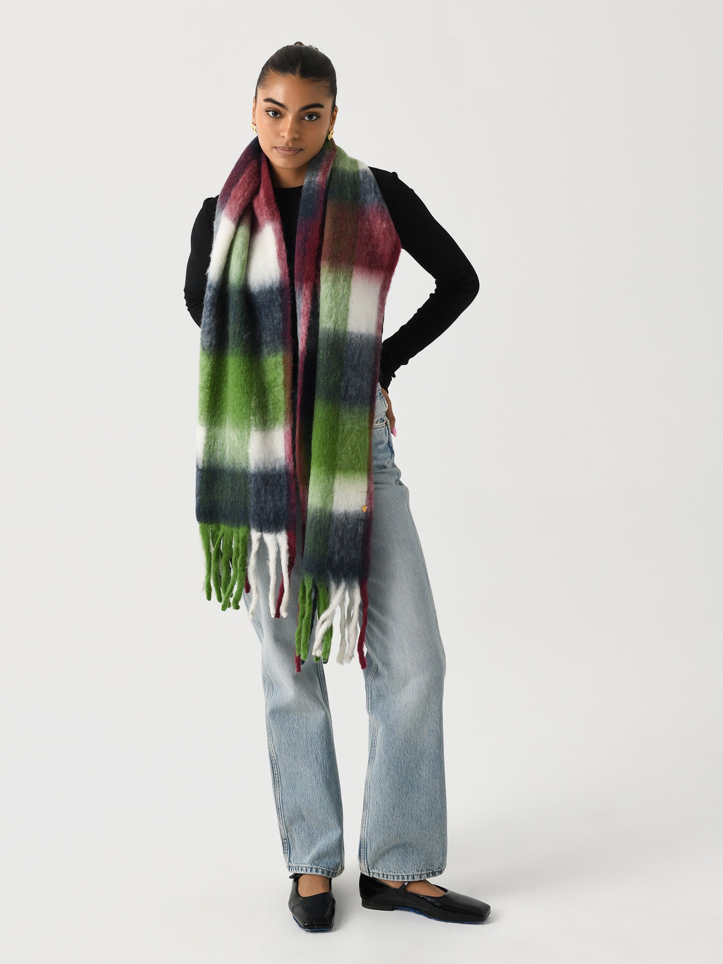 A multi-colored plaid scarf made from a wool blend brushed knit and finished with fringe trims.