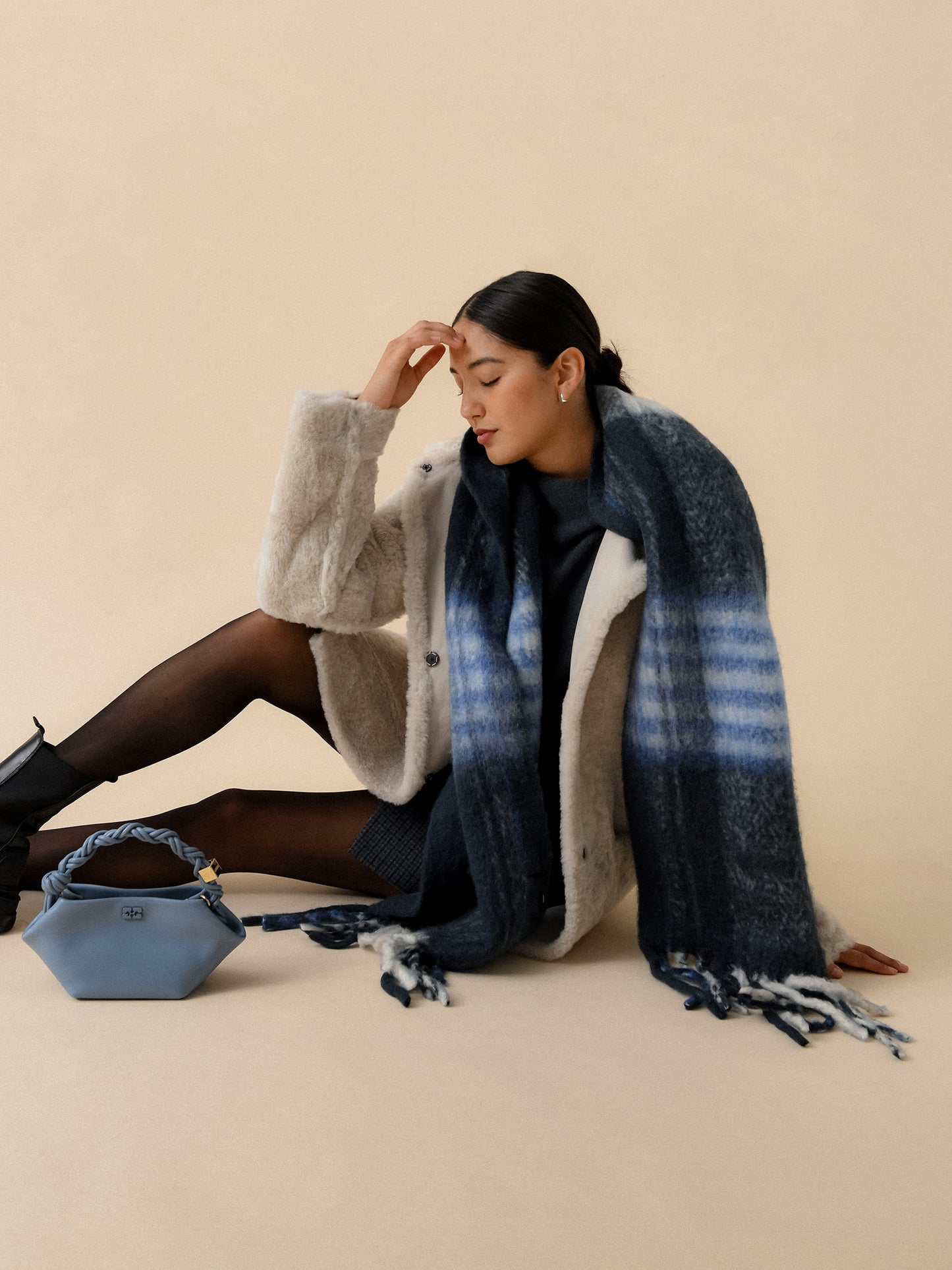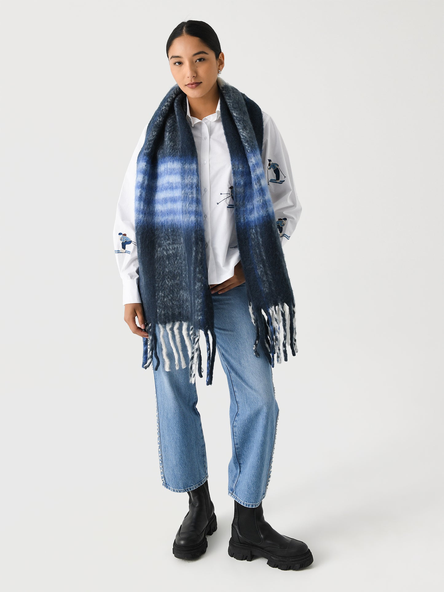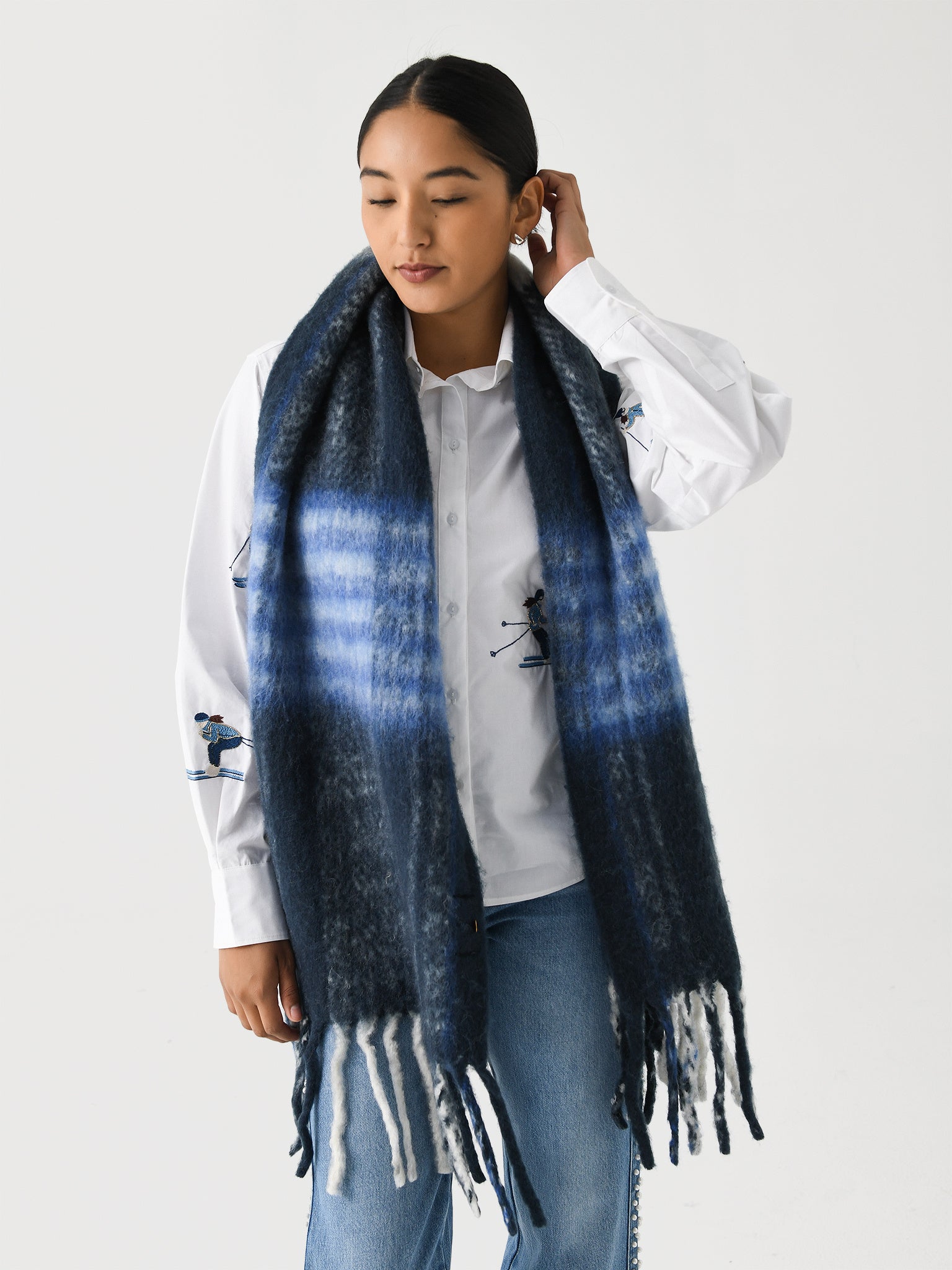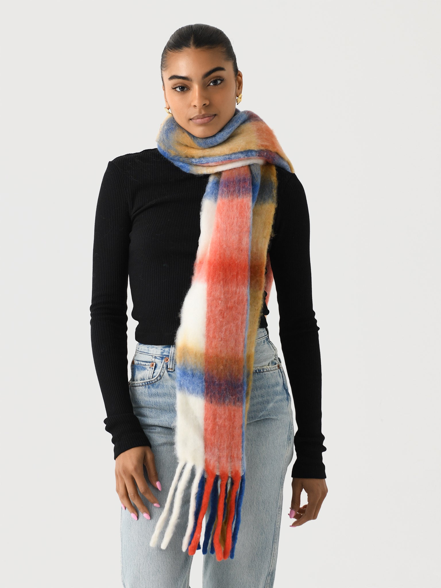 A multi-colored plaid scarf made from a wool blend brushed knit and finished with fringe trims.