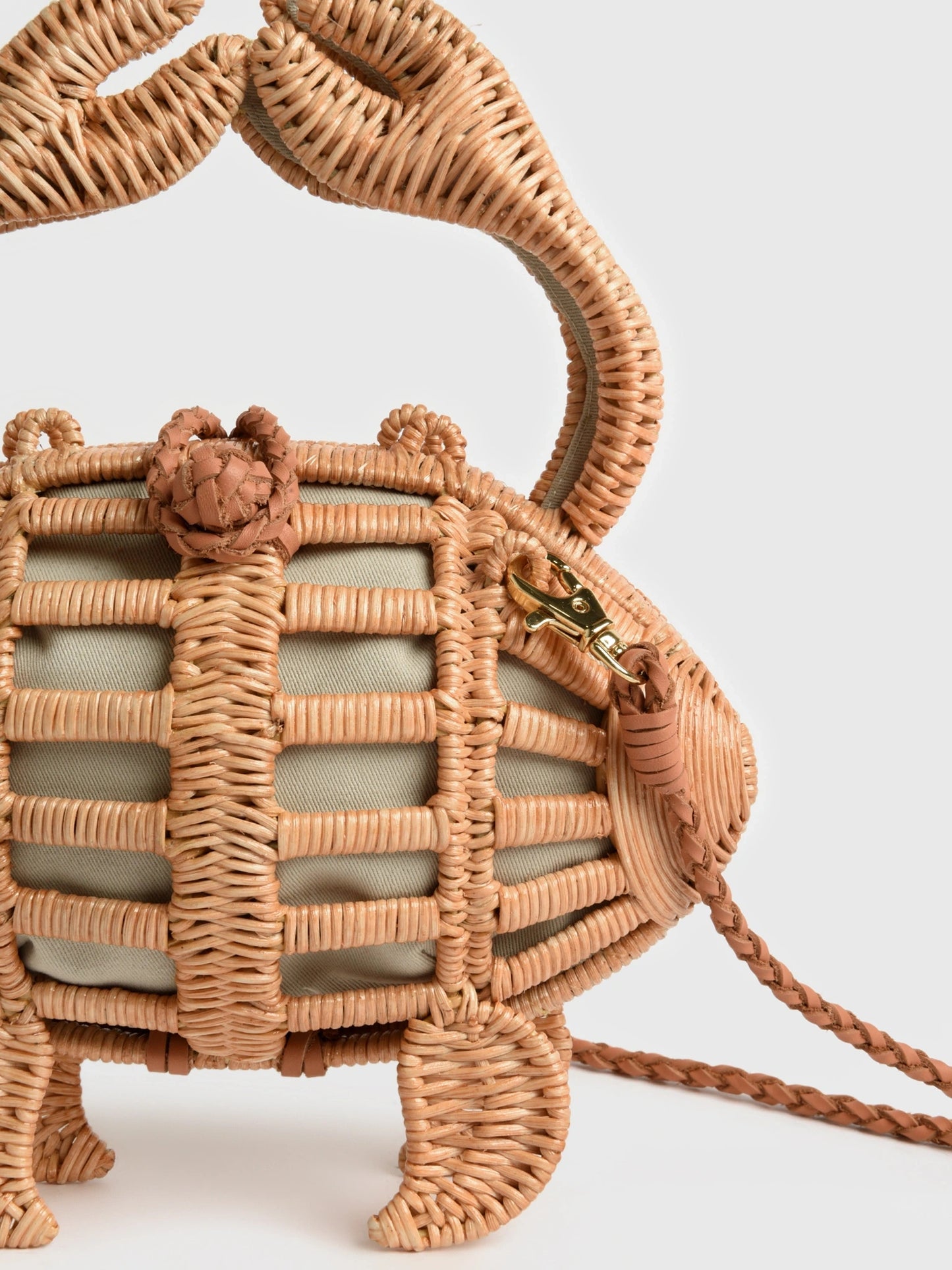 This whimsical handbag features a charming crab design made from lacquered wicker with a pouch lining and removable strap.