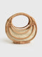 This stylish and unique mini bag features a distinctive curved shape constructed from natural rattan with a removable zipper pouch lining.