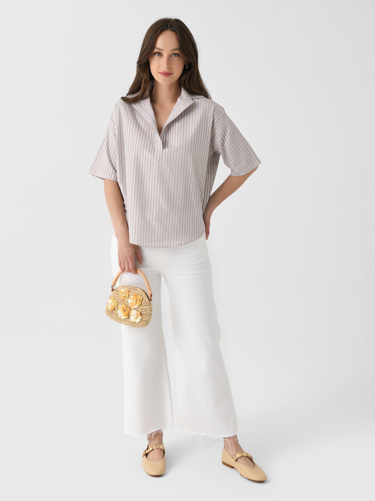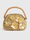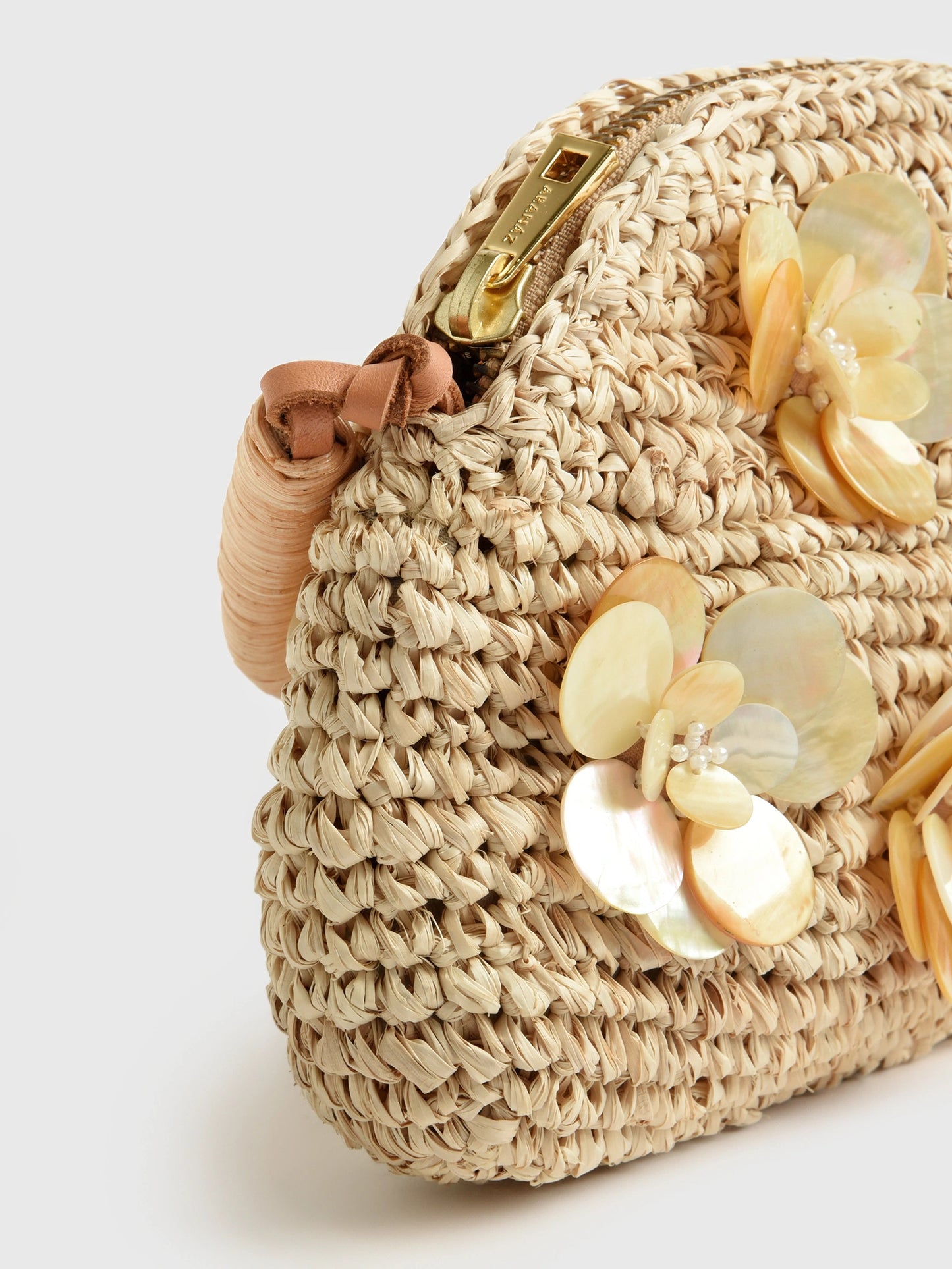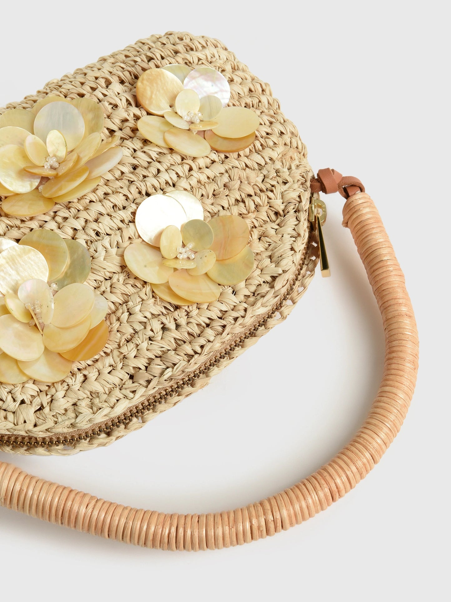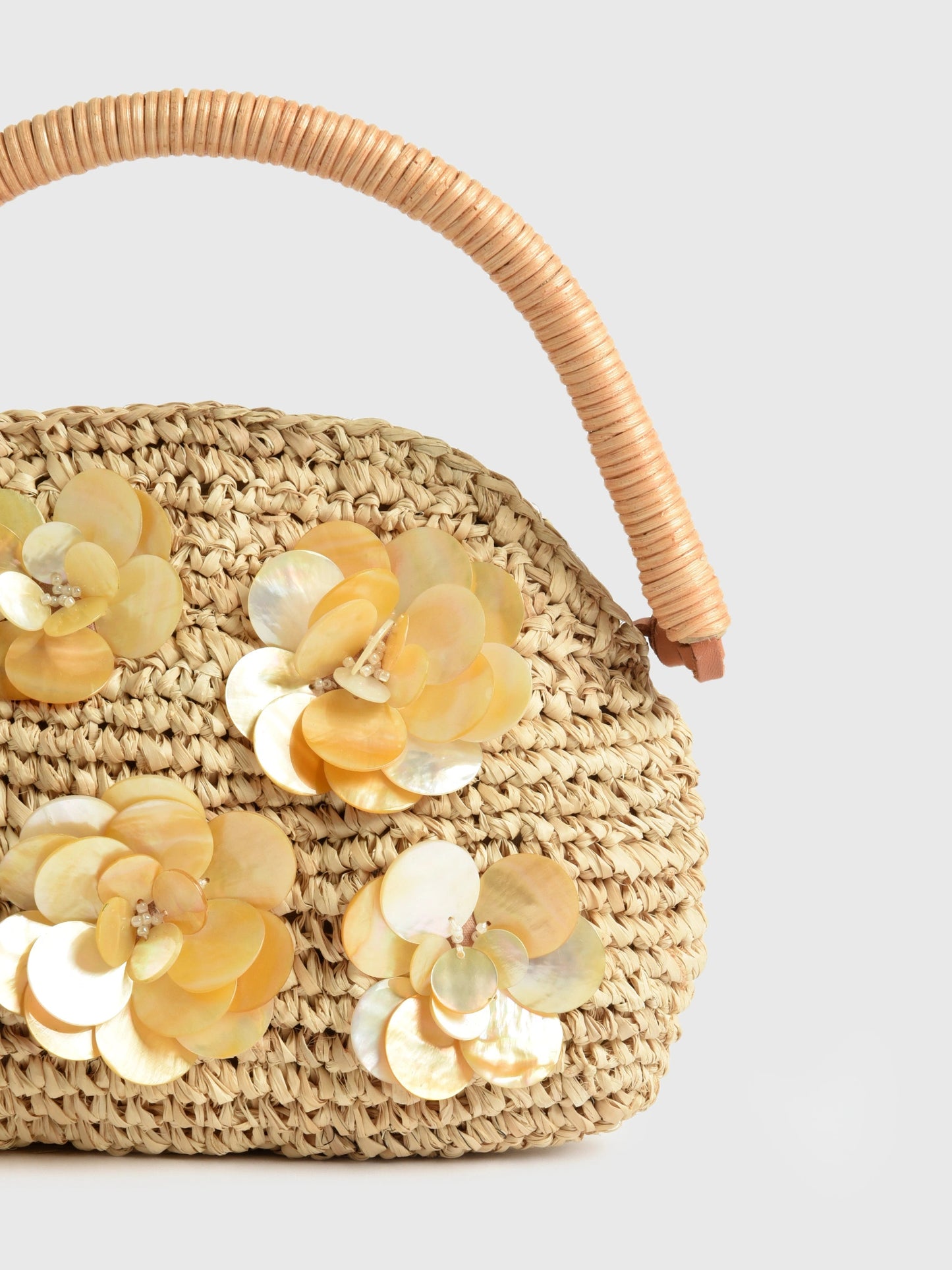 This charming handbag is crafted from natural raffia and features a rattan-wrapped handle and delicate floral shell embellishments.