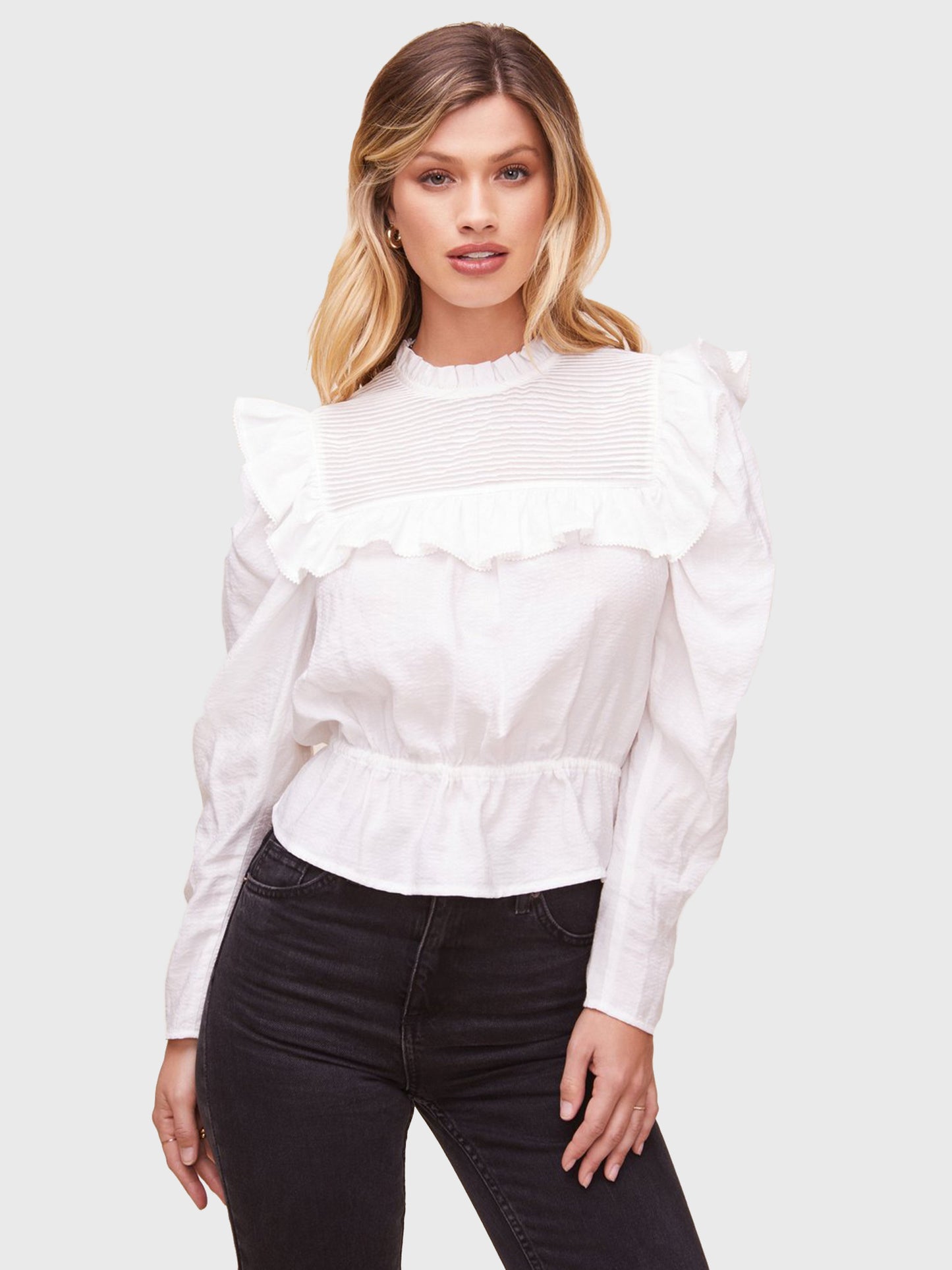 Add some prairie flair to your look with the Alcott Top. It features a high neckline that descends to a ruched yolk along with a dainty ruffle trim. Relaxed bodice leads to a smocked waist. Long sleeves. Keyhole back.