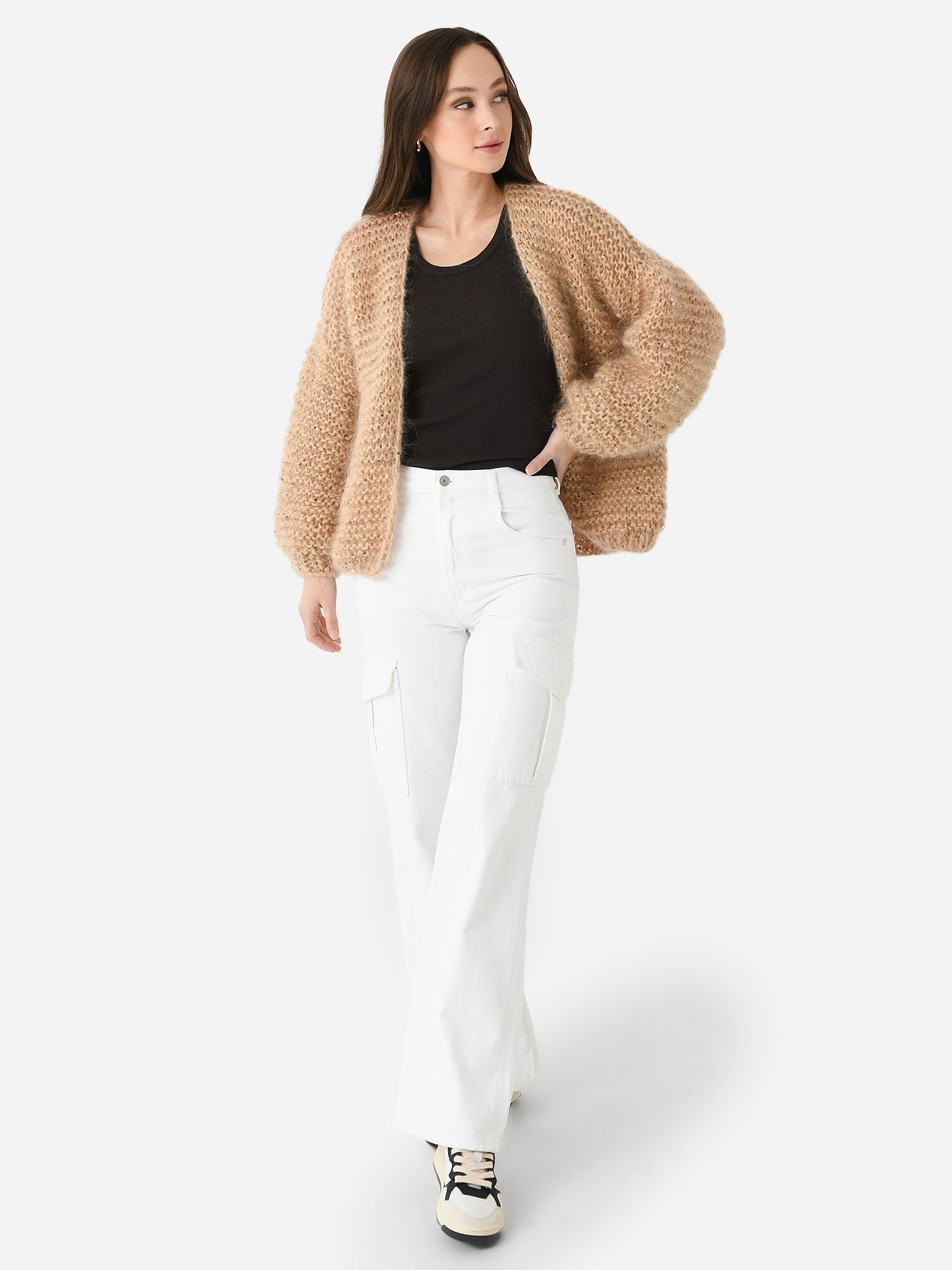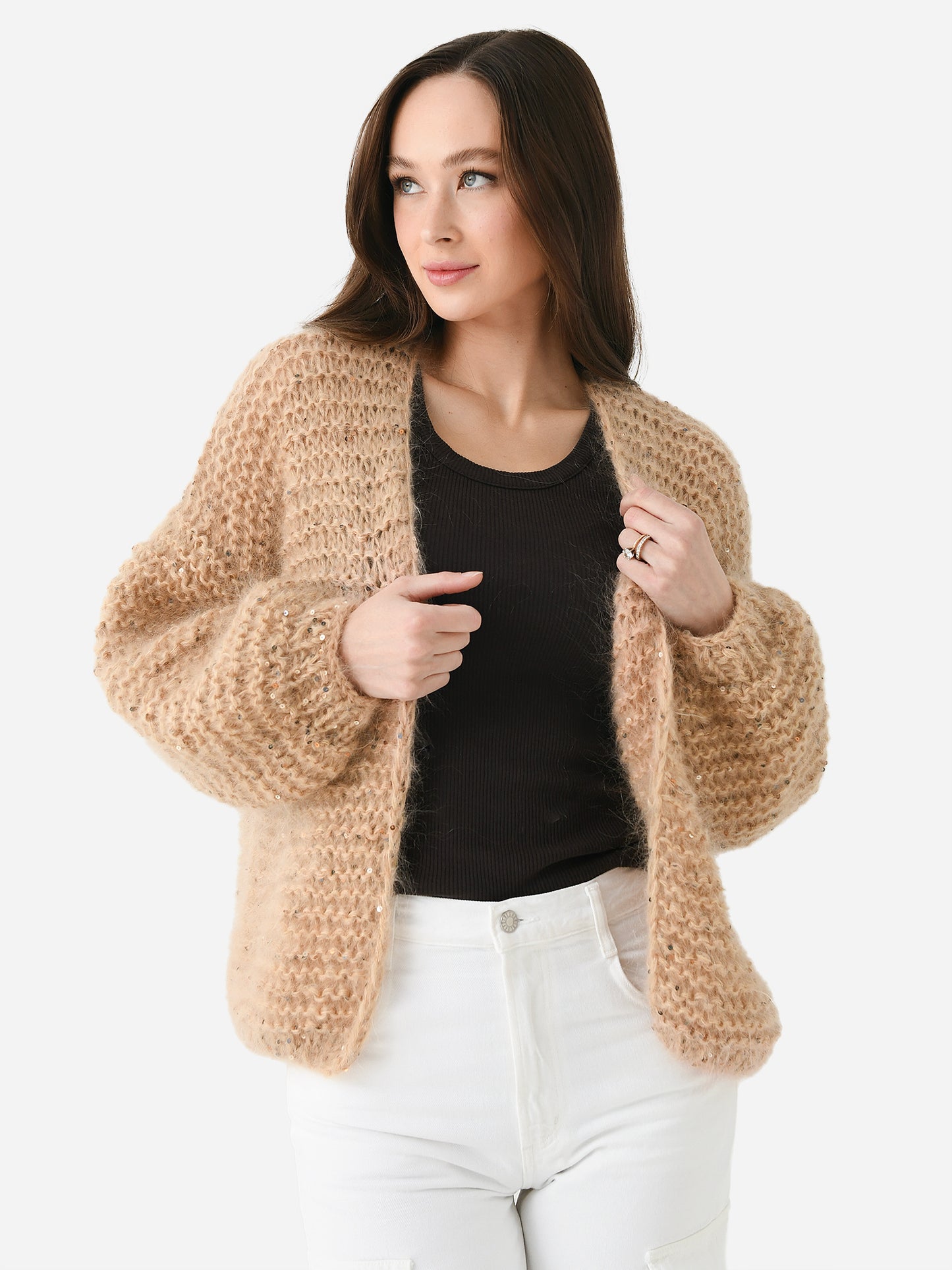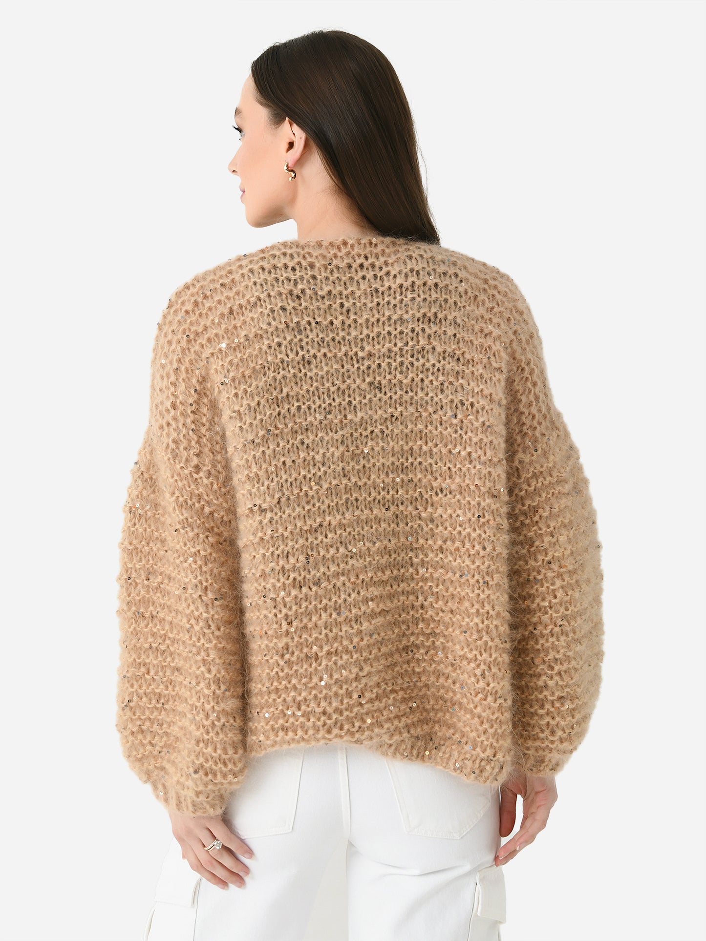 An open-front chunky knit cardigan with subtle sequin detailing.