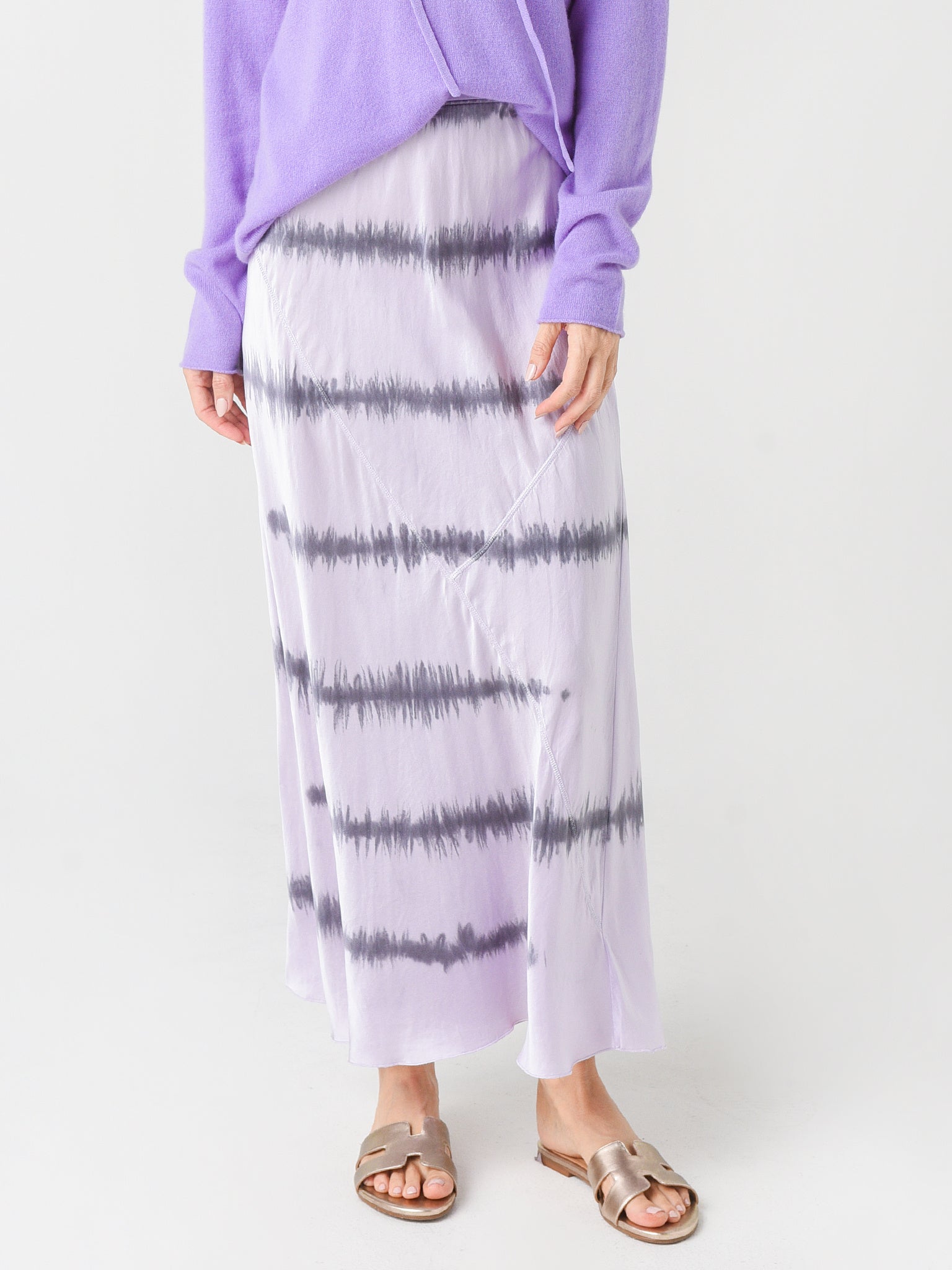Lightweight silk charmeuse maxi skirt with a broken stripe tie-dye print.
