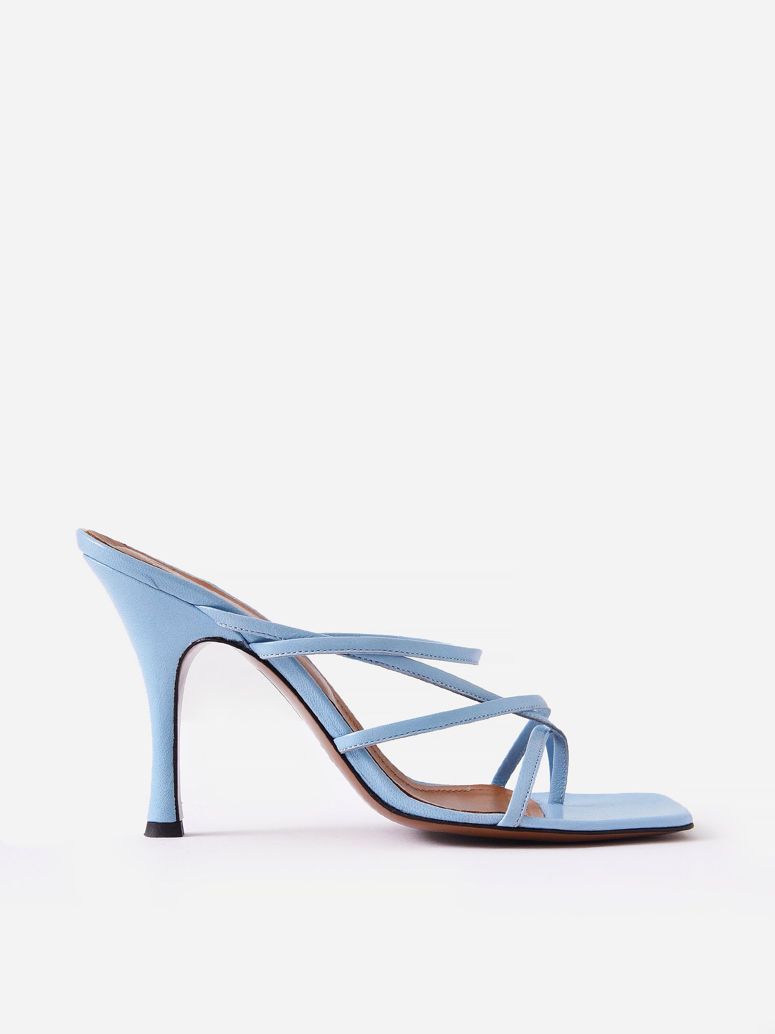 Strappy heeled sandal with a square toe.