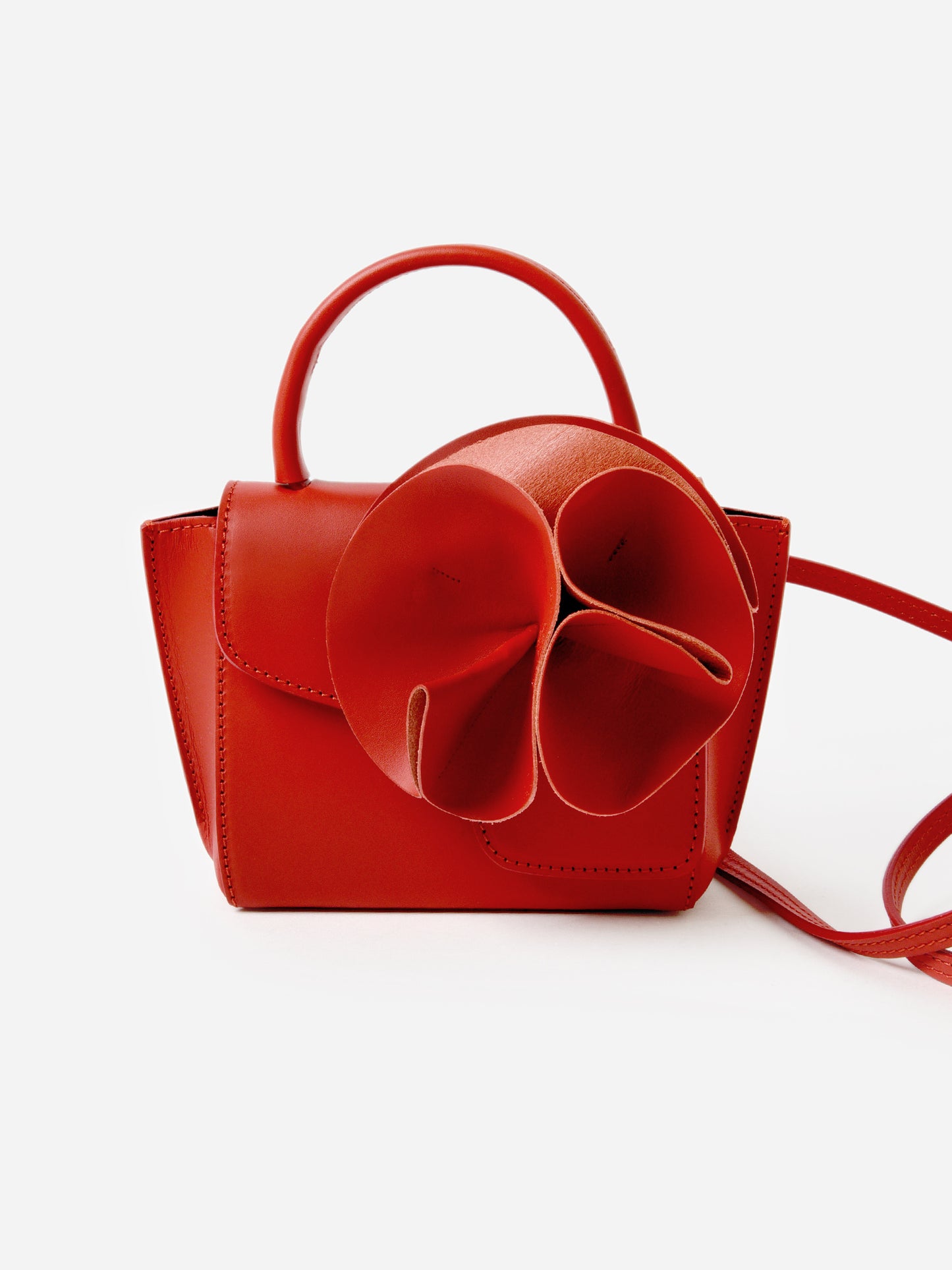 A handmade leather handbag featuring a rose detail and optional crossbody strap.