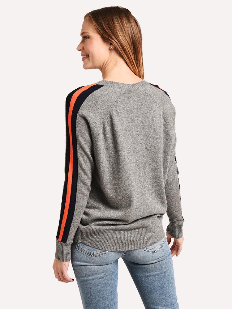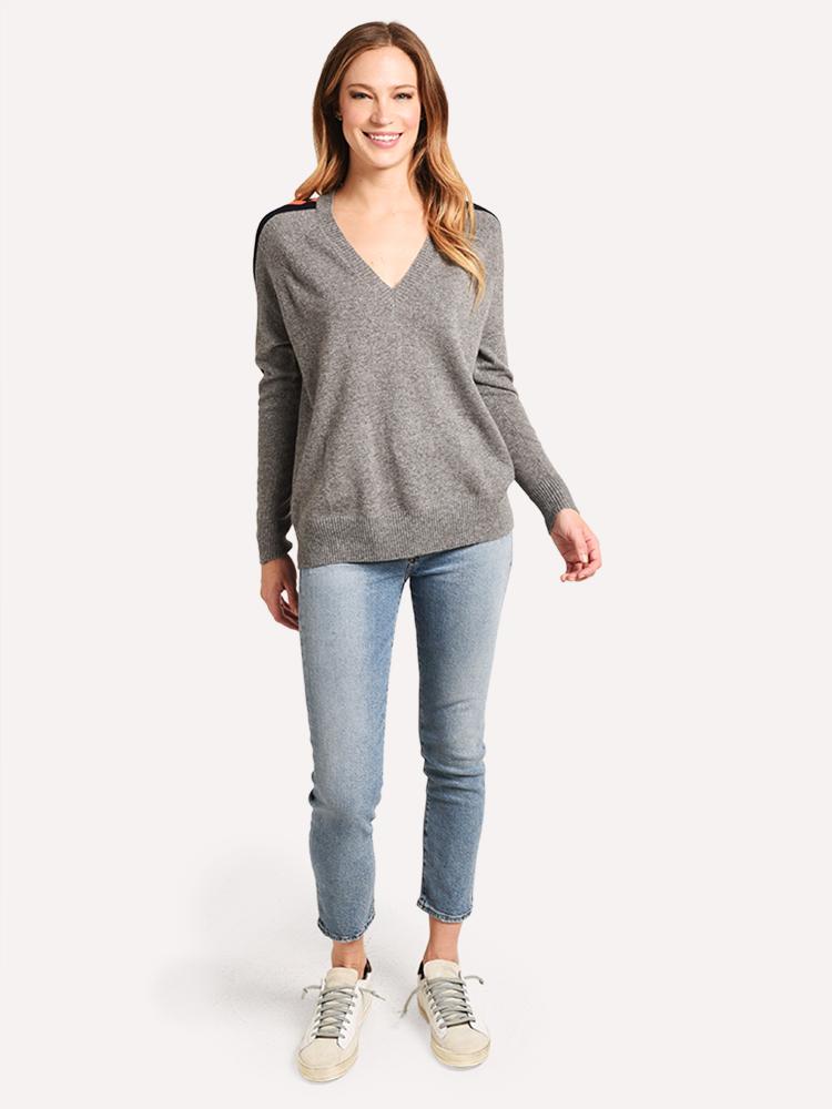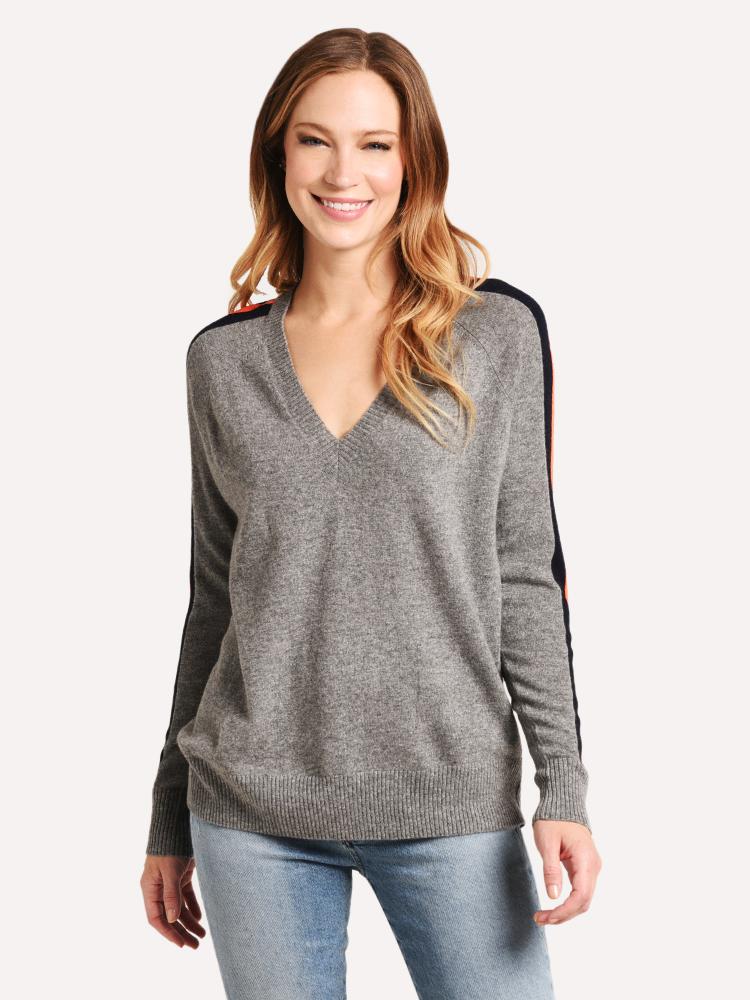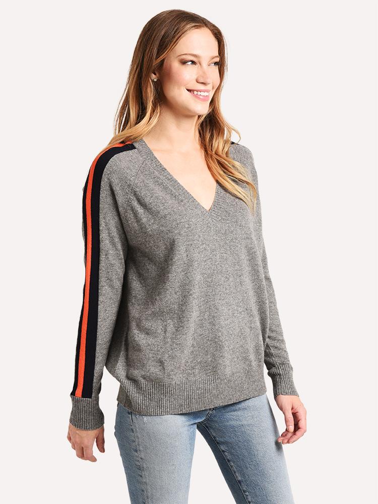 The Autumn Cashmere Tech Racing Stripe V Neck Sweater is ultra soft and cozy.
