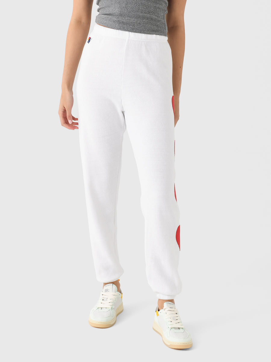 This ultra-soft sweatpant is made from tri-blend fleece and features stitched heart graphics.