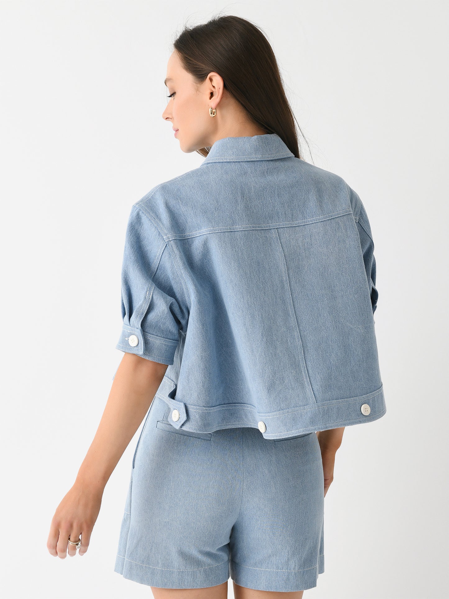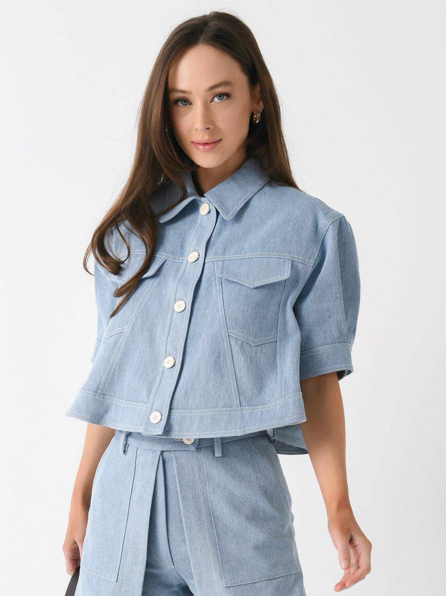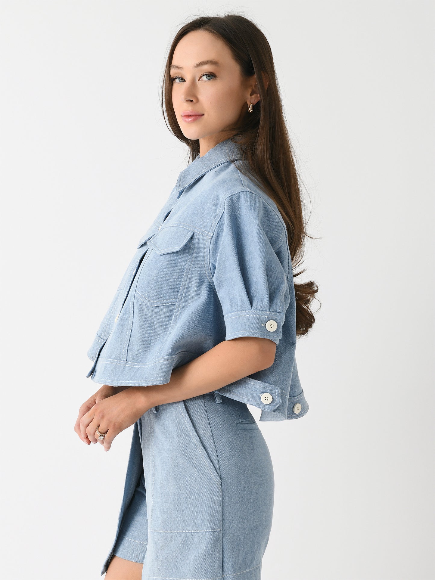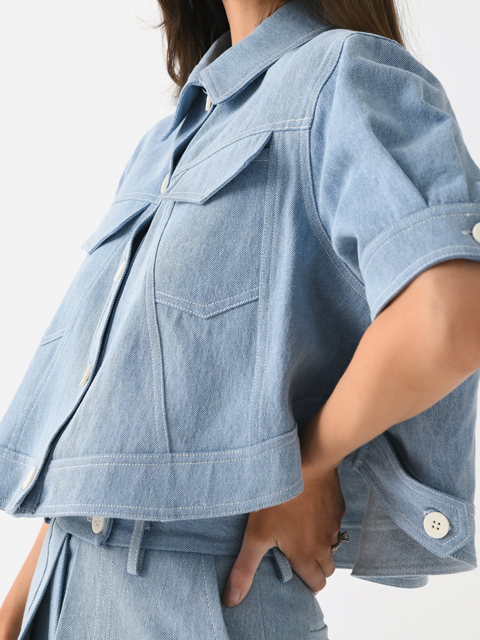 A lightweight cotton button-down jacket with a boxy silhouette.