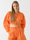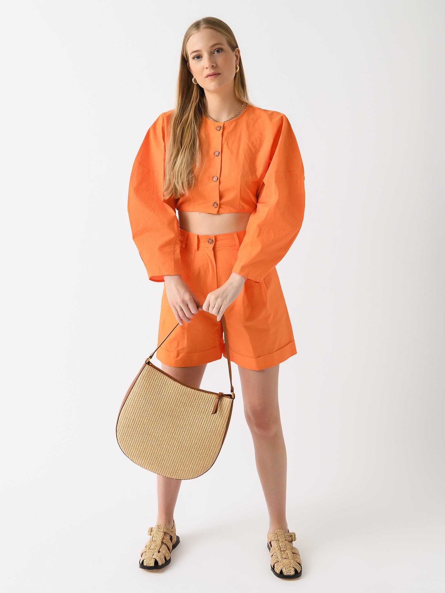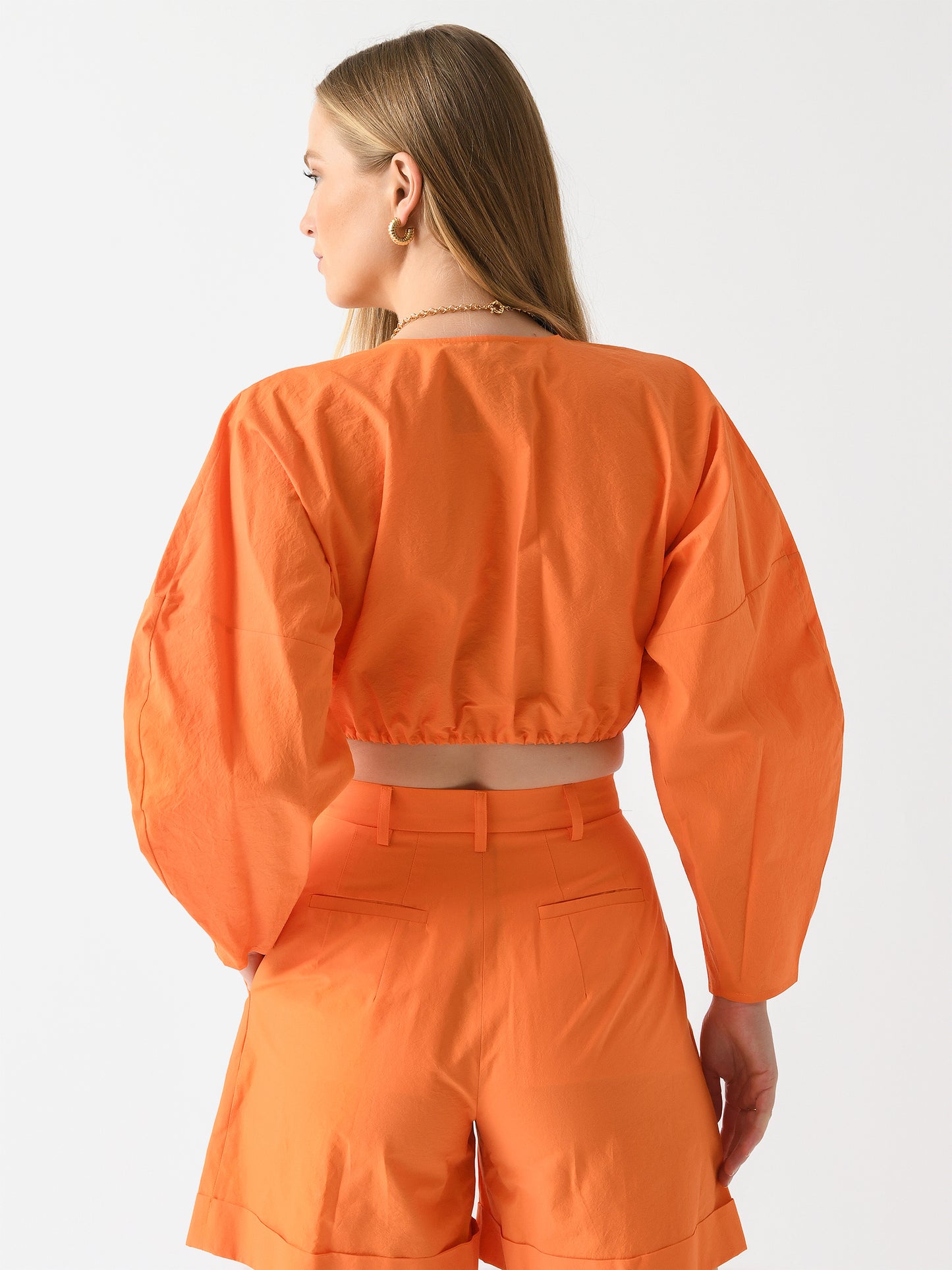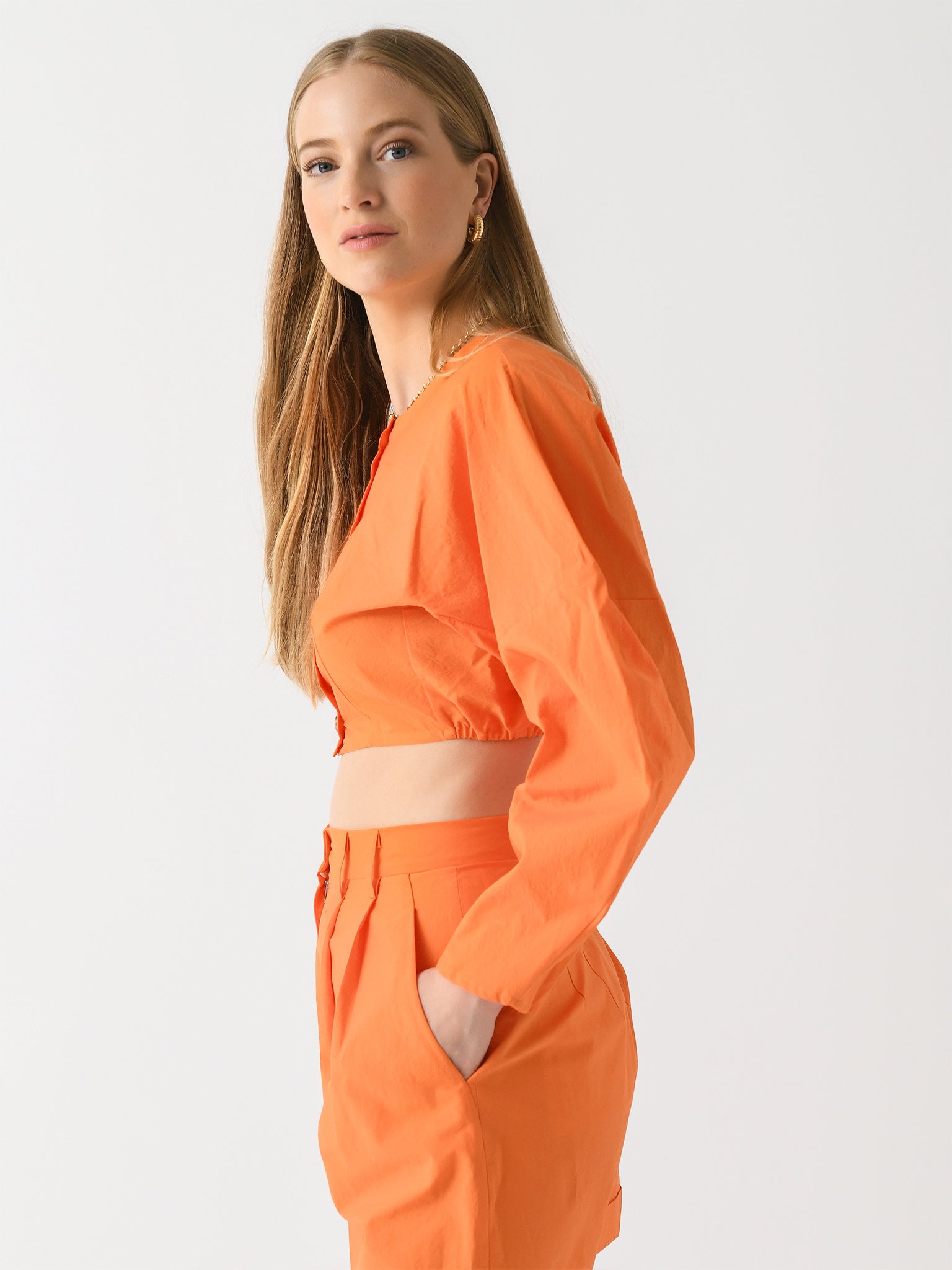 A button-down blouse designed in a cropped silhouette with an elastic hem.