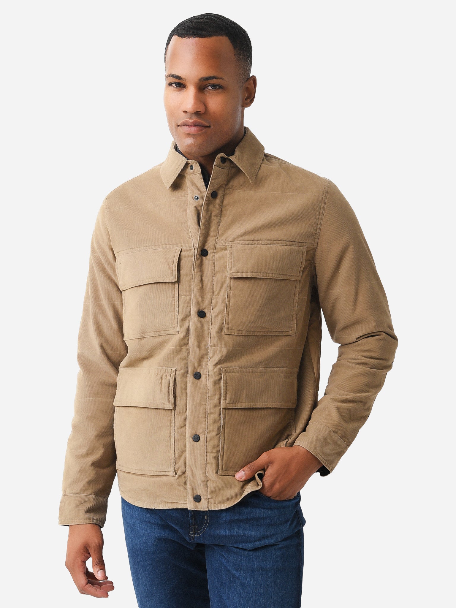 Corduroy shirt jacket with a quilted nylon back.