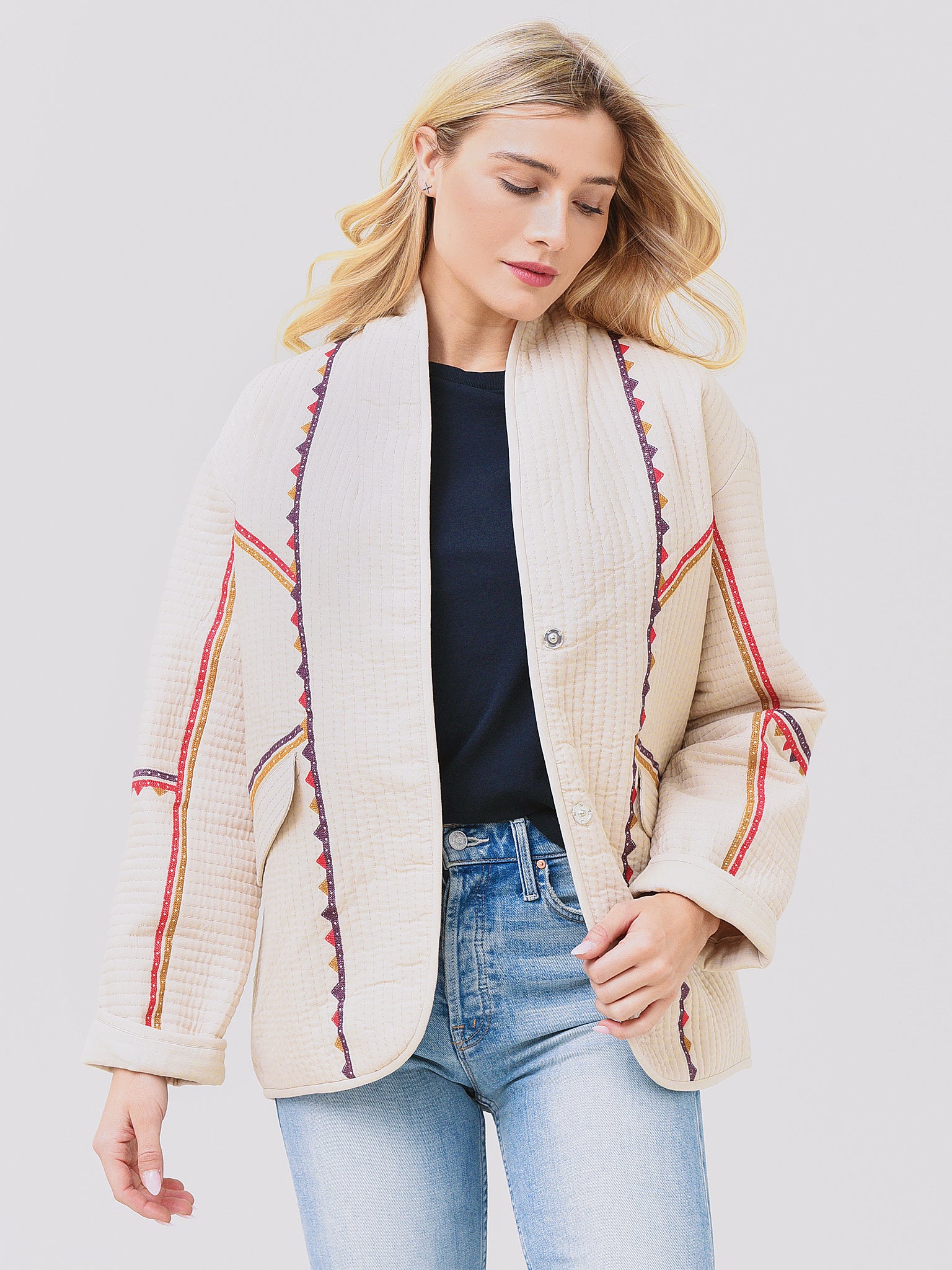Long sleeve jacket with quilted stitching and a button-down placket.