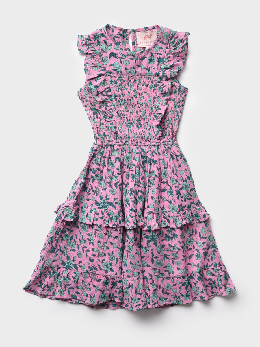 Sleeveless Dress Crew Neckline Keyhole, Button Closure at Back Sleeveless Ruffle Details Smocked Bodice All-Over Floral Print Tiered Skirt Styling 100% Cotton