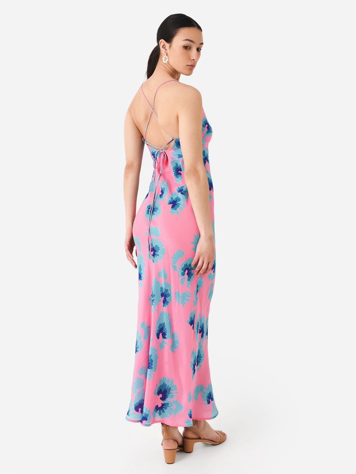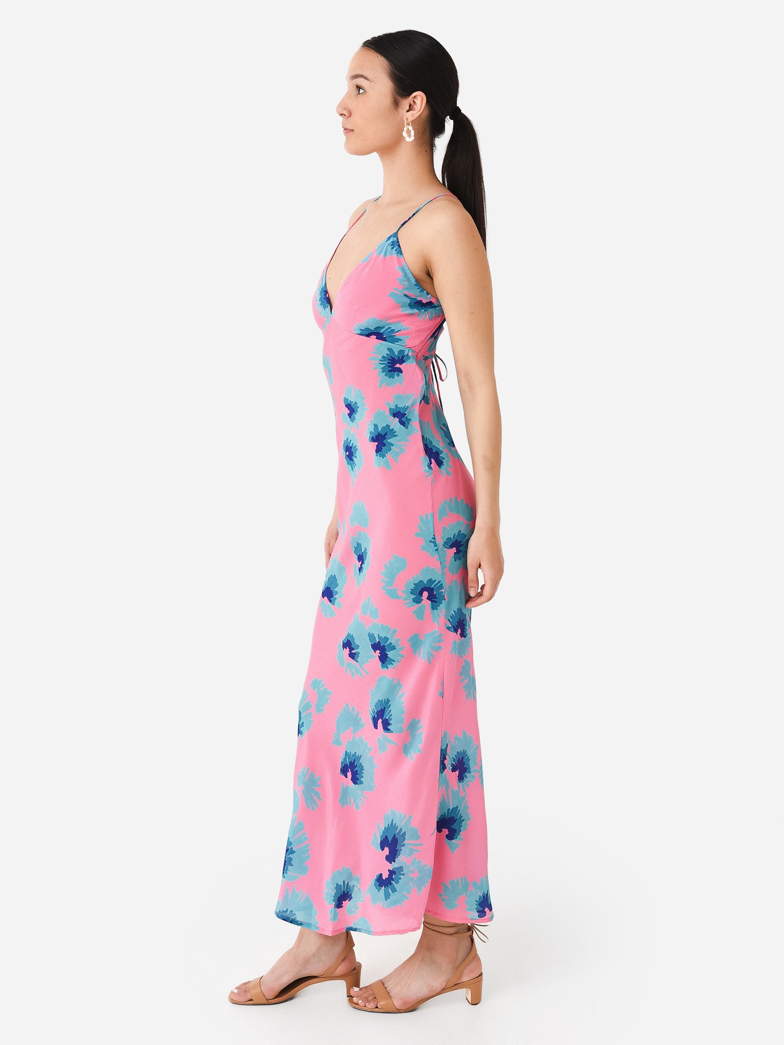Silk crepe dress with a deep v-neckline, self-tie back, and bold floral print.